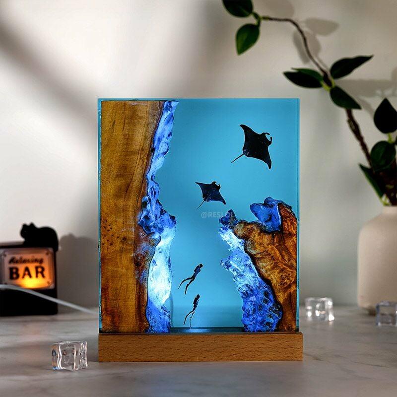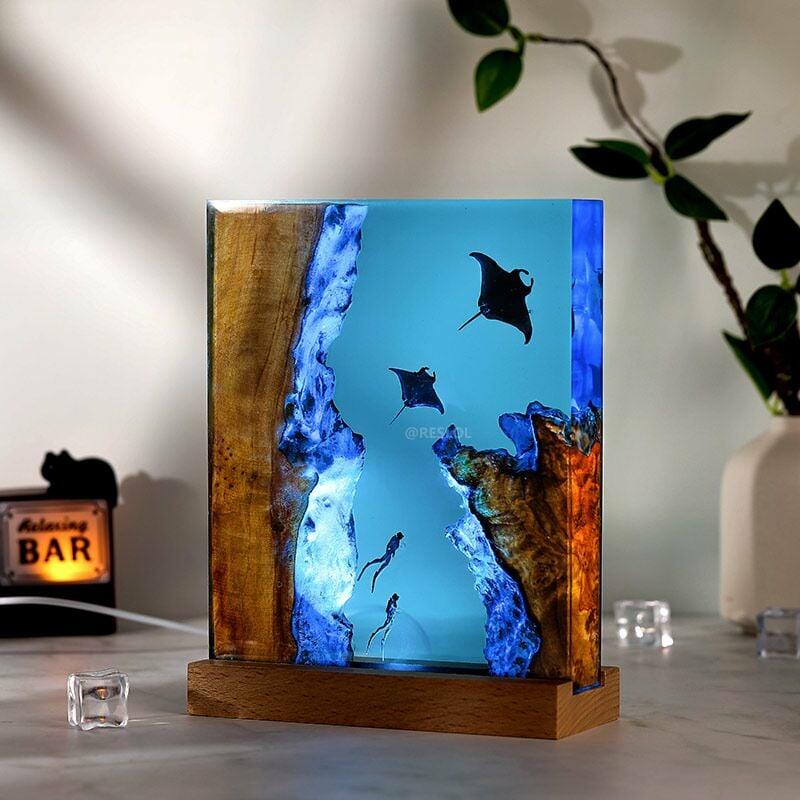 Handmade Resin Table Lamp – Bring the ocean’s magic into your home with this stunning square resin lamp, featuring a lifelike manta ray and diver suspended in artistic detail. Perfect as a bedside night light, desk decor, or coastal-themed room accent, this lamp casts a soothing glow for a serene ambiance.