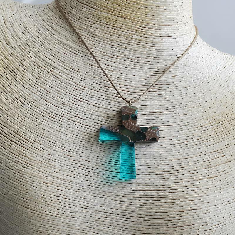 This necklace features a captivating cross design crafted from a combination of rustic wood and blue resin. The blend of these materials gives it a warm, earthy feel with a pop of vibrant blue, creating a truly eye-catching piece.