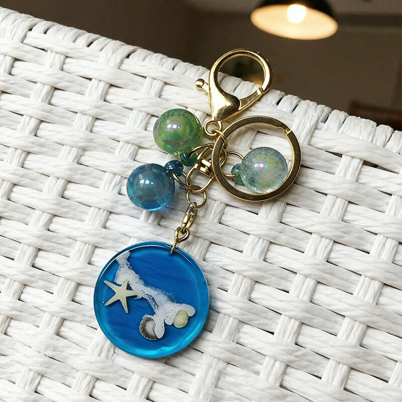 Adorable Round Starfish & Shell Keychain, Handmade Beach-Themed Resin Keychain