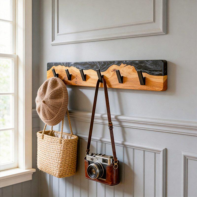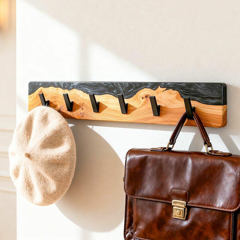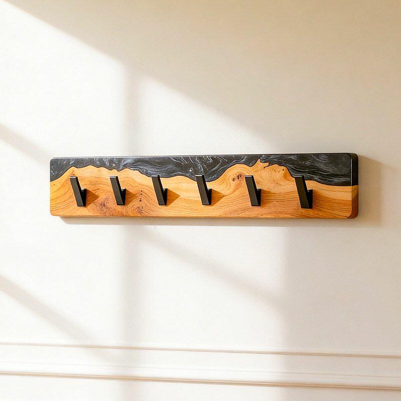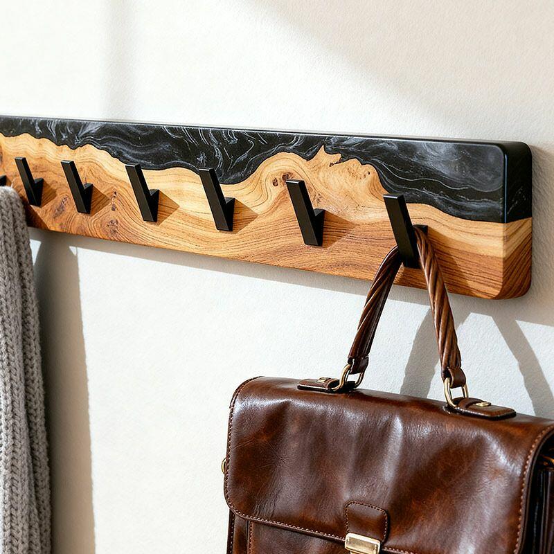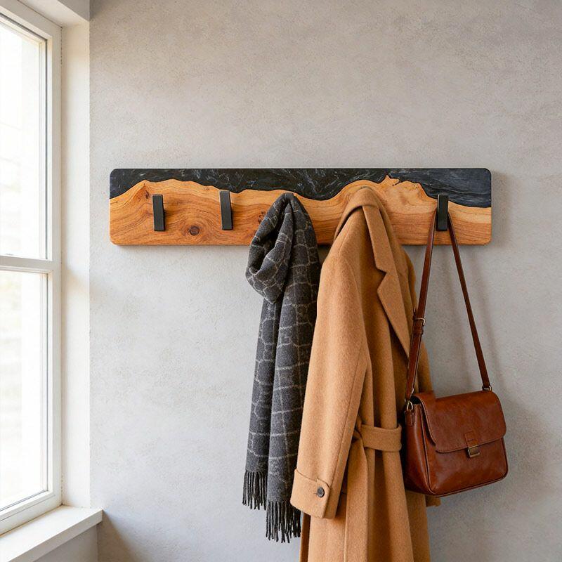 Reslol’s Black Resin River Wood Coat Rack blends natural craftsmanship with modern utility. Handcrafted from solid wood, its live edge preserves organic grain, while glossy black epoxy resin flows through the wood like a "resin river"—creating a striking contrast between warm timber and sleek darkness, merging rustic charm with contemporary style.