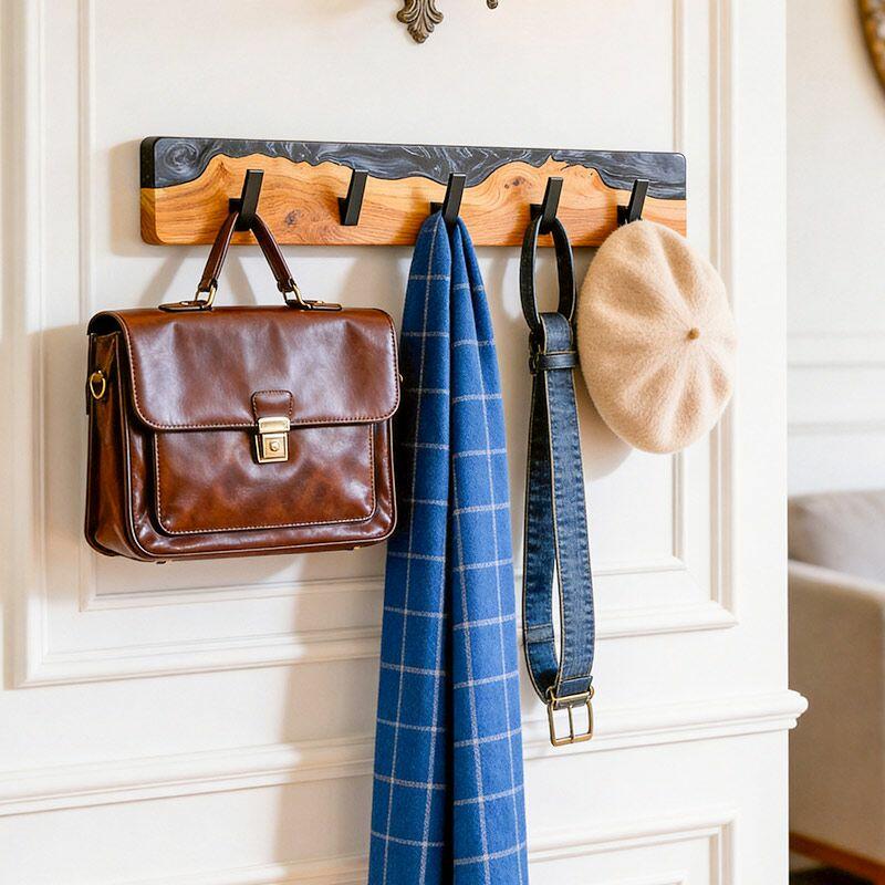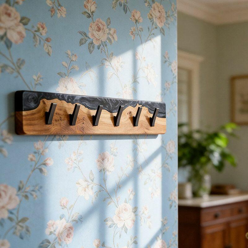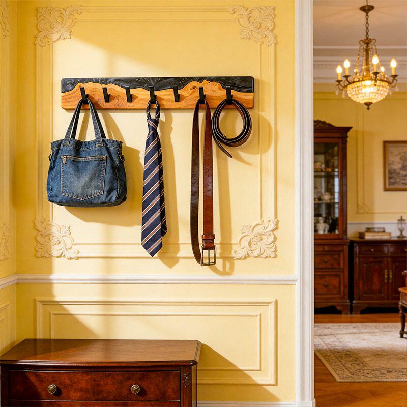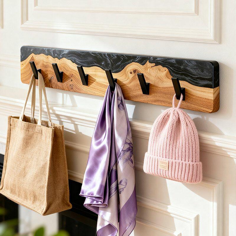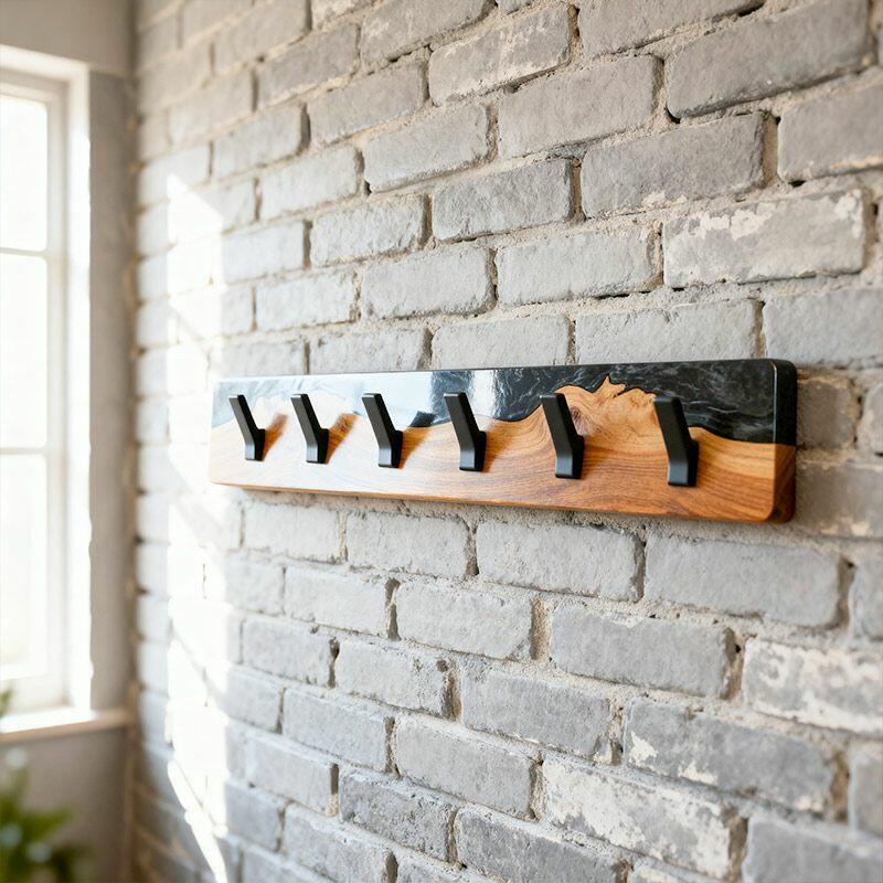Reslol’s Black Resin River Wood Coat Rack blends natural craftsmanship with modern utility. Handcrafted from solid wood, its live edge preserves organic grain, while glossy black epoxy resin flows through the wood like a "resin river"—creating a striking contrast between warm timber and sleek darkness, merging rustic charm with contemporary style.