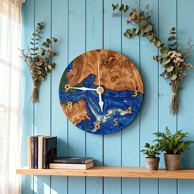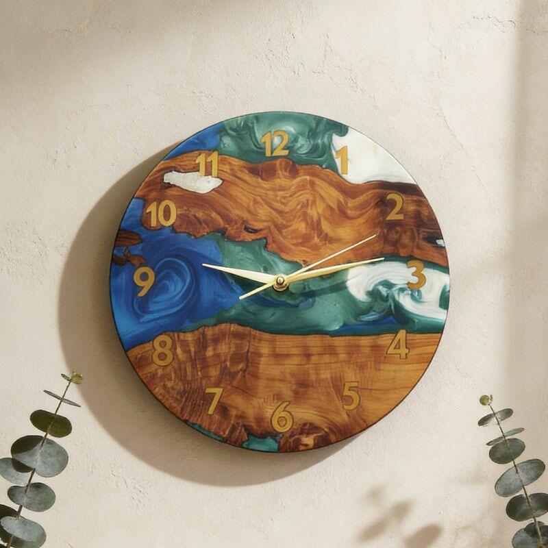 Elevate your space with Reslol’s Artisanal Blue-Green Swirled Resin & Wood Wall Clock—a fusion of nature and craftsmanship. Handcrafted by skilled artisans, this clock marries smooth, swirled blue-green resin with warm, natural wood, creating a dynamic contrast of color and texture. The resin’s fluid, ocean-like waves blend seamlessly with the wood’s organic grain, adding a touch of bohemian elegance to any room.