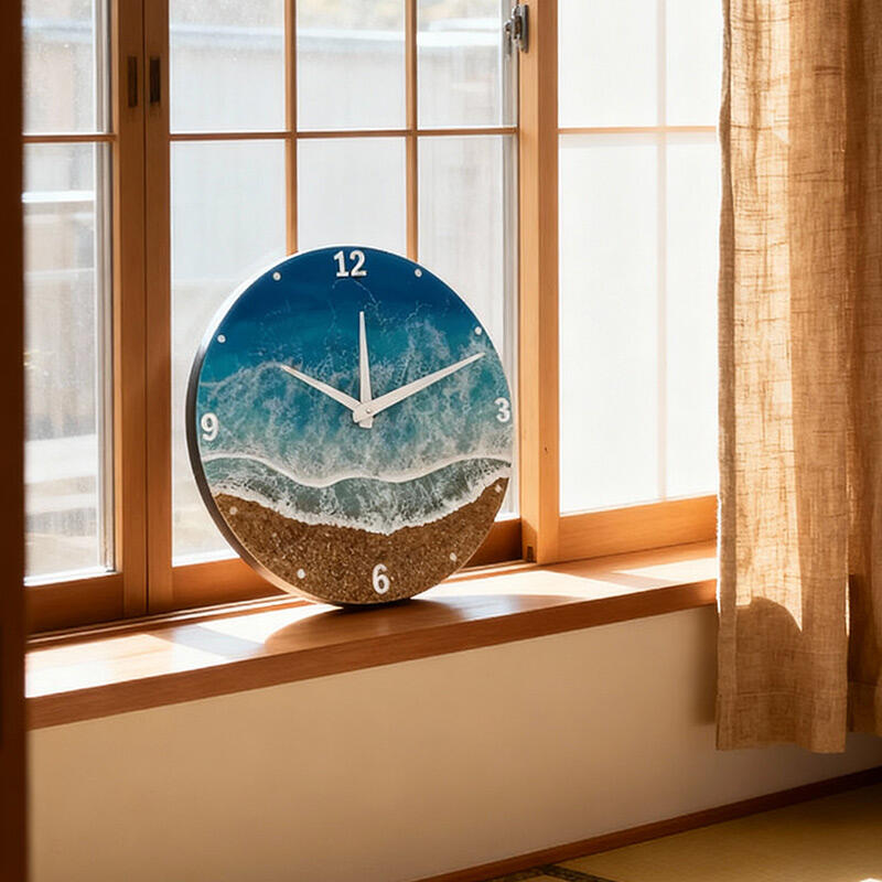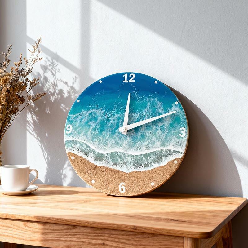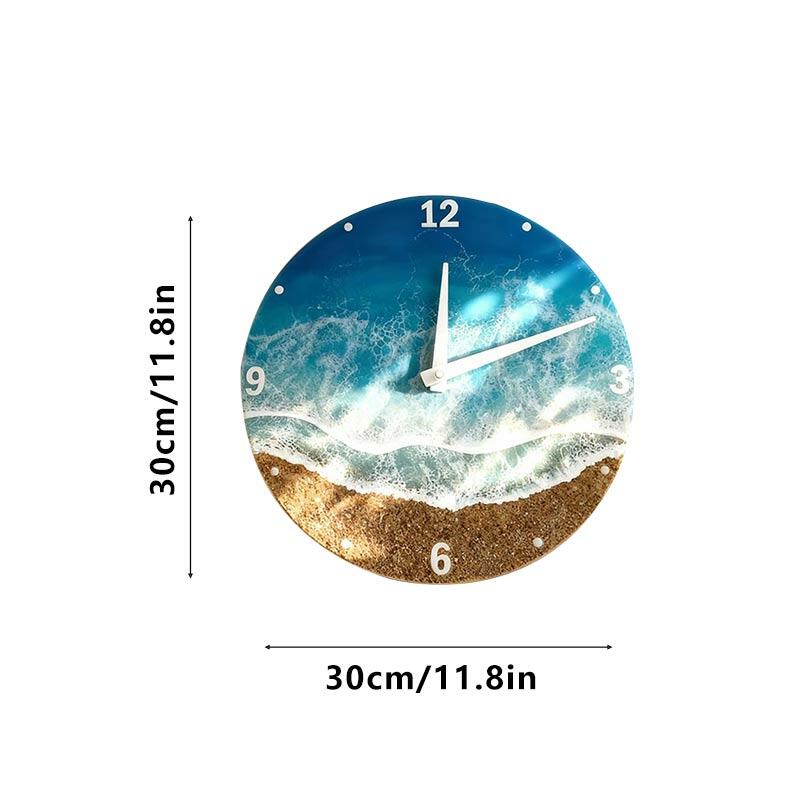 Elevate your space with the Reslol Artisanal Coastal Resin Clock, a masterpiece blending eco-friendly resin and reclaimed wood, inspired by the calming allure of ocean waves and sandy shores. This handcrafted timepiece captures the serene beauty of coastal landscapes, making it a perfect addition to your home decor or a thoughtful gift for those who love the ocean.