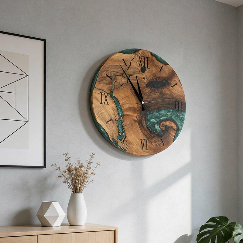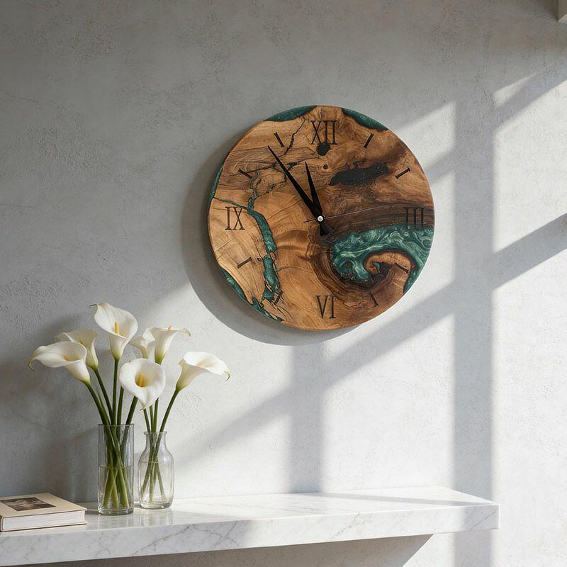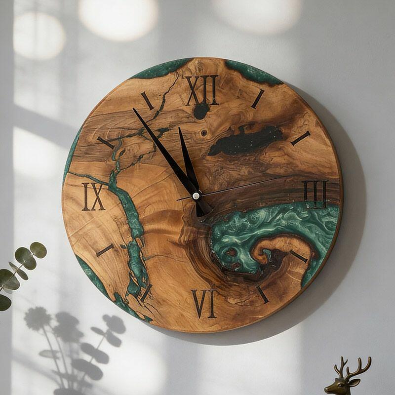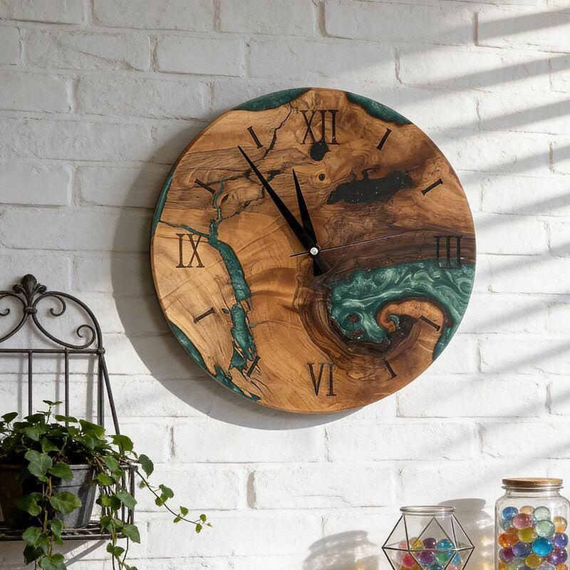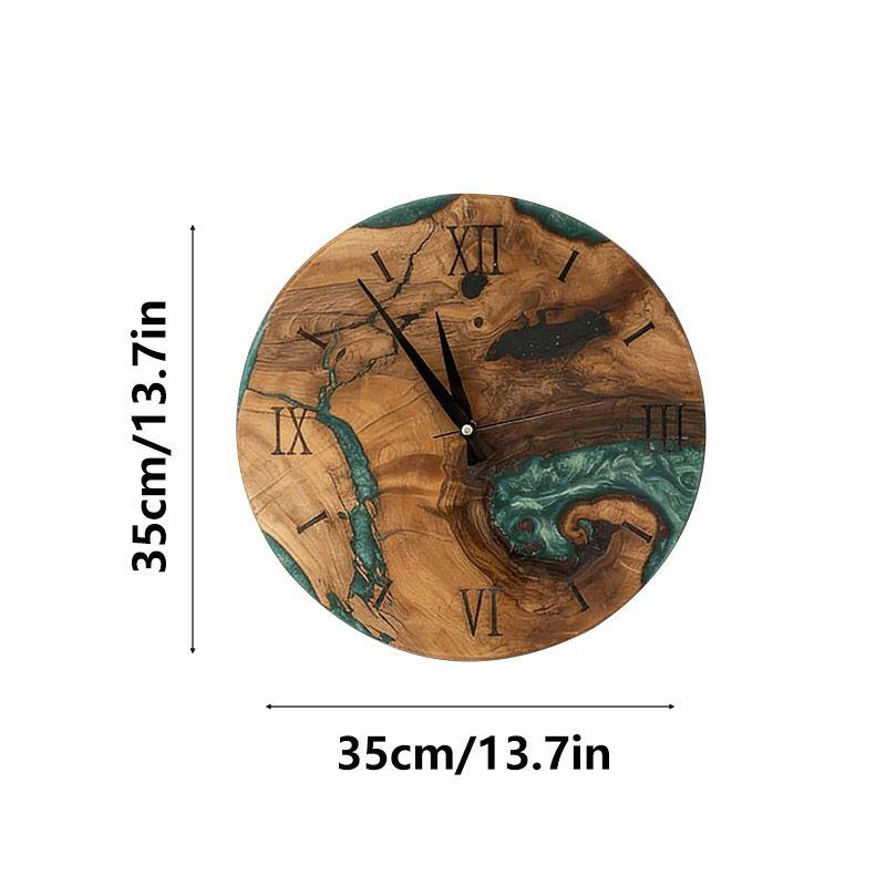 Embrace the artisanal spirit with Reslol’s Green Epoxy Resin & Wood Wall Clock, a stunning fusion of natural wood and vibrant green epoxy. This round clock blends rustic warmth with modern minimalism, making it a captivating focal point for any home.