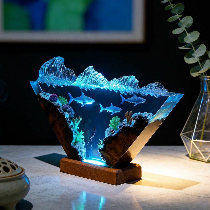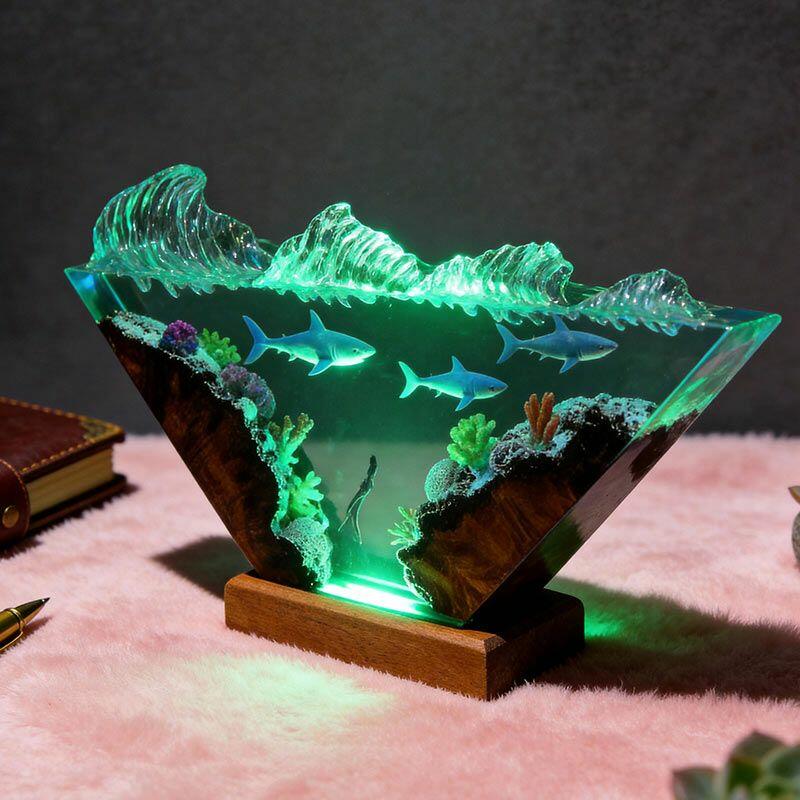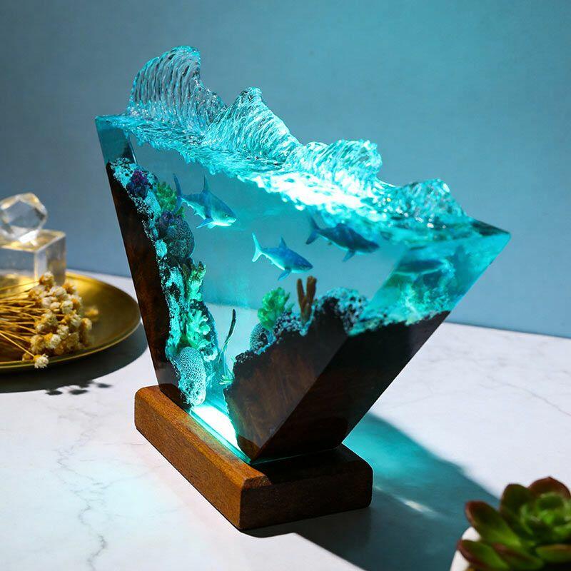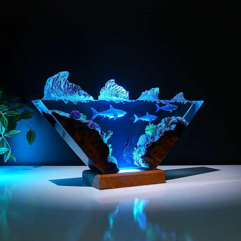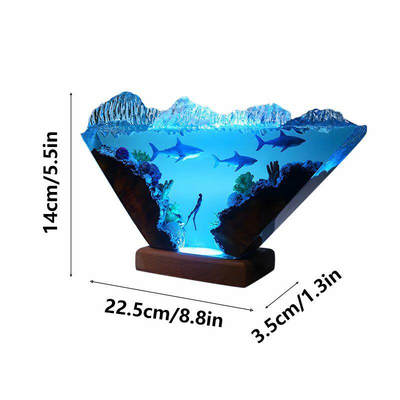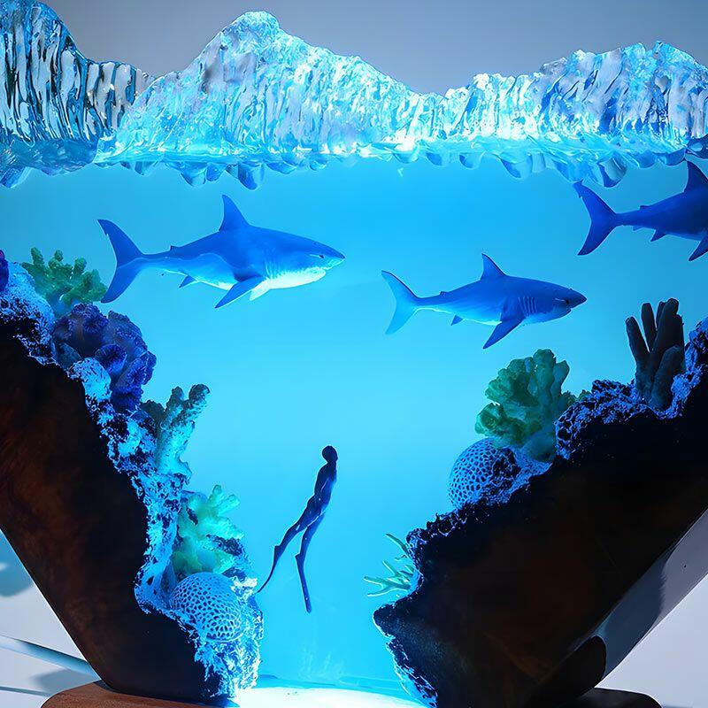 Dive into the depths of ocean-inspired artistry with Reslol’s Ocean Series Resin Lamp, a stunning blend of natural wood and clear resin. This handcrafted piece captures the dynamic scene of a diver alongside three white sharks, bringing the mystery and beauty of the sea into your home.