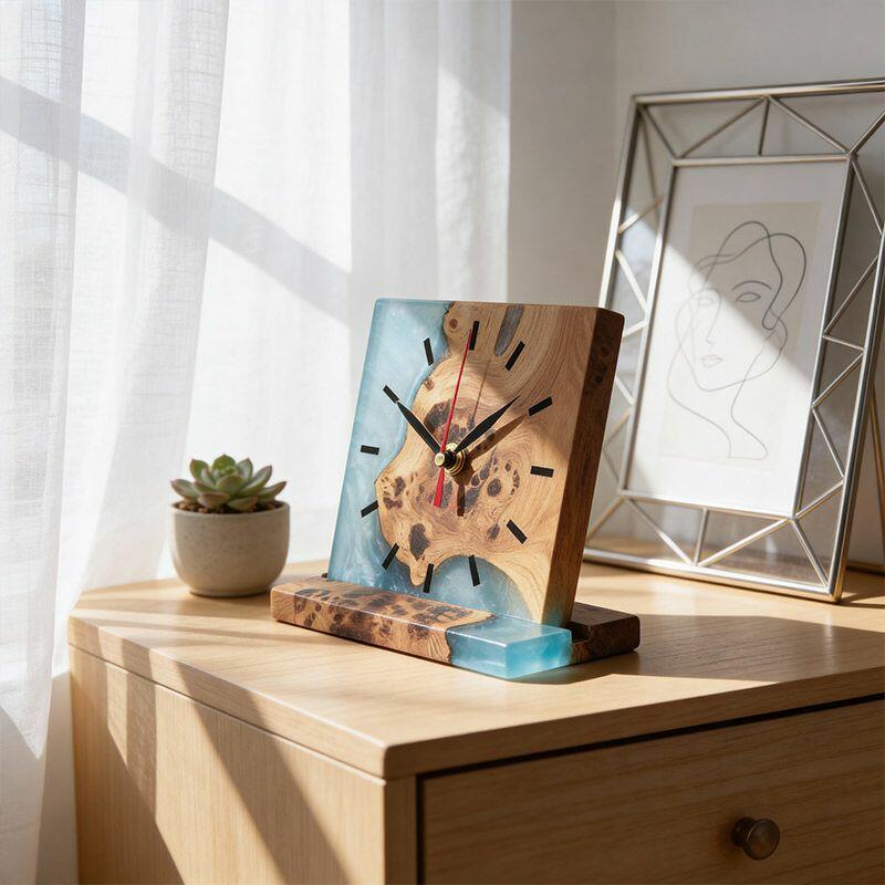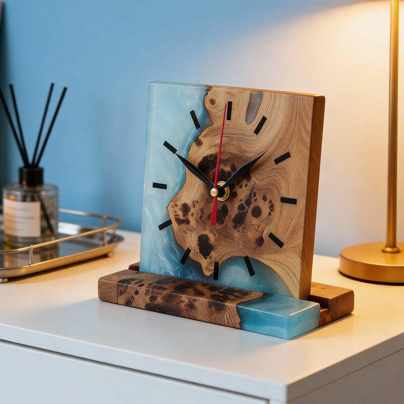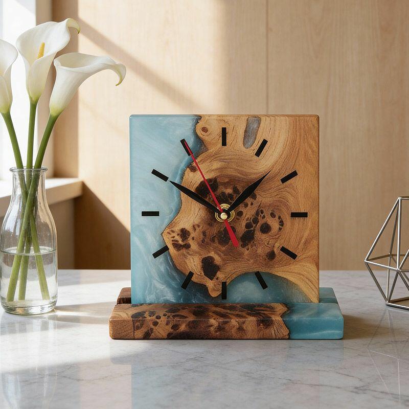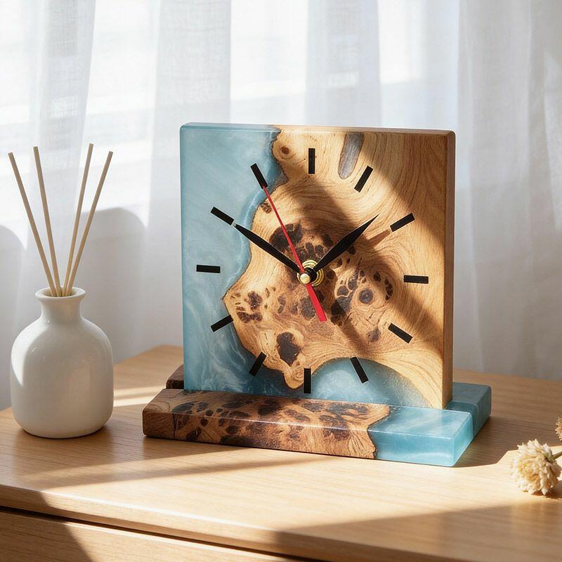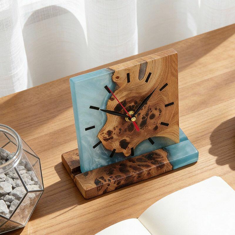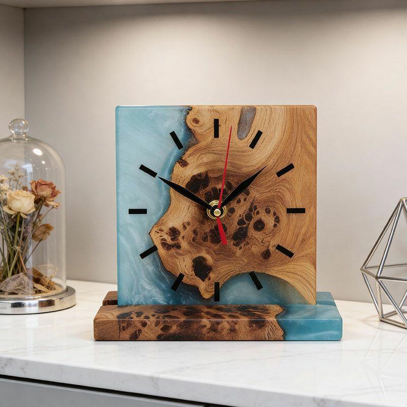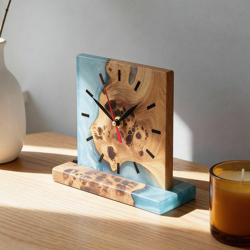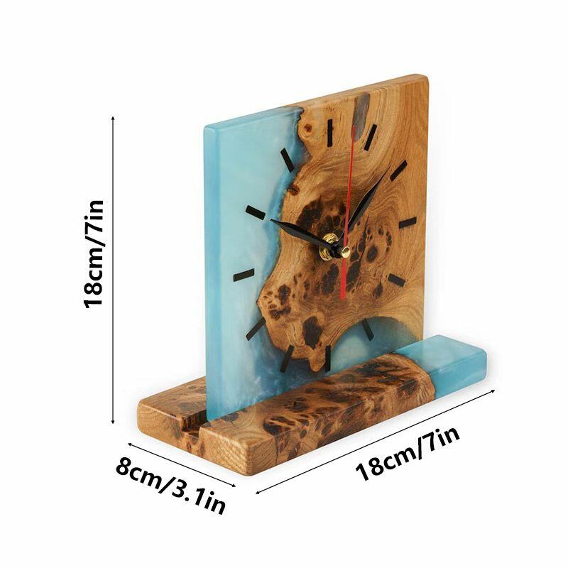 Introducing the Reslol Artisanal Resin Wood Square Table Clock, a harmonious blend of eco-crafted resin and reclaimed wood, embodying true craftsmanship. This square desktop timepiece marries modern design with natural textures, making it a striking addition to any home or office decor.