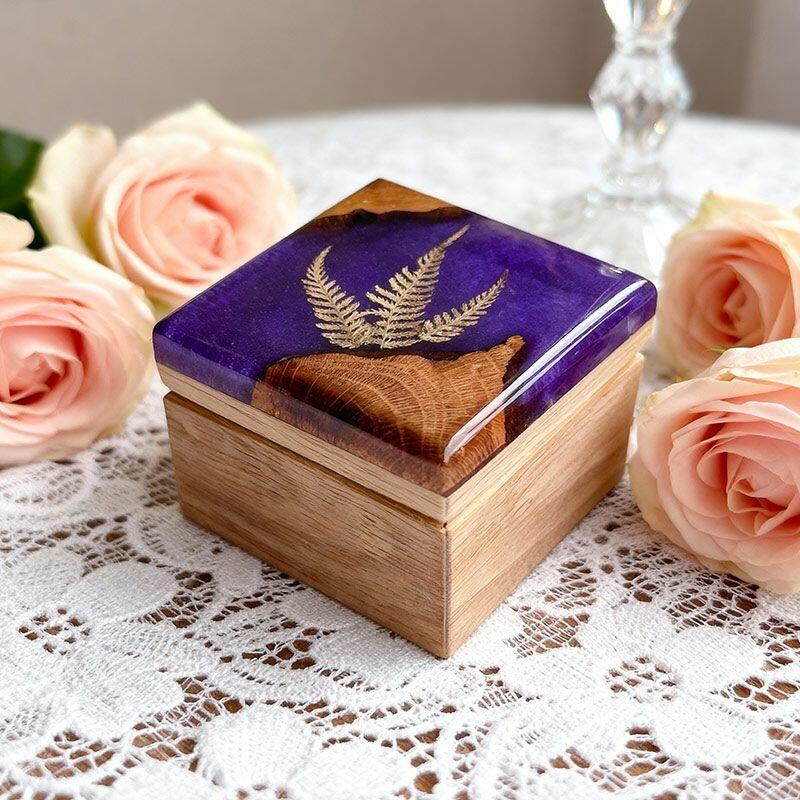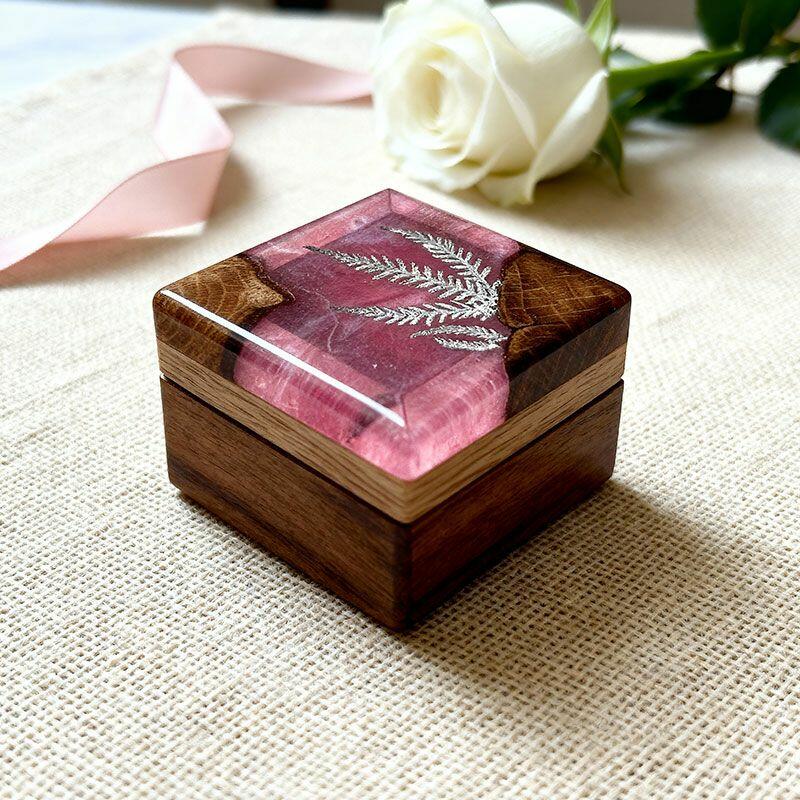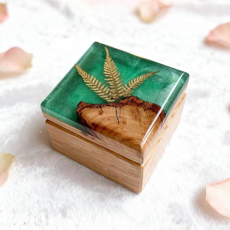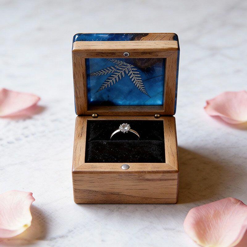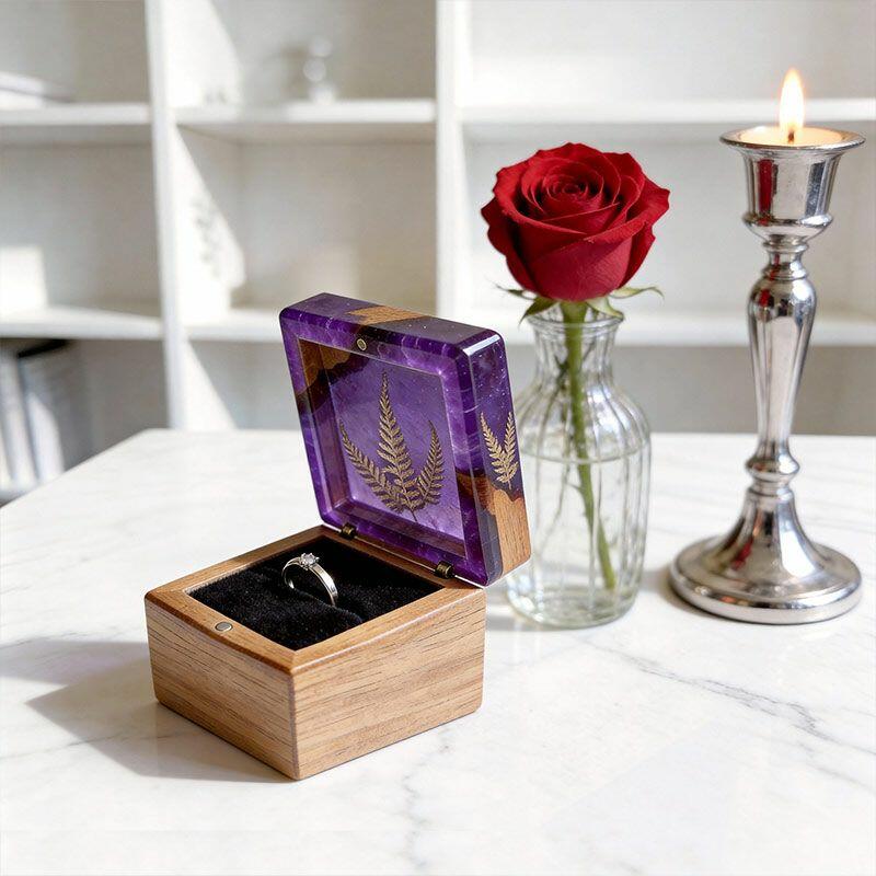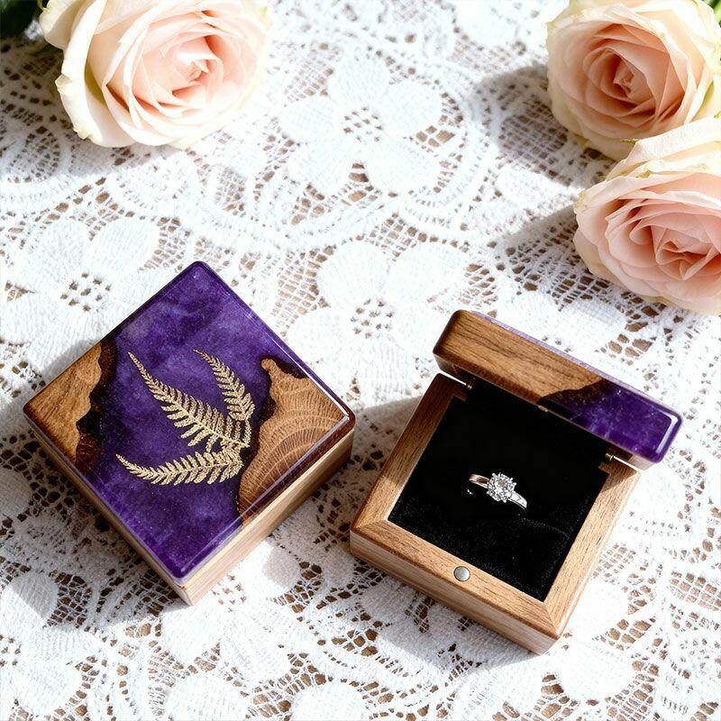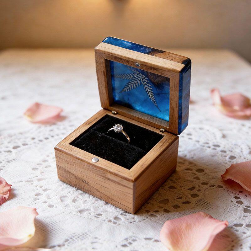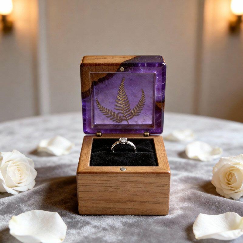 Botanical Artisan Reslol Fern-Embedded Resin & Wood Square Ring Box - Unique Engagement Keepsake