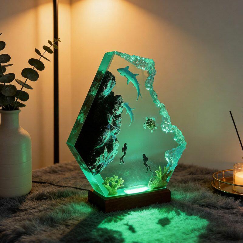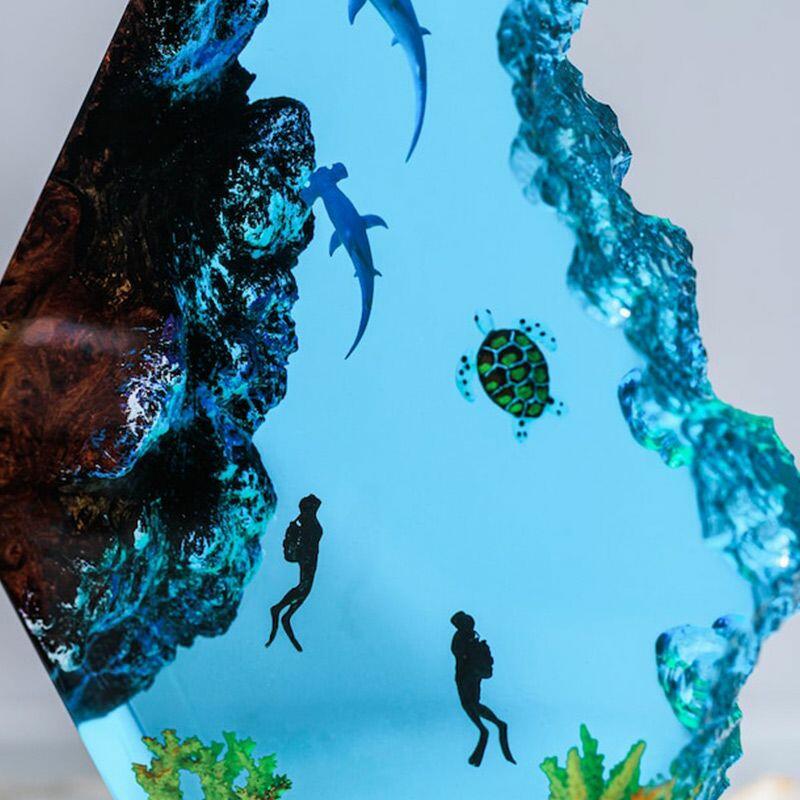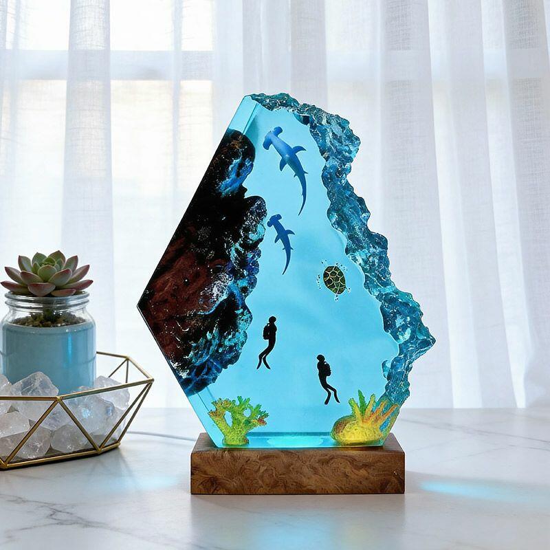Crafted with meticulous attention to detail, the lamp blends eco-friendly epoxy resin and sustainably sourced wood, embodying Reslol’s commitment to environmental responsibility and artisanal craftsmanship. The warm, soft glow illuminates the underwater tableau, making it a stunning decorative accent for bedrooms, living rooms, or offices.