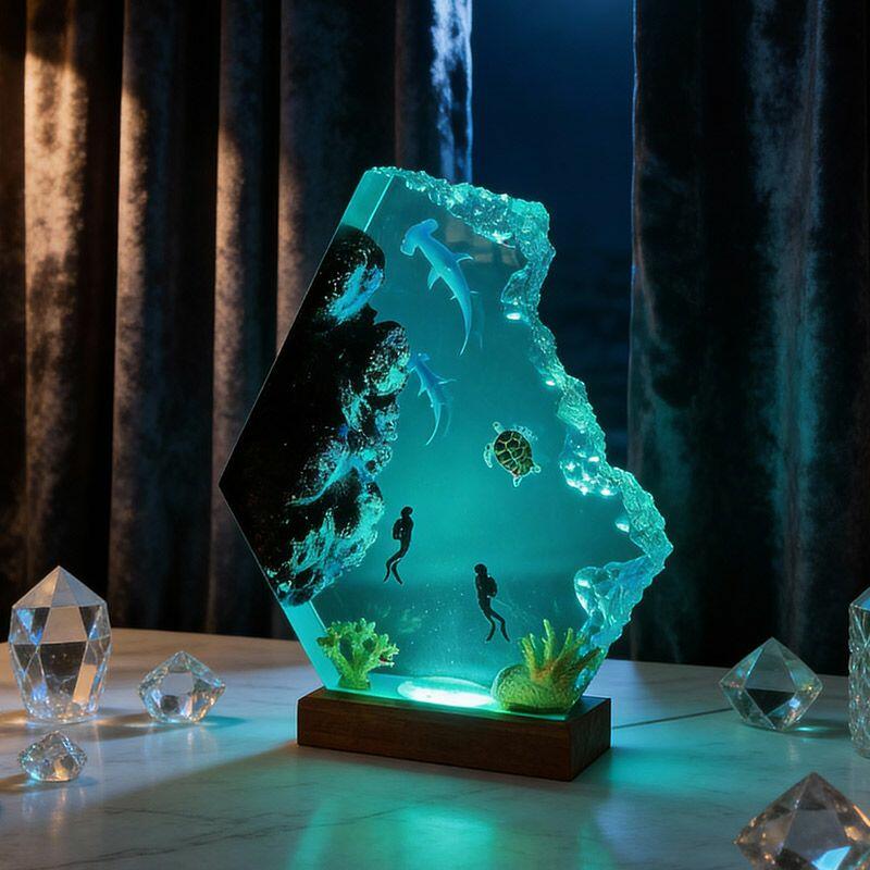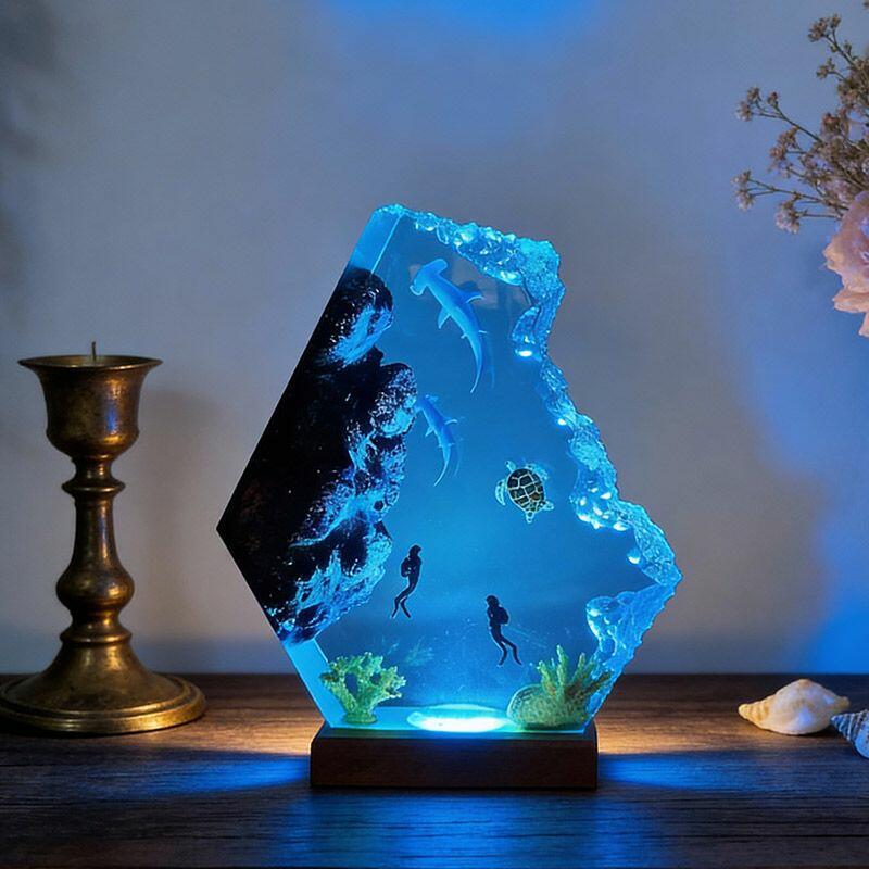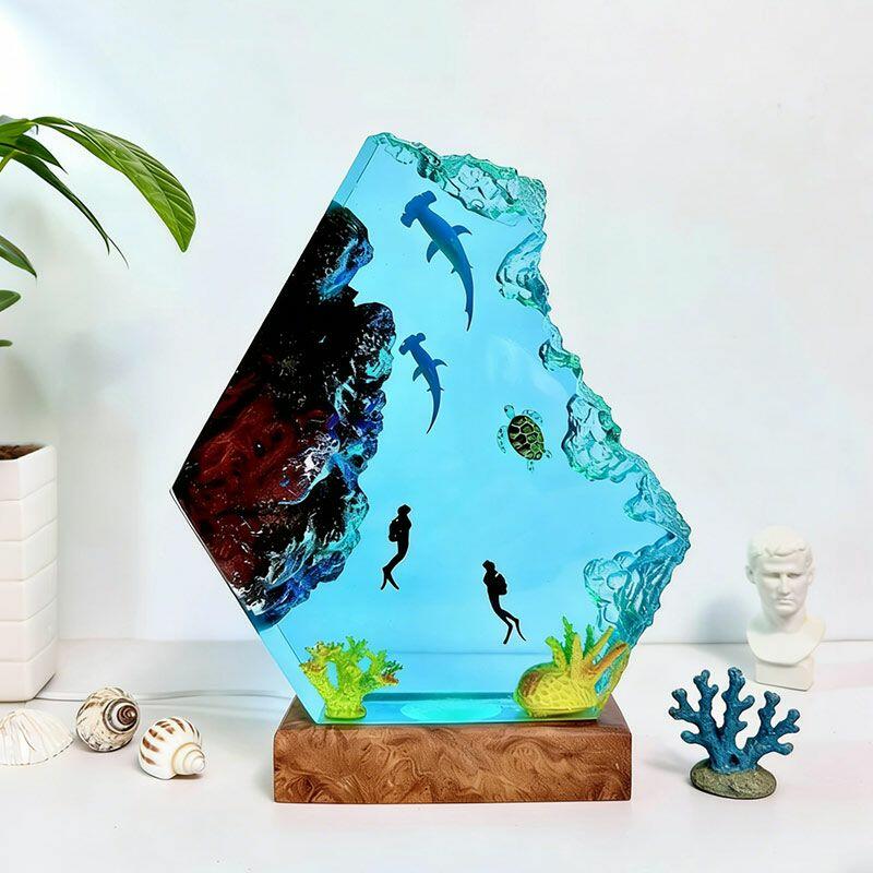 Bring the tranquil underwater world into your space with Reslol’s Oceanic Artisan Epoxy Wood Night Light. This handcrafted piece features a captivating scene: two sleek hammerhead sharks gliding gracefully, a gentle sea turtle swimming alongside, and a couple of divers exploring the depths together—all encased in crystal-clear epoxy resin merged with natural wood, forming an irregular shape that highlights the organic beauty of the materials.