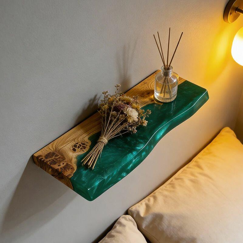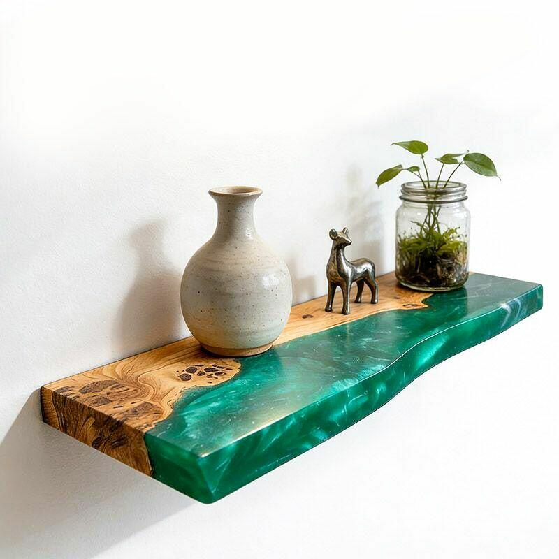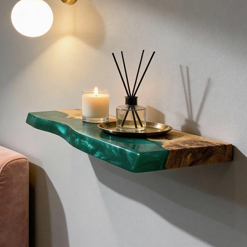 Transform your decor with the Reslol Eco-Craft Green Resin & Wood Live Edge Floating Shelf, a harmony of artisanal skill and nature’s beauty. Swirling green resin intertwines with live-edge wood, highlighting the organic allure of wood grains and the vivid pop of resin—crafted with care to merge sustainability (responsibly harvested wood) and long-lasting strength.