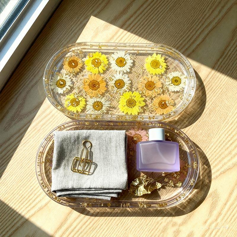 Reslol’s Daisy Resin Jewelry Tray is a stunning blend of eco-conscious craftsmanship and timeless floral elegance. Each tray is meticulously handcrafted using resin and sustainable materials, featuring delicate daisy blooms preserved in a smooth, glossy finish. The oval shape and subtle gold foil accents enhance its luxurious appeal, making it a perfect decorative piece or functional jewelry organizer.