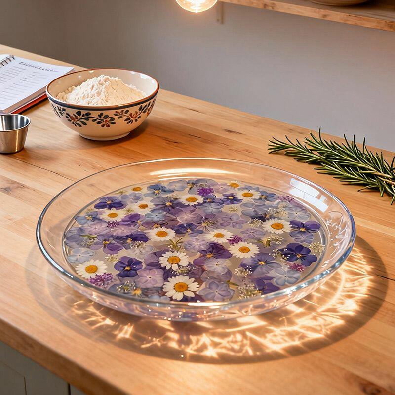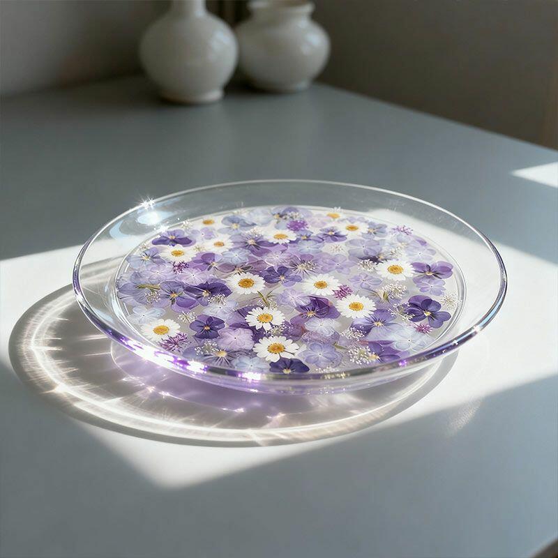 Elegant Floral Resin Tray – Handcrafted Round Serving Tray with Purple Flowers