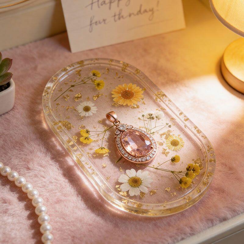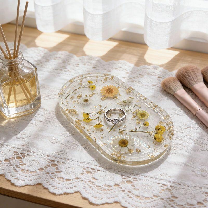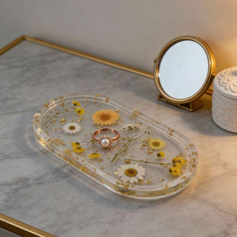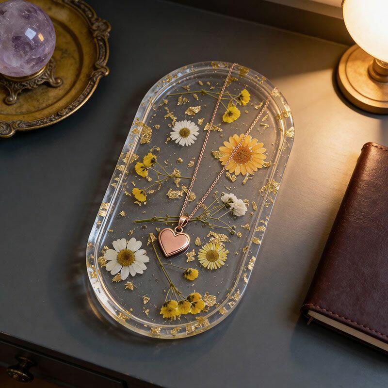 Elegant Resin Jewelry Tray with Pressed Flowers & Gold Leaf – Handcrafted Eco-Friendly Organizer