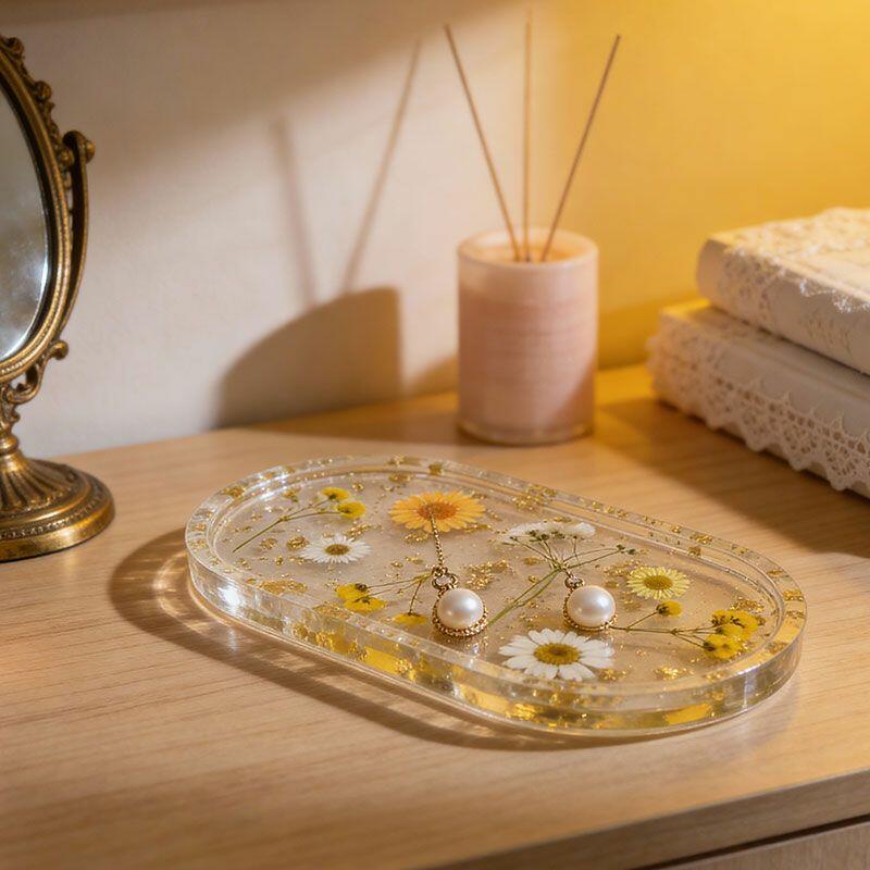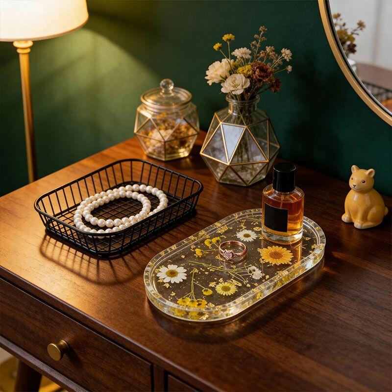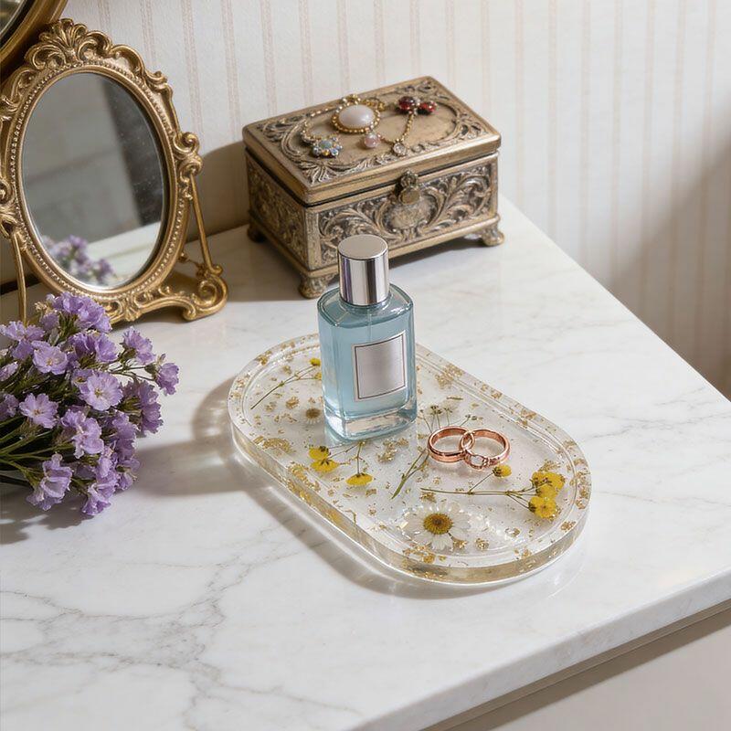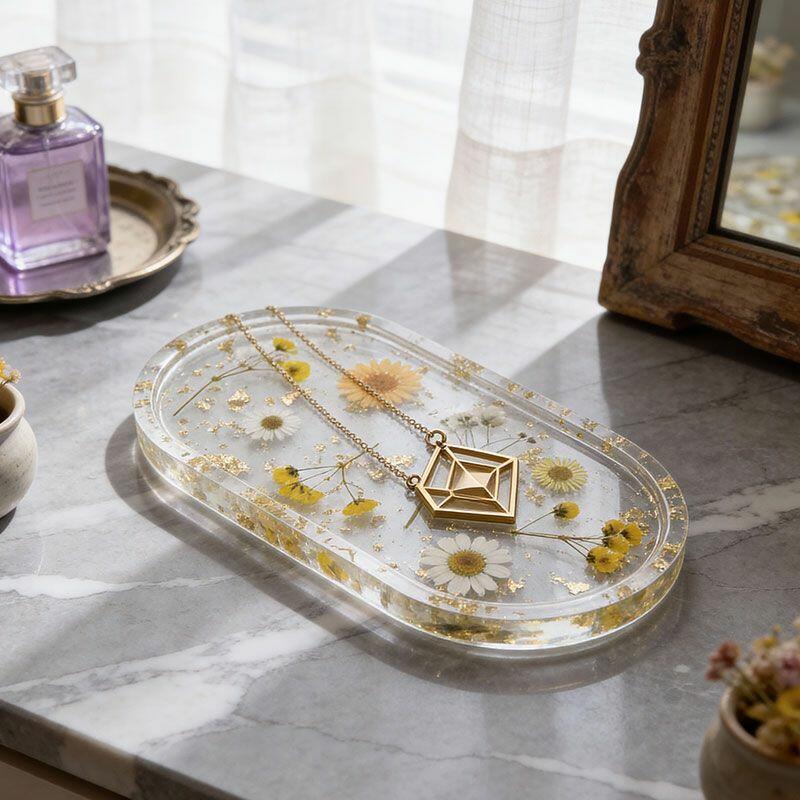 Elevate your jewelry storage with the Reslol Handcrafted Resin Jewelry Tray, a stunning blend of real pressed flowers and delicate gold leaf accents. Each piece is carefully crafted to create a unique, nature-inspired design, making it a perfect organizer for rings, earrings, and necklaces.