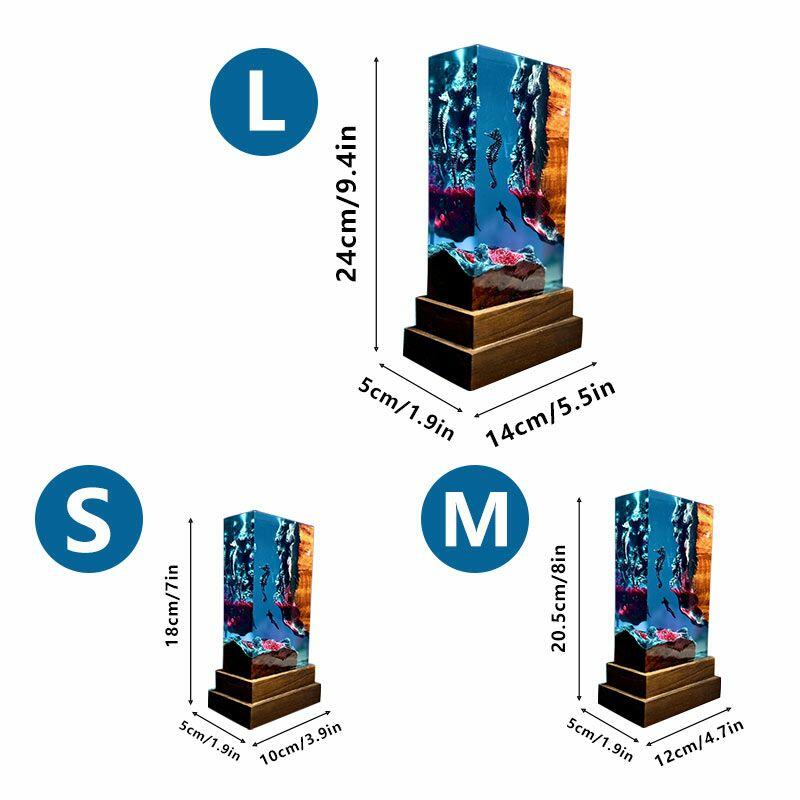 Dive into the serene beauty of the ocean with Reslol’s Enchanted Deep Sea Resin Lamp, where artisanal craftsmanship meets the wonders of the sea. This rectangular piece blends natural wood and clear resin to capture a 3D underwater scene, featuring a delicate seahorse and a tiny diver—each detail hand-sculpted to evoke the calm of the deep sea. The warm LED glow through resin, turning your space into a tranquil underwater retreat, perfect for living rooms, bedrooms, or offices.