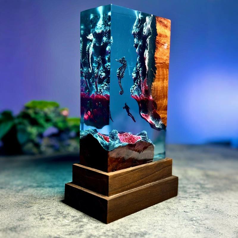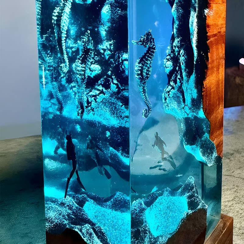 Enchanted Deep Sea Seahorse & Diver Resin Lamp | Reslol Wooden & Resin Art Piece