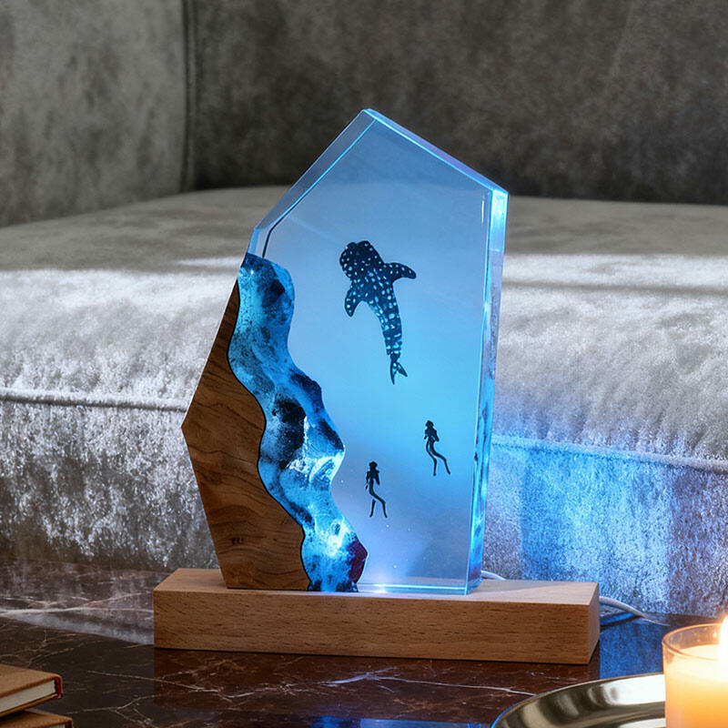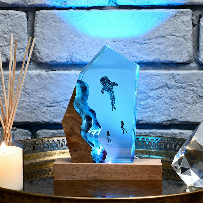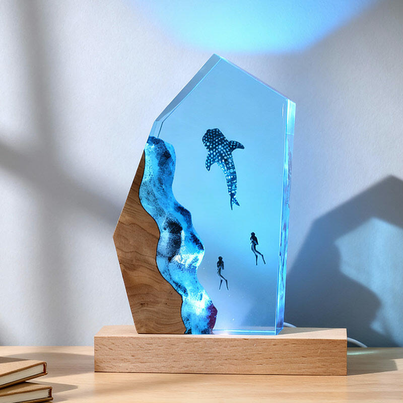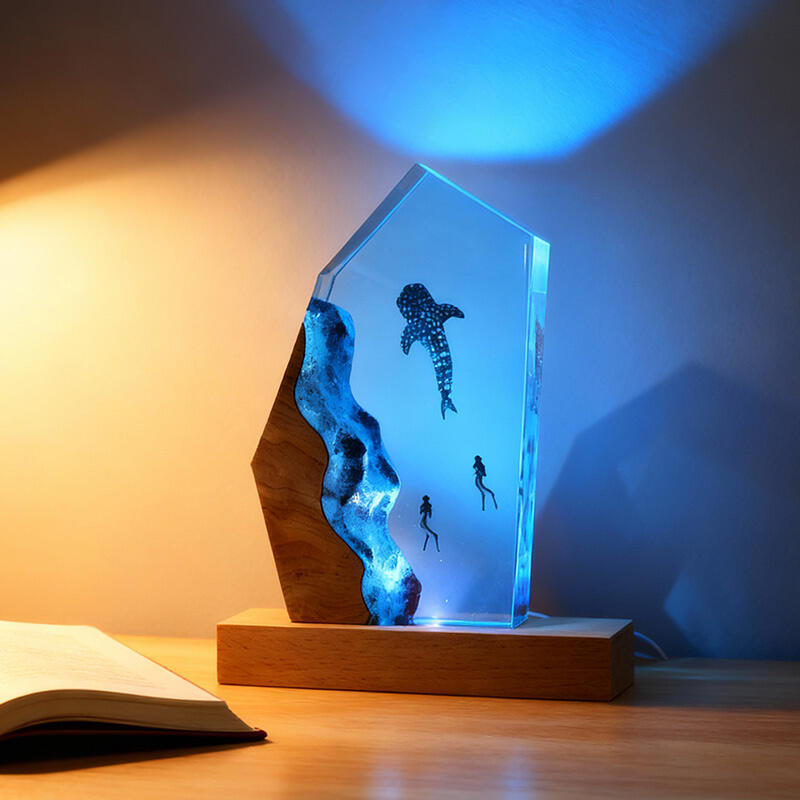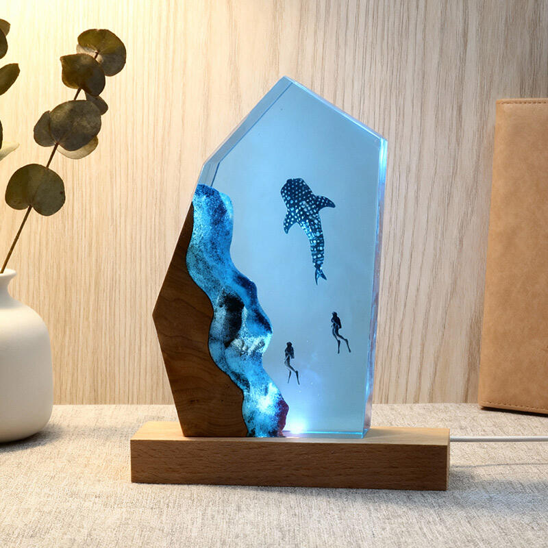 Enchanted Ocean Glow – Handmade Resin Lamp with Whale Shark & Diver 3D Design