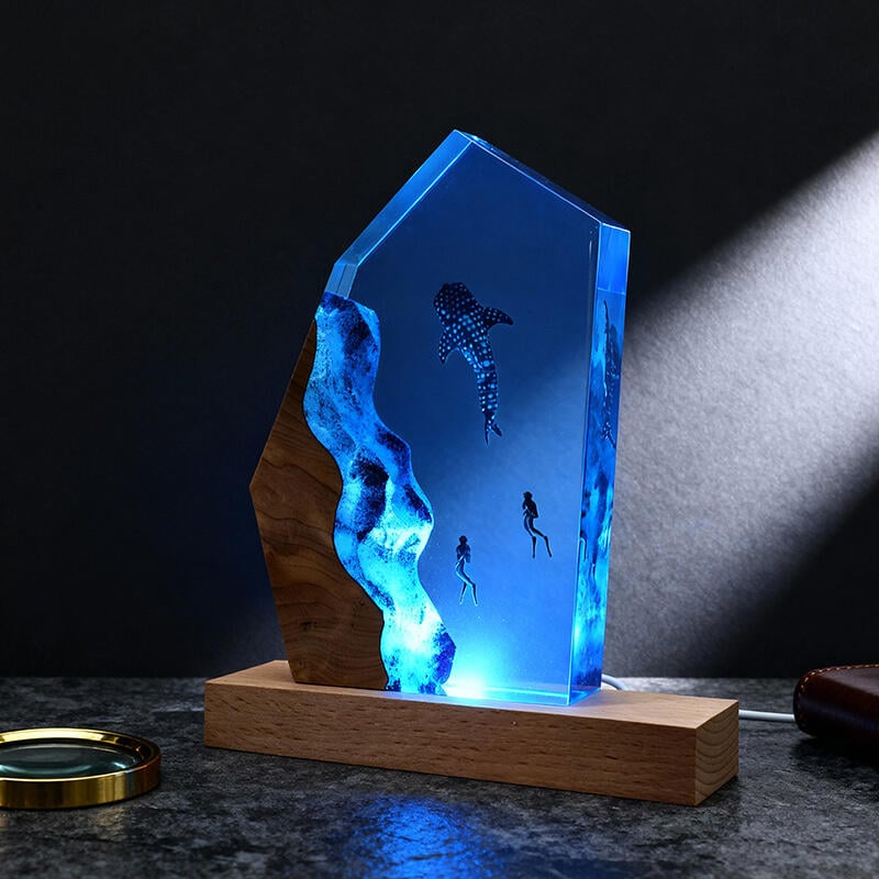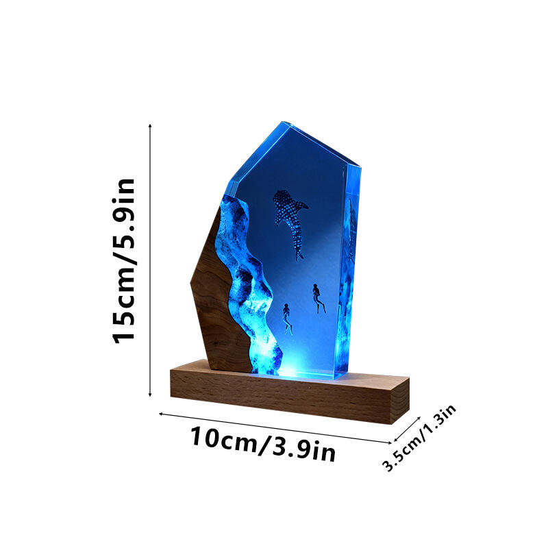 Bring the mesmerizing glow of the deep sea into your home with this exclusive handmade resin night lamp, featuring a breathtaking 3D whale shark and diver design. Perfect for marine enthusiasts, adventurers, and lovers of dreamy, aesthetic home decor, this irregular-shaped LED lamp casts a soft, ethereal glow—ideal for bedrooms, offices, or display shelves.