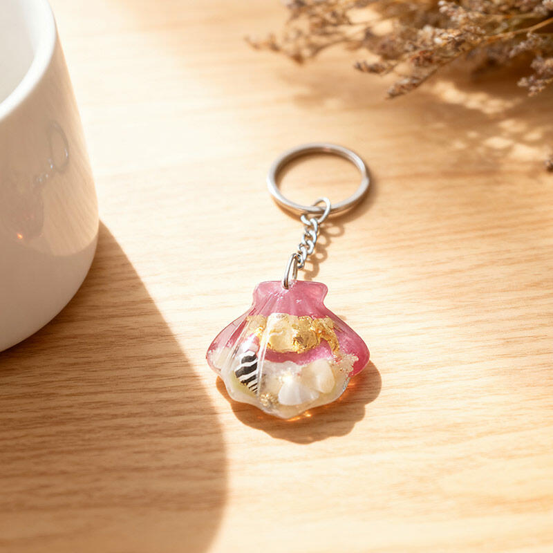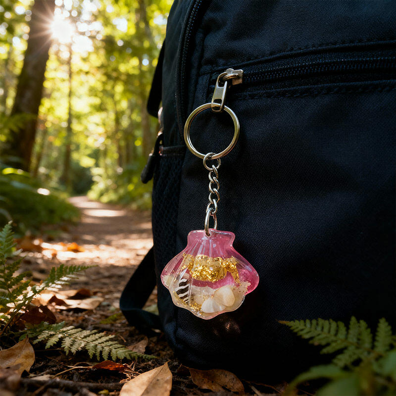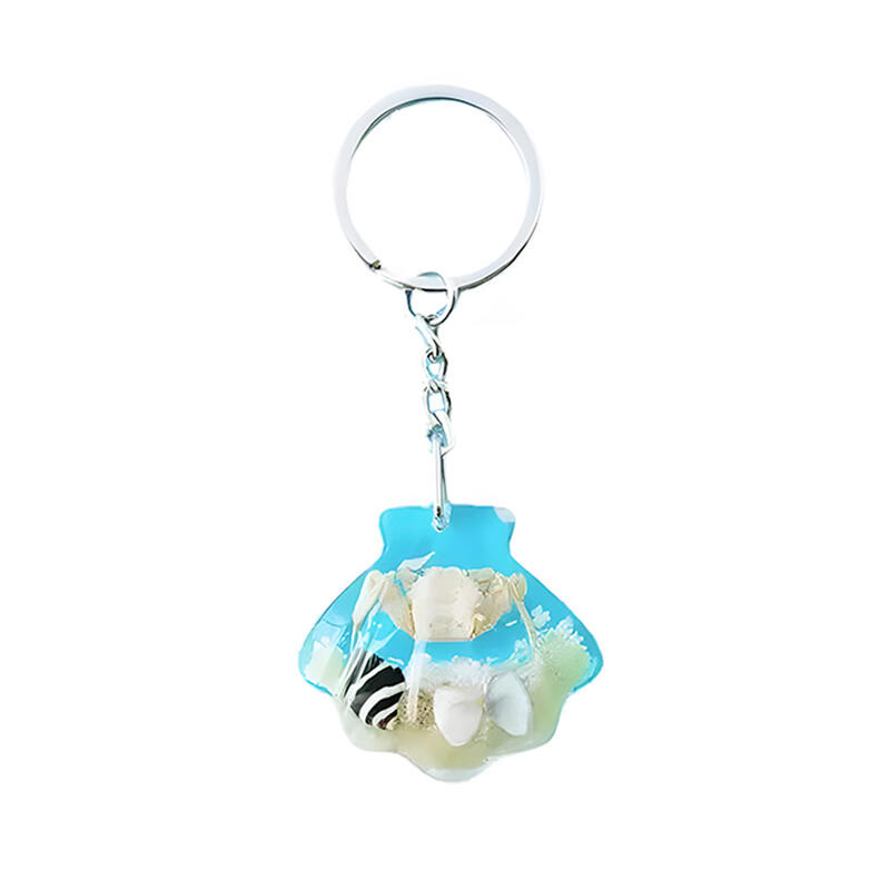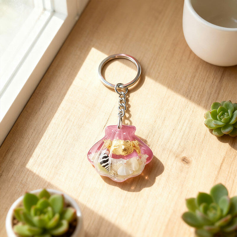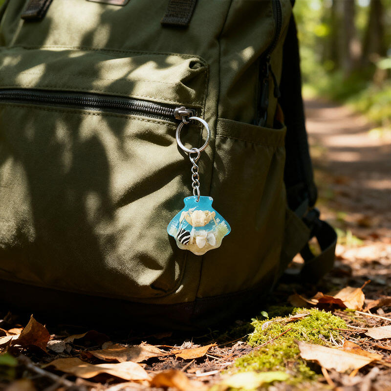 Enchanting Seashell Resin Keychain – Marine Theme with Crab, Sand, Conch & Shell