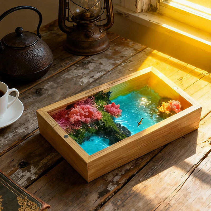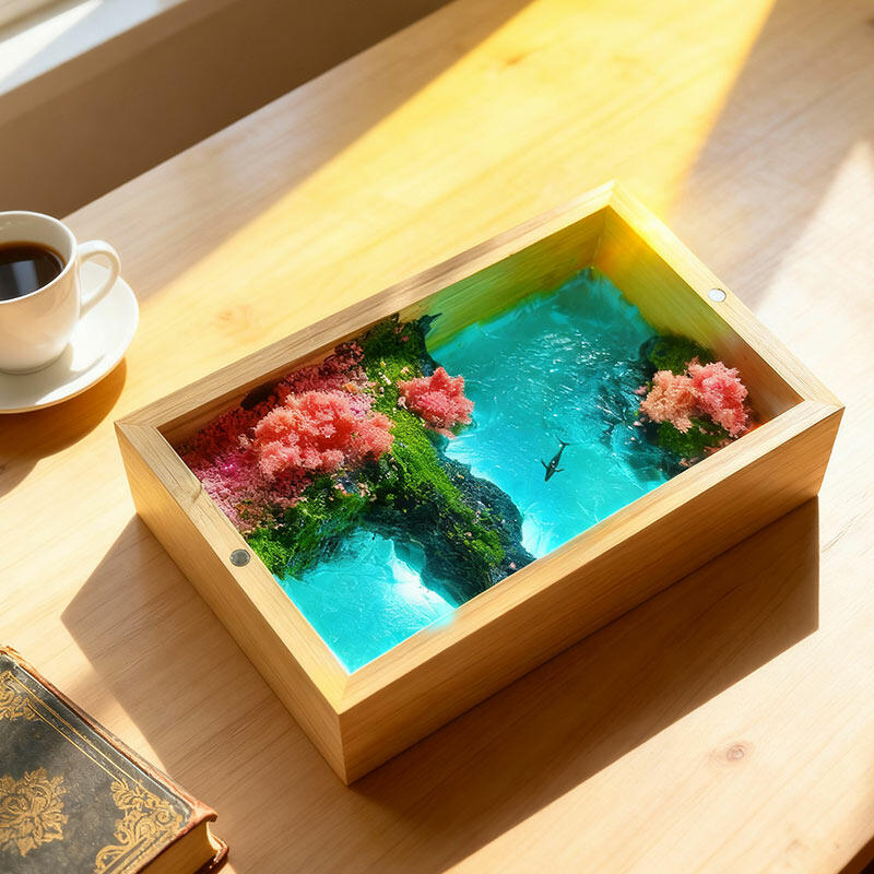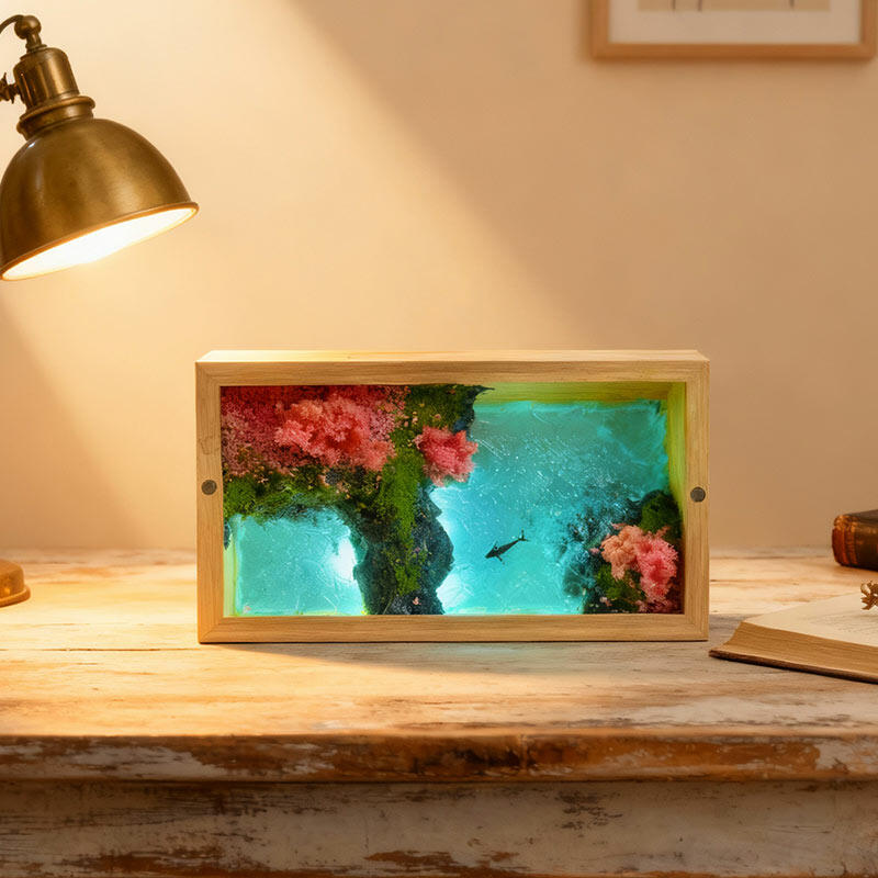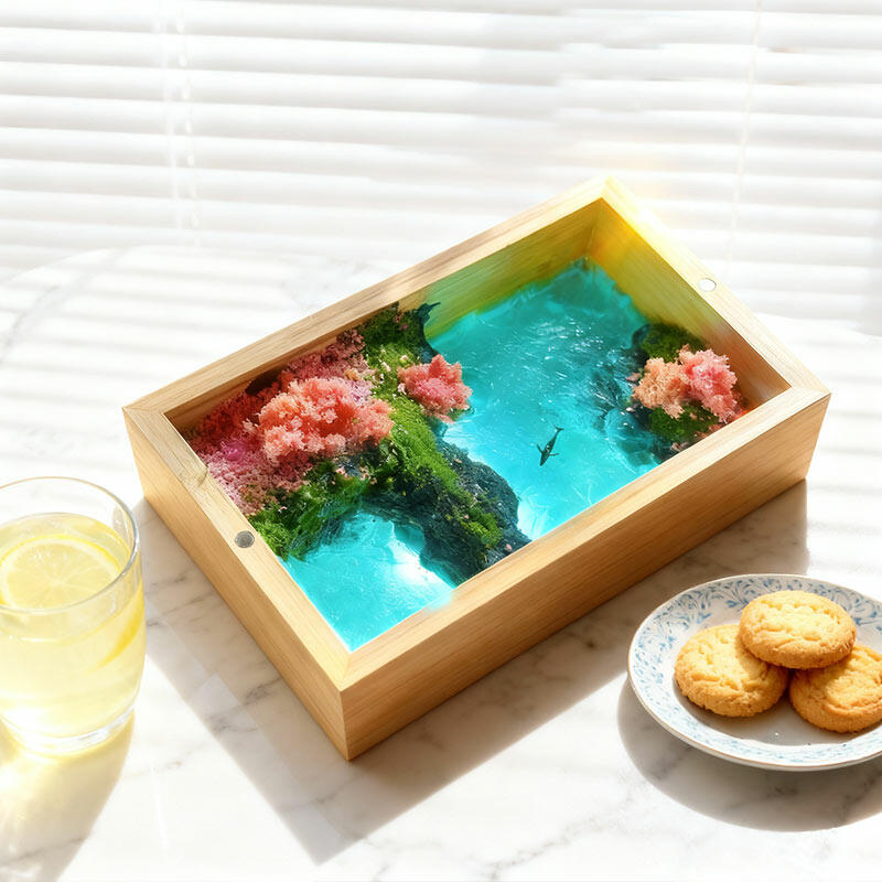 Ethereal Glow Ocean Resin Night Light, Handcrafted Decor Gift Bamboo Box