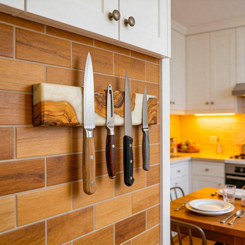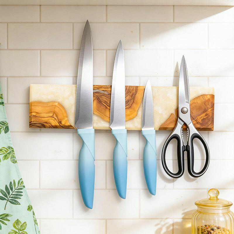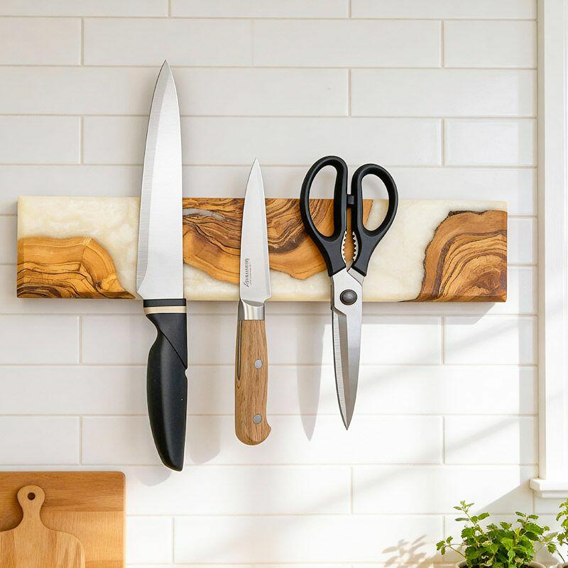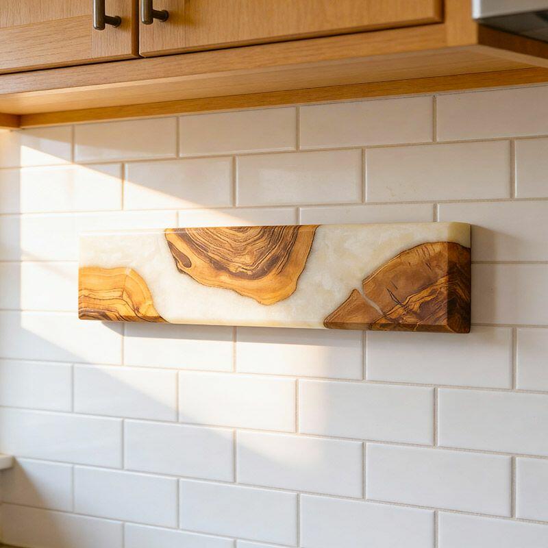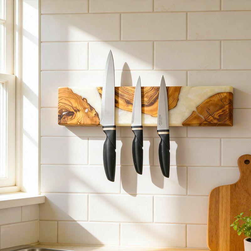 Elevate your kitchen with Reslol’s Handcrafted Resin Wooden Magnetic Knife Holder—a blend of artisanal craftsmanship and practical design. This wall-mounted piece combines smooth white resin with natural solid wood, creating a sleek, modern accent that doubles as functional storage for your knives.