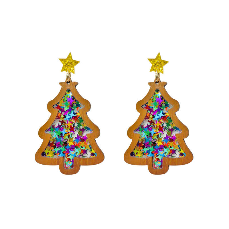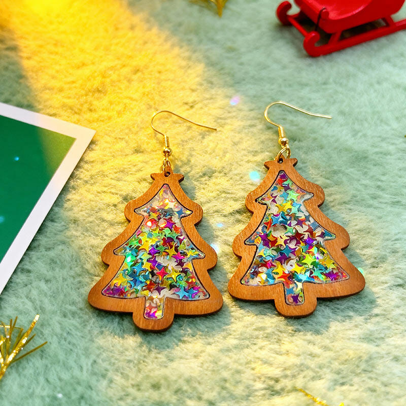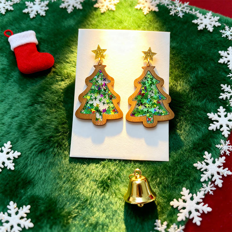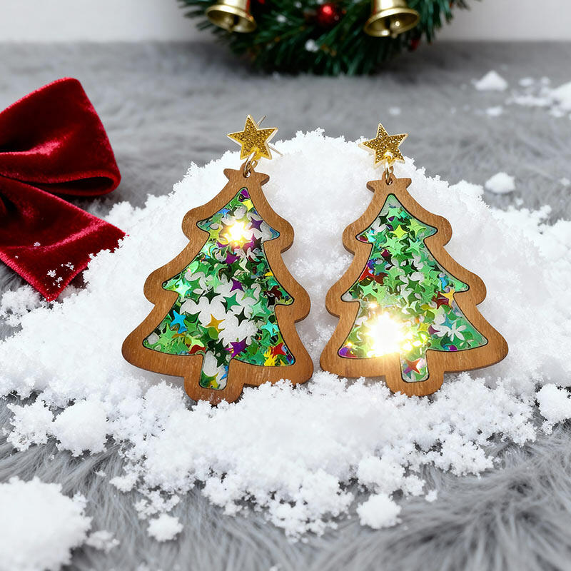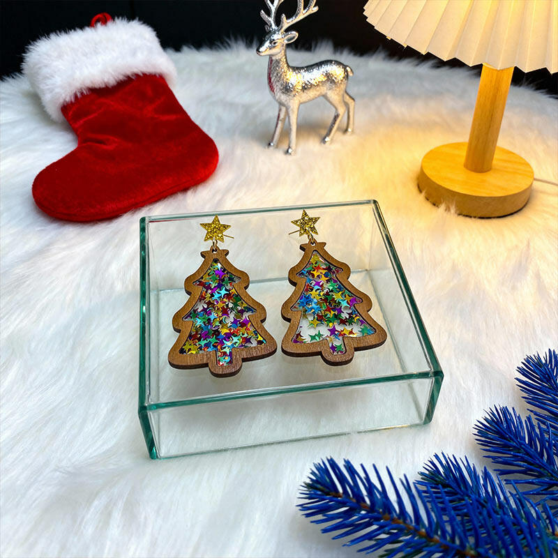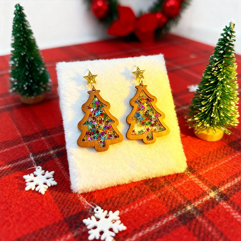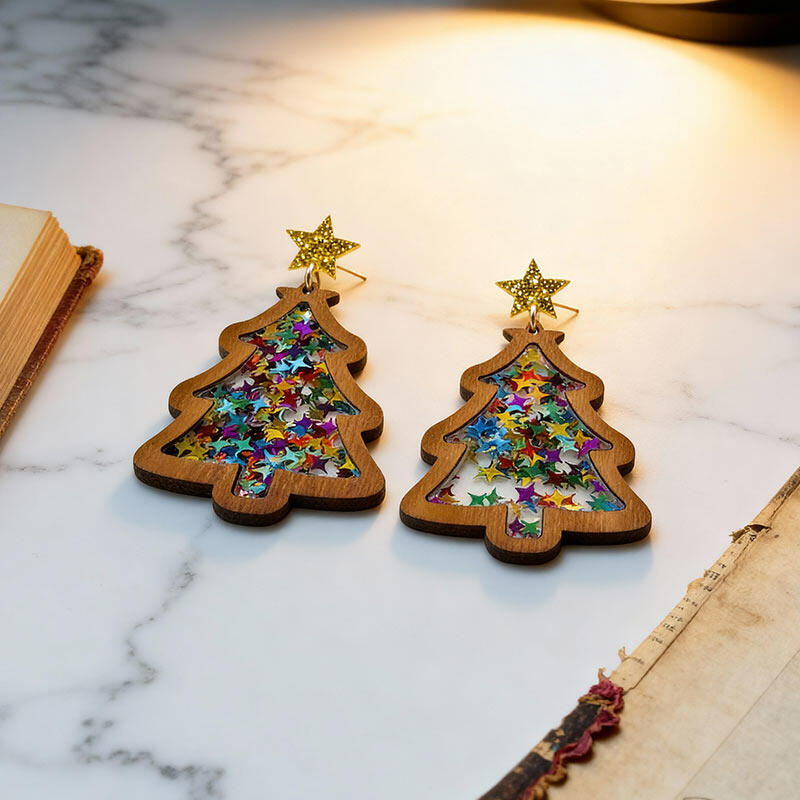 These earrings capture the essence of Christmas with their tree-shaped design, adorned with glitter that sparkles like holiday lights. The combination of resin and other materials ensures a durable and eye-catching accessory.