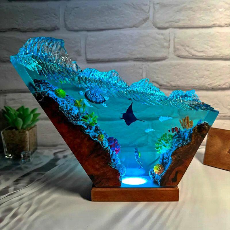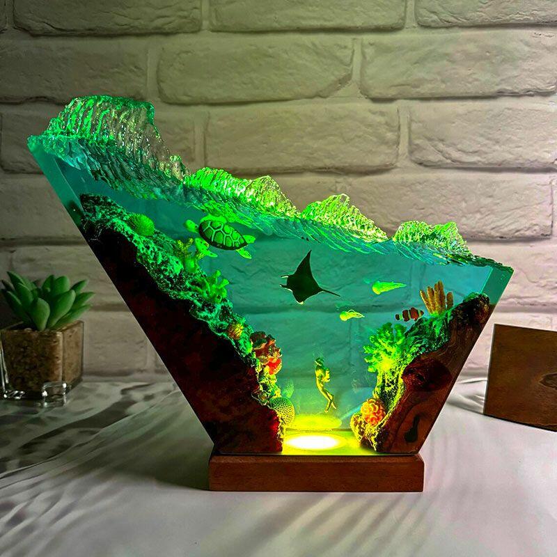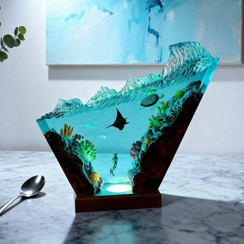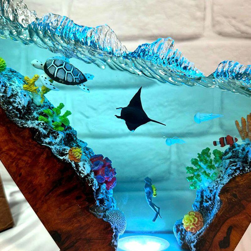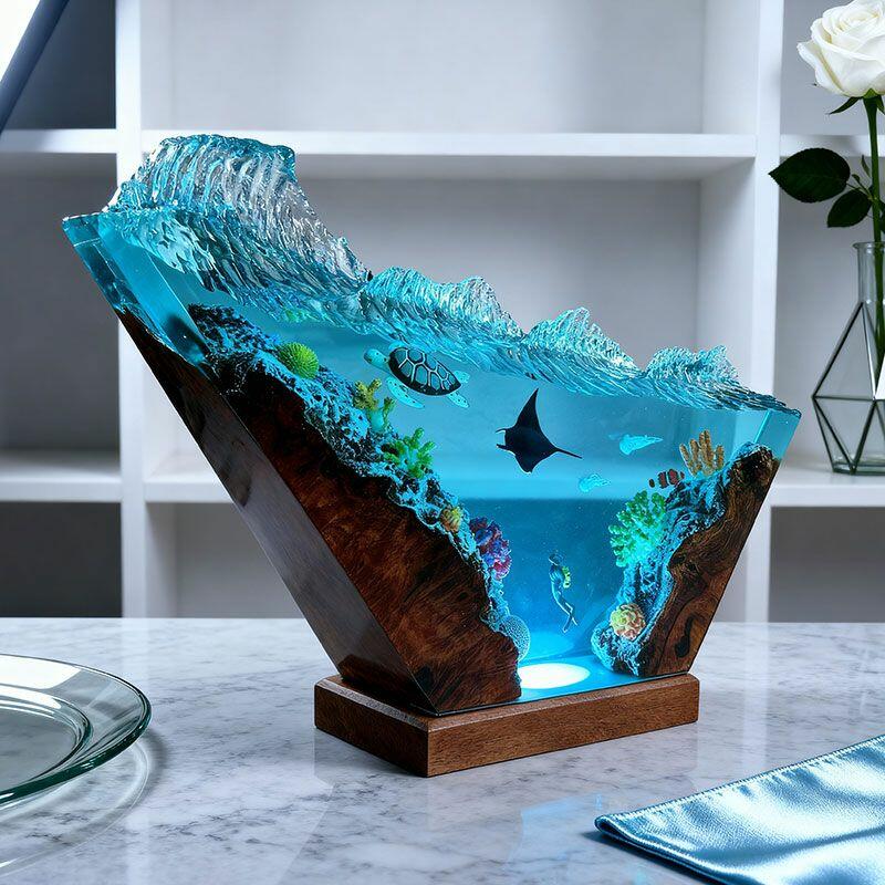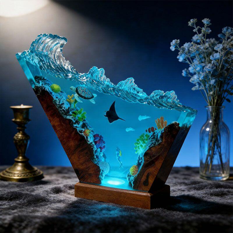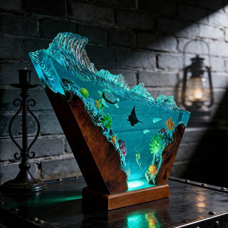 Bring the ocean’s tranquility indoors with Reslol’s Serene Coastal Resin Lamp, where hand-carved wood meets crystal-clear resin to celebrate marine elegance. The design features graceful turtles and manta rays, set against an irregular wave base that evokes the ocean’s gentle motion—every detail crafted with care to honor artisanal tradition.