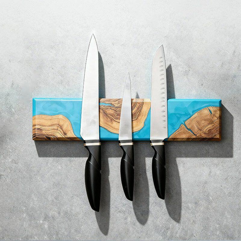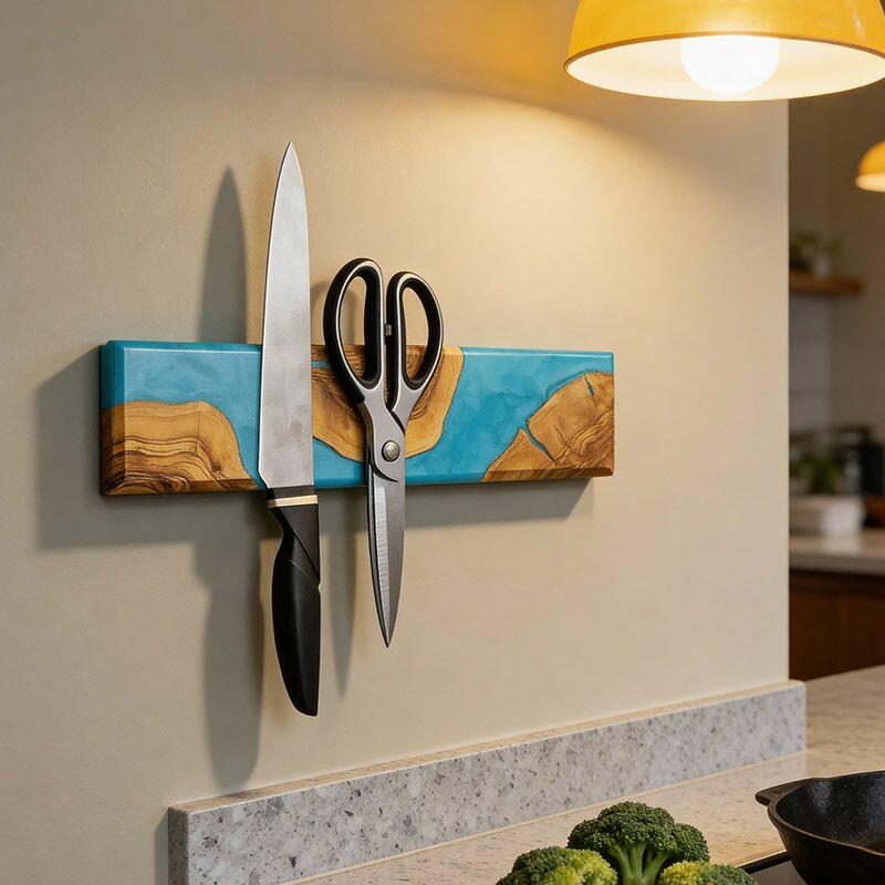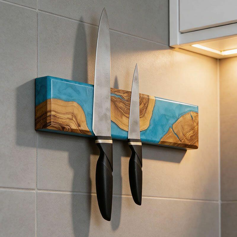 Handcrafted Blue Resin-Wood Magnetic Knife Rack – Modern Kitchen Décor