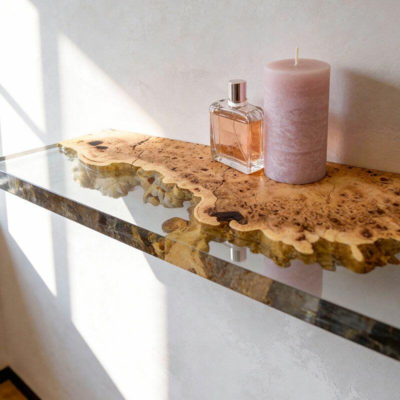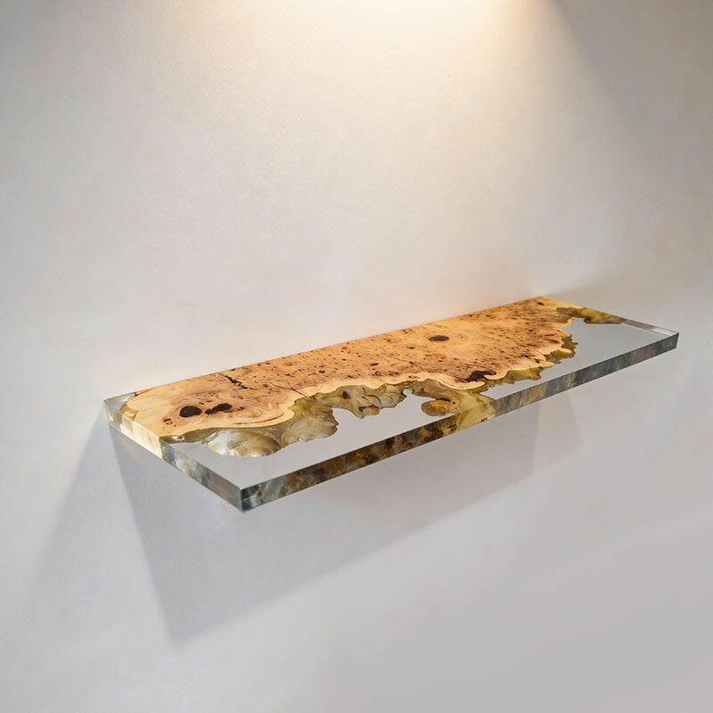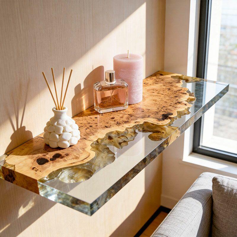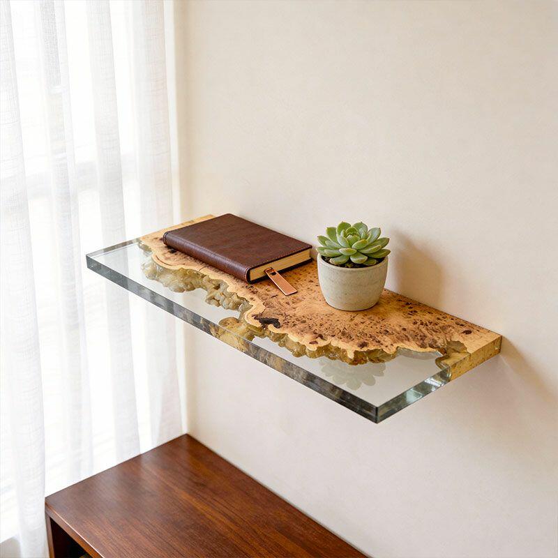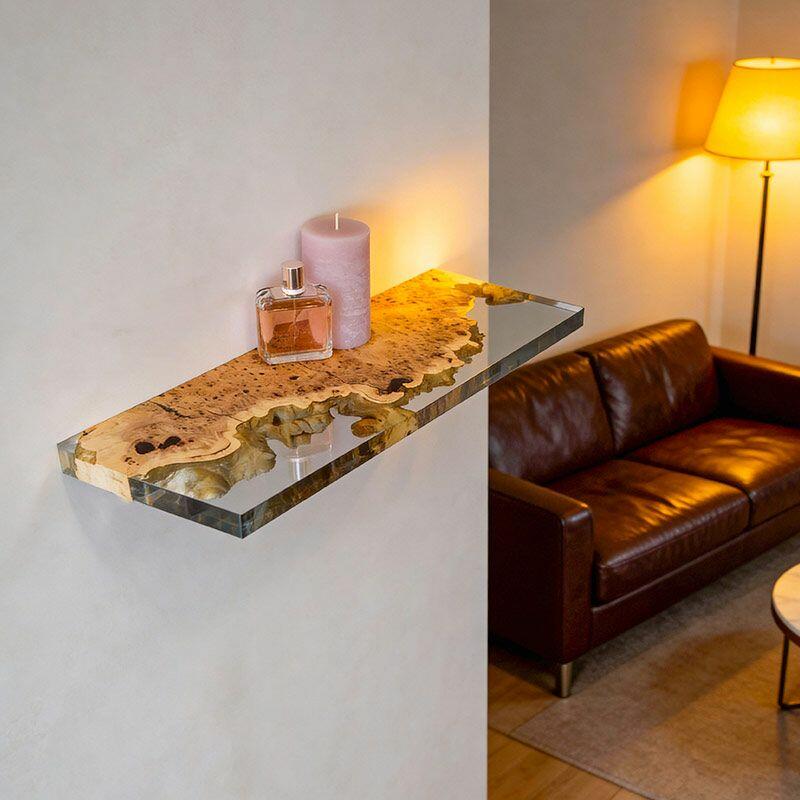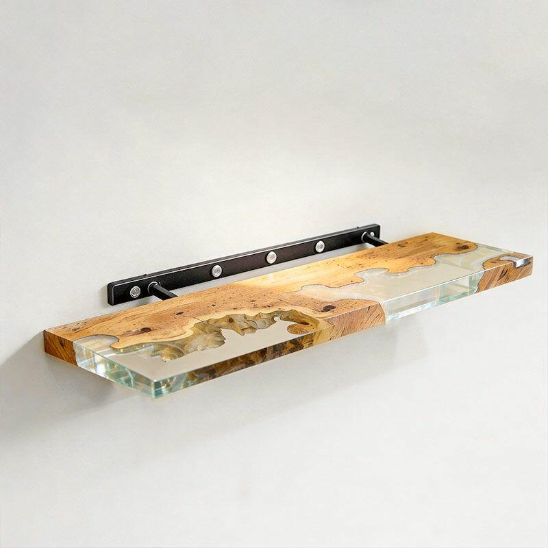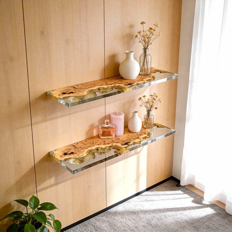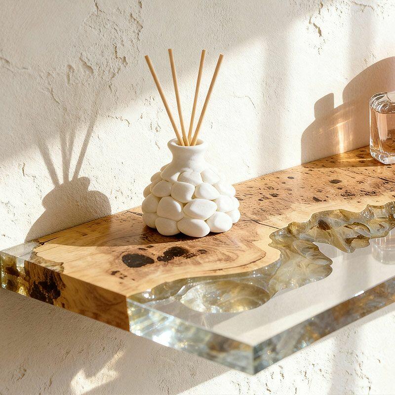 Elevate your space with Reslol’s Artisanal Clear Resin & Wood Floating Shelves, where crystal-clear resin seamlessly merges with natural wood to craft a stunning blend of modern simplicity and organic texture. Each rectangular shelf showcases the wood’s unique grain through the clear resin, adding a touch of rustic charm to any room.