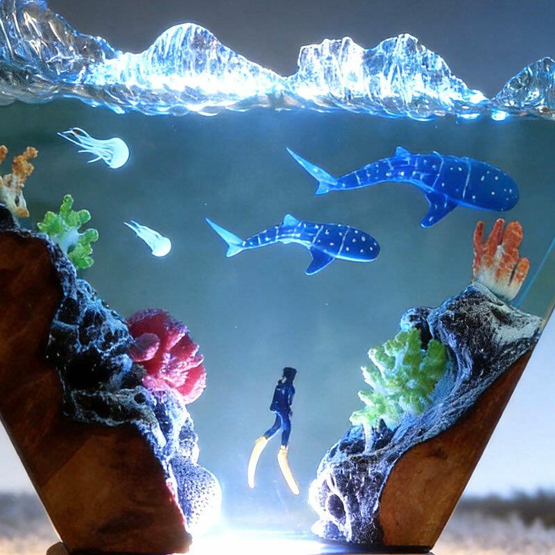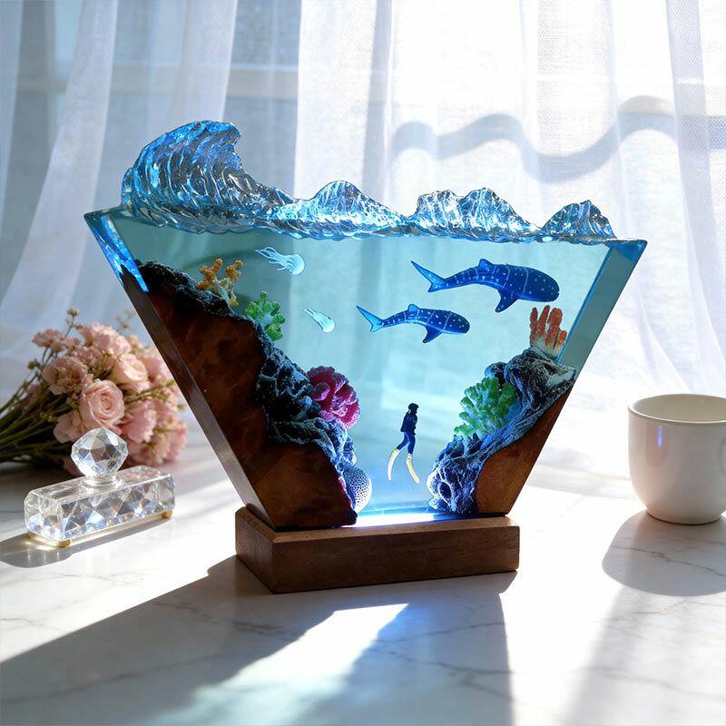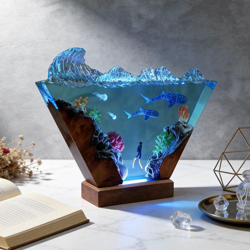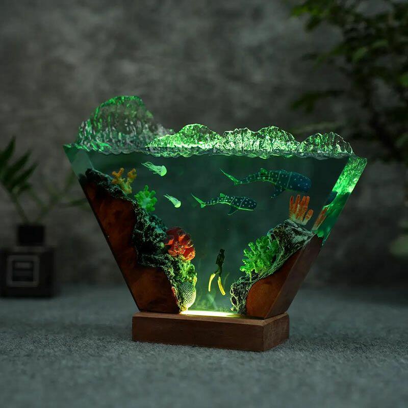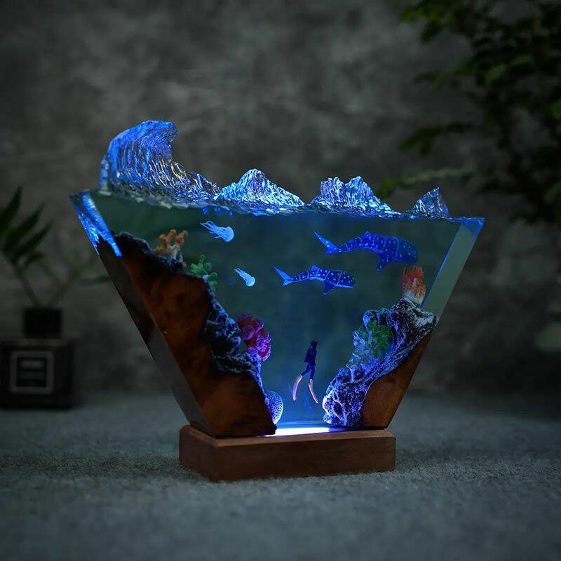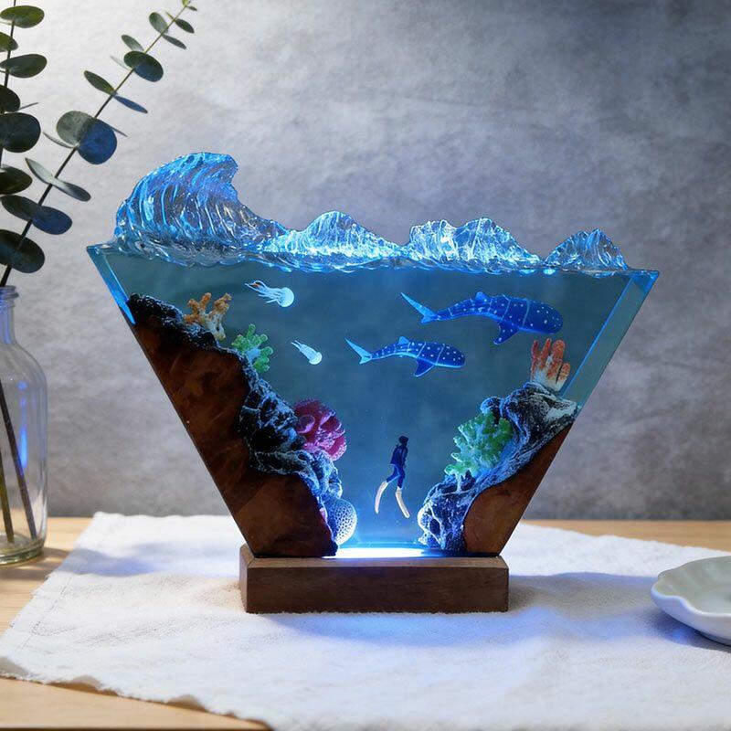 Handcrafted Nautical Resin Lamp | Diver & Whale Sharks Art Light