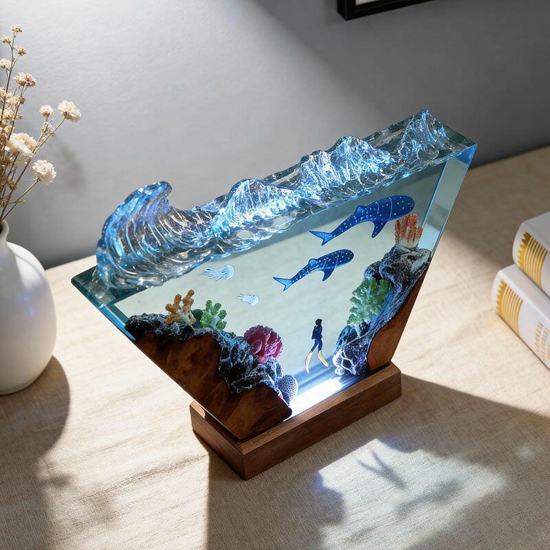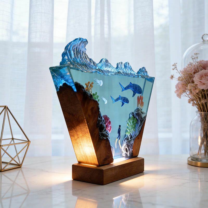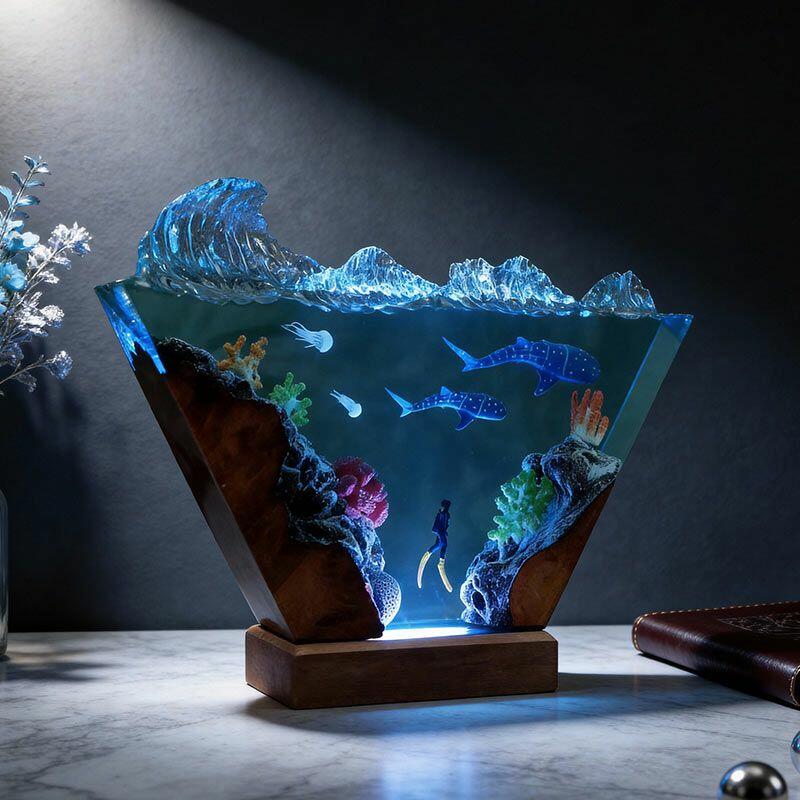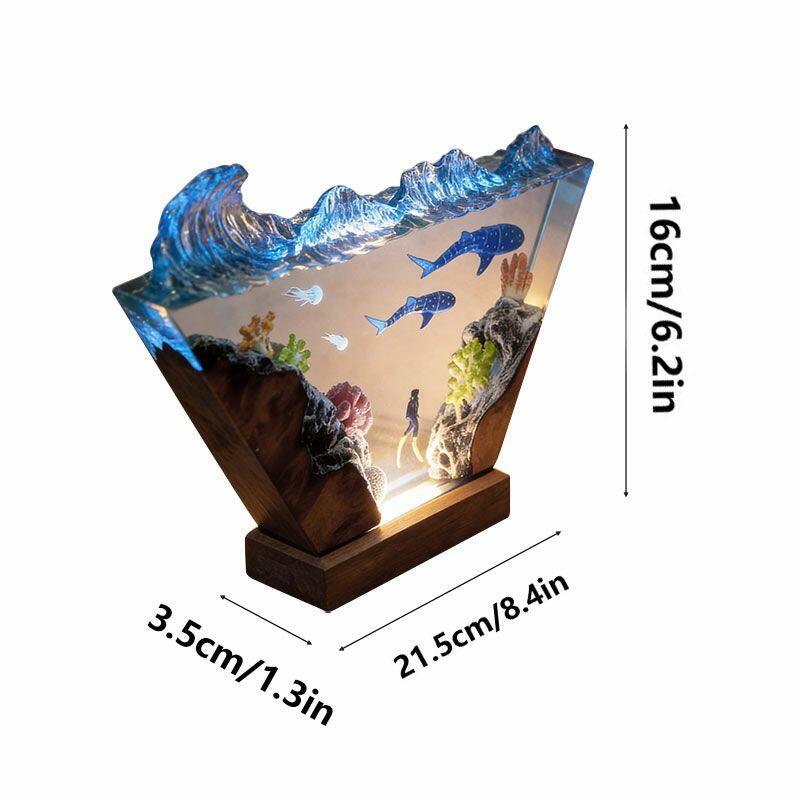 Dive into the serene beauty of the ocean with Reslol’s Artisanal Ocean Resin Lamp, a captivating blend of hand-poured resin and natural wood. This unique piece features a detailed scuba diver, two graceful whale sharks, and delicate jellyfish, all frozen in a moment of underwater wonder, bringing the magic of the deep sea into your home.