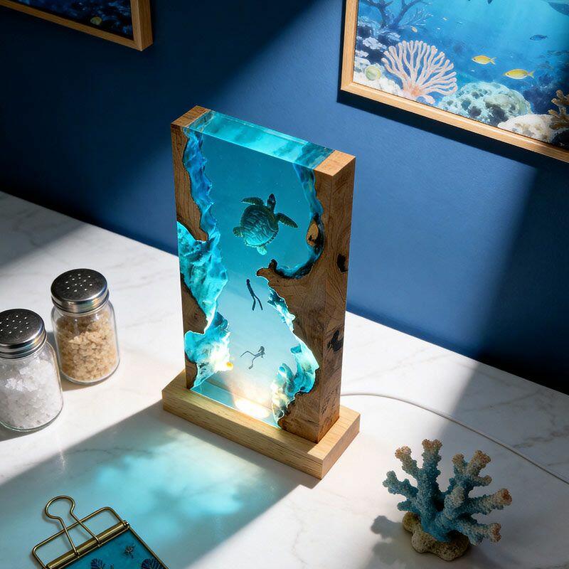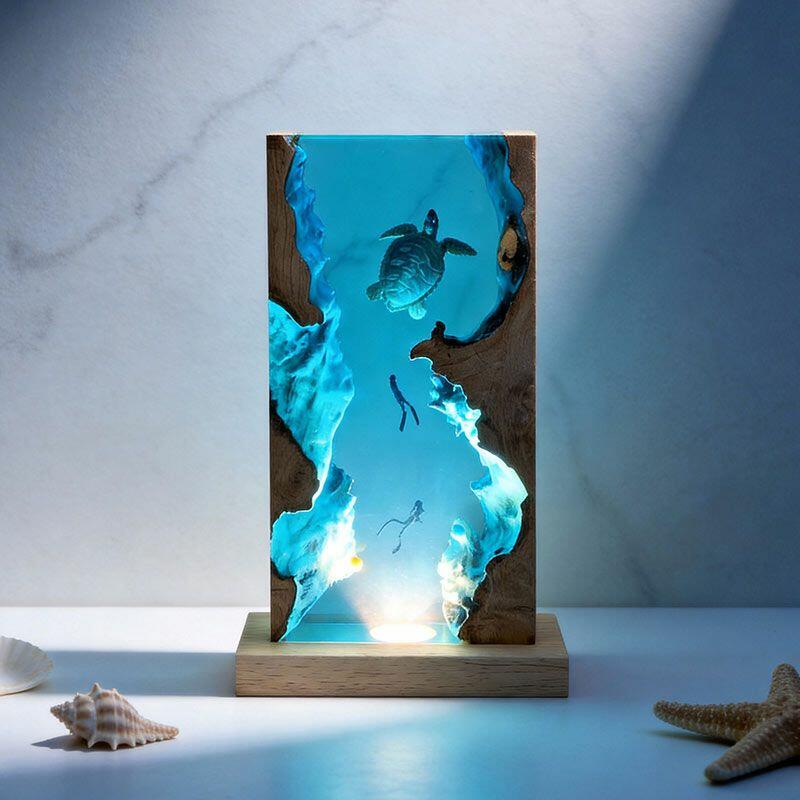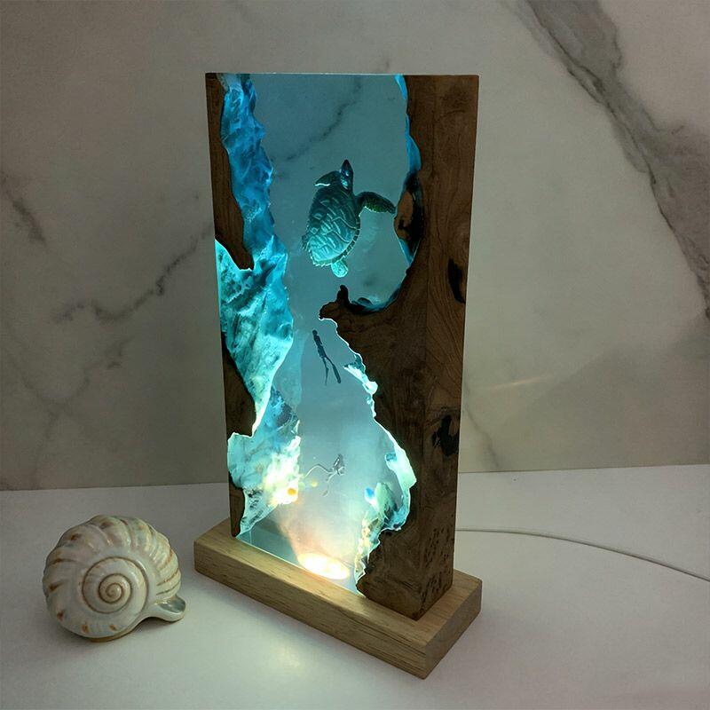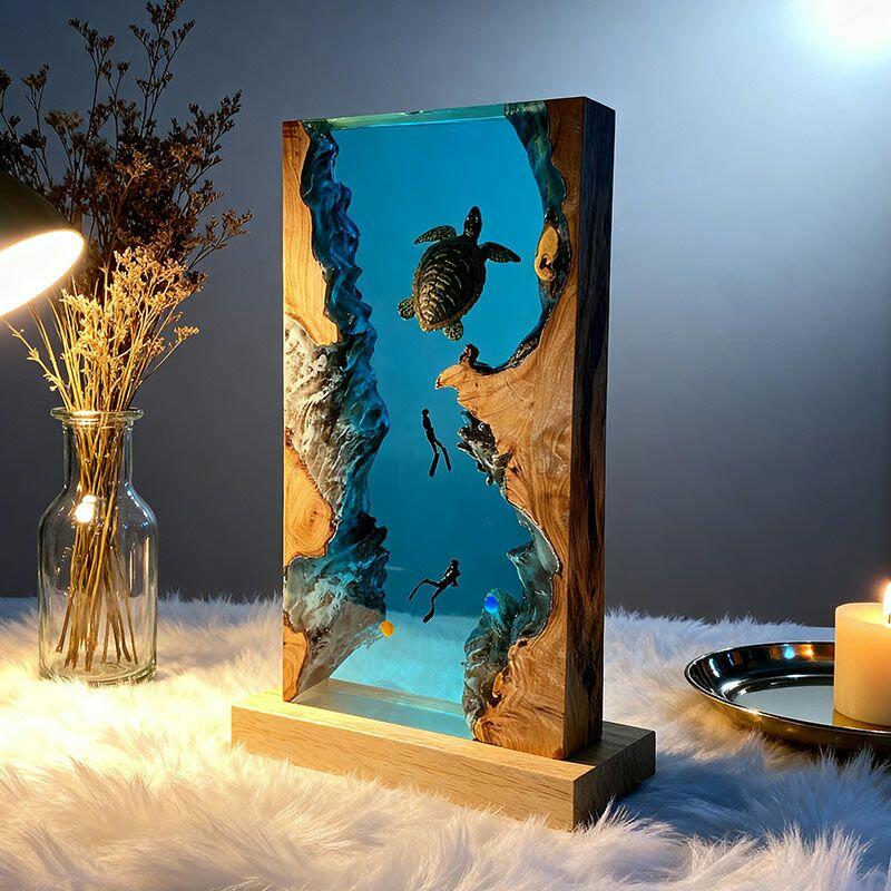 Discover the Reslol Underwater Explorer Resin Lamp—a handcrafted rectangular decor piece that brings the ocean’s wonder indoors. At its heart: a lifelike turtle and a diver, frozen in a moment of underwater harmony, rendered in smooth resin to create a 3D-like depth and realism.