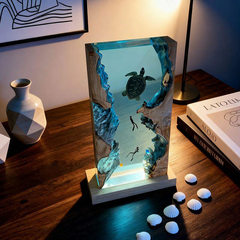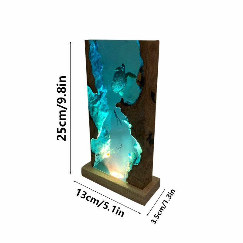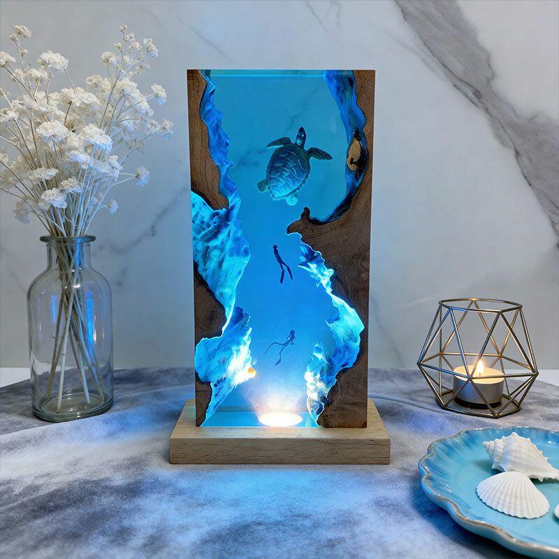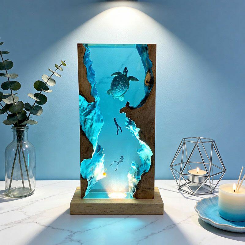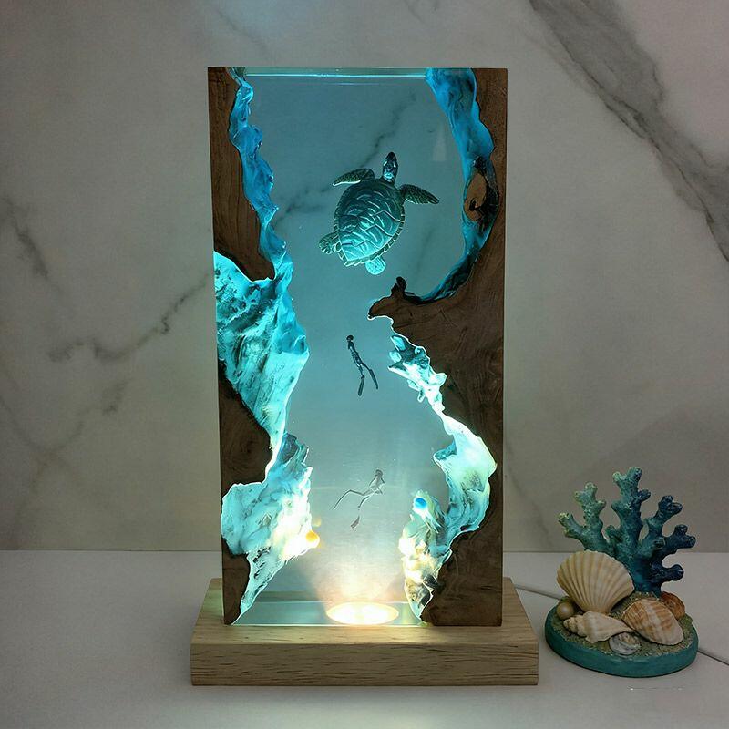 Handcrafted Turtle & Diver Resin Lamp - Underwater Explorer Rectangular Decor