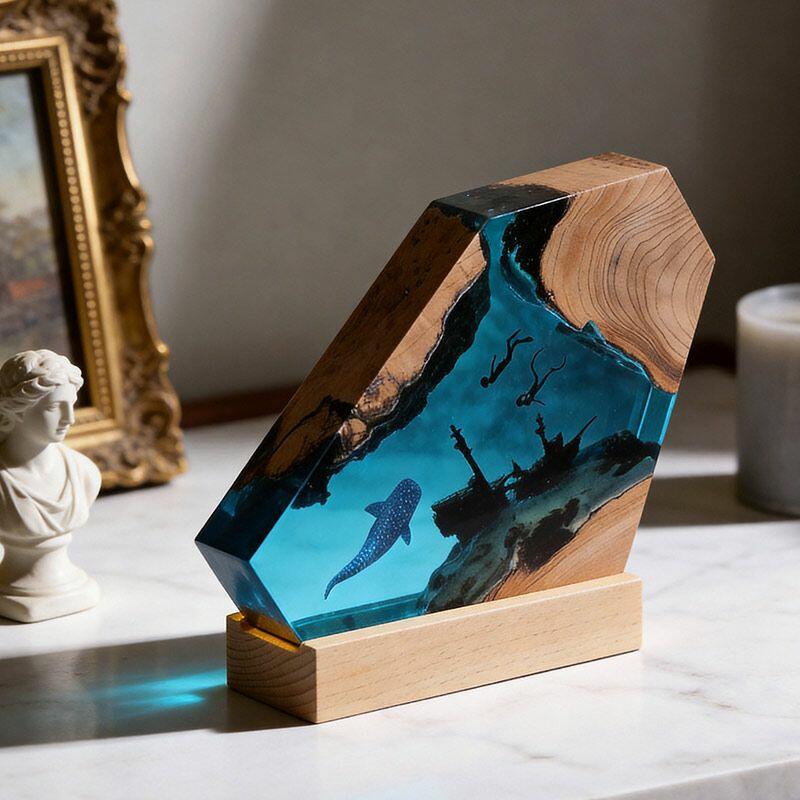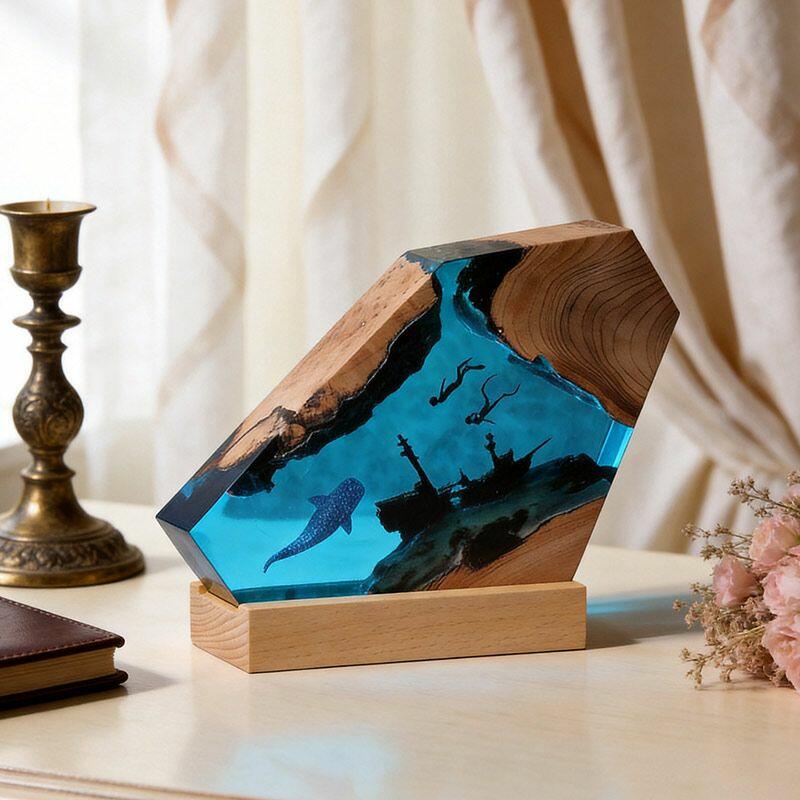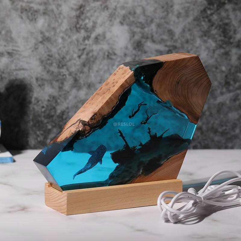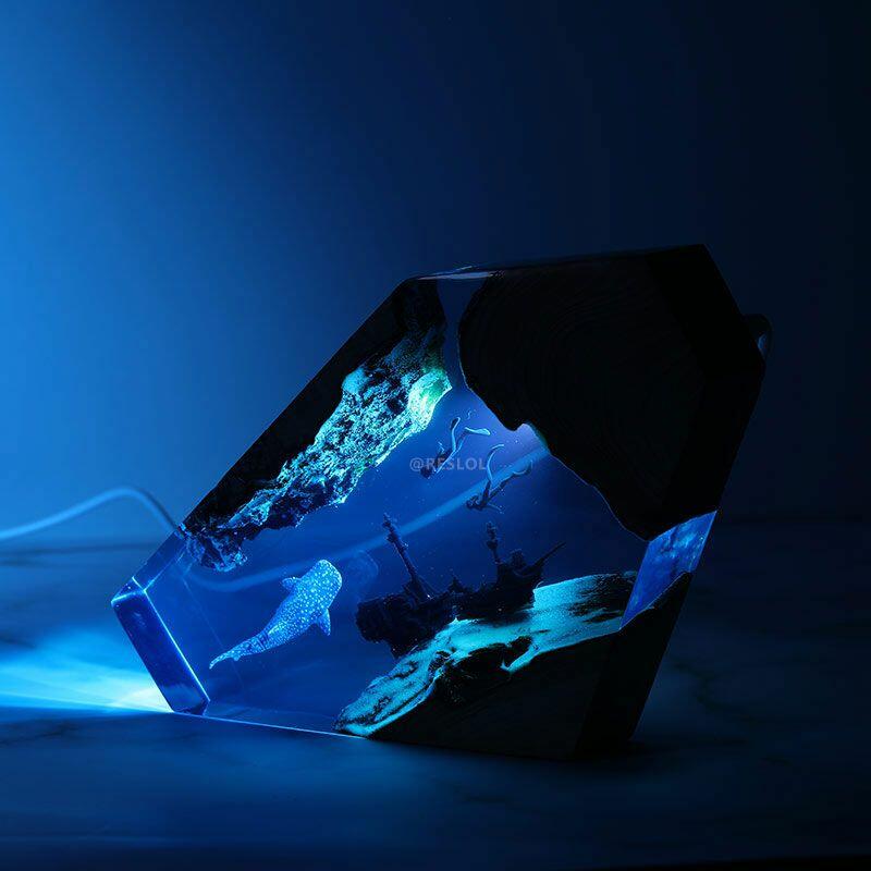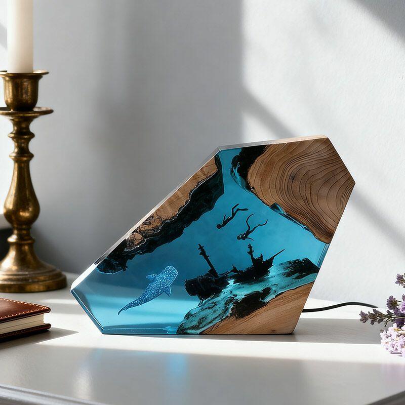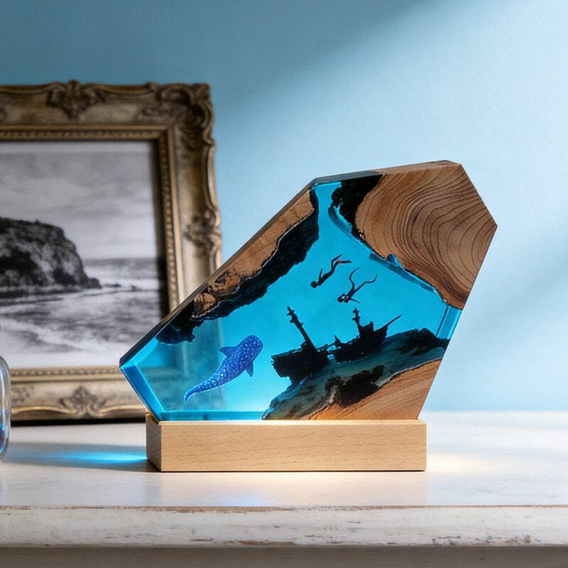 Humpback Whale Resin Night Light – Ocean Shipwreck Decor – Handmade Wood & Resin Lamp