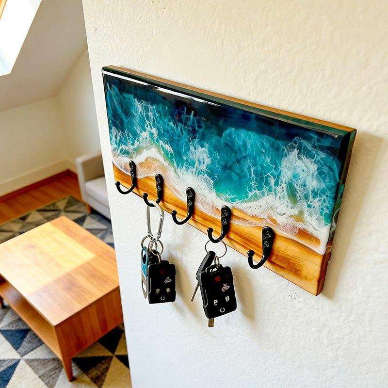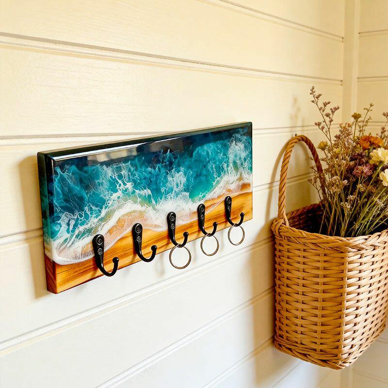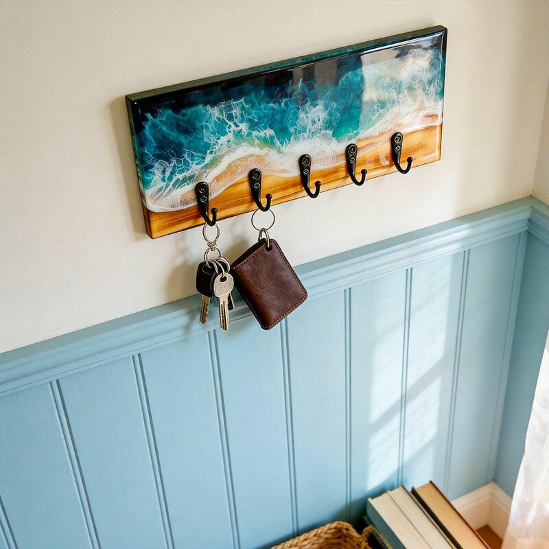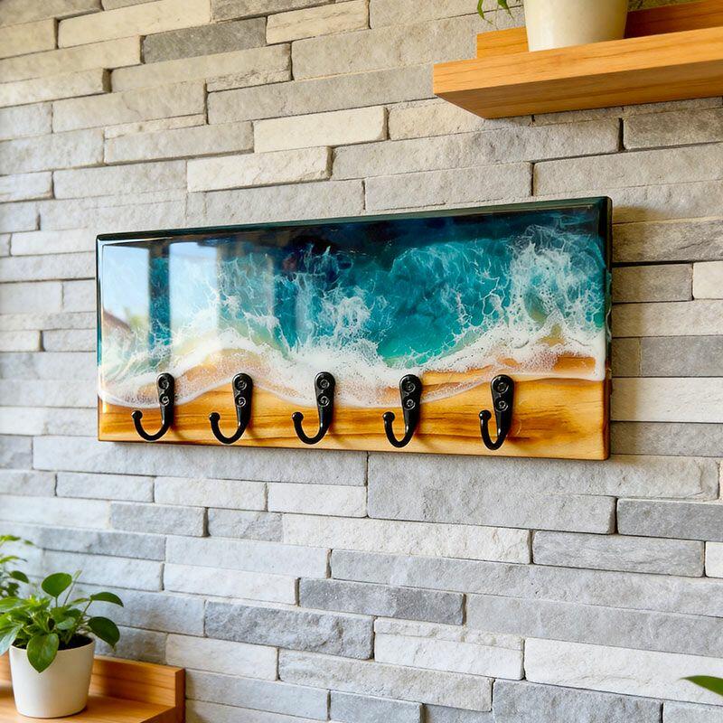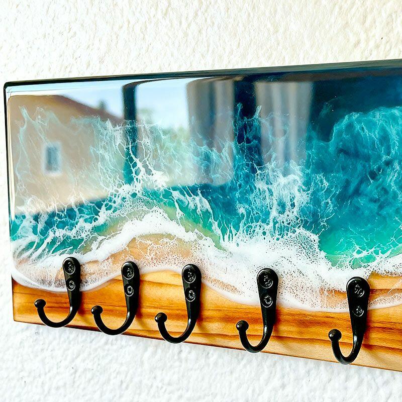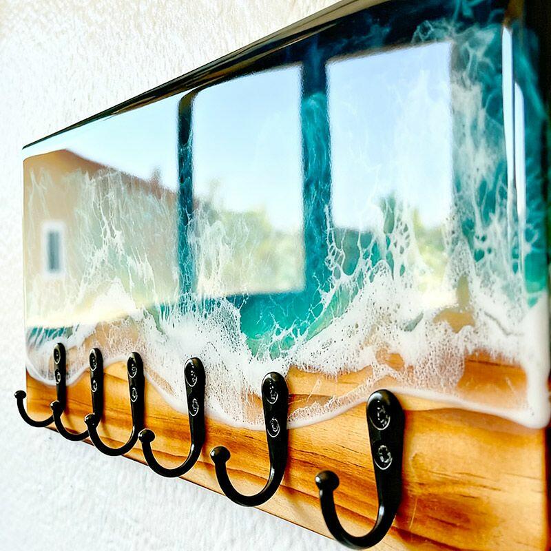 Lustrous Teal Ocean Wave Resin-Wood Key Rack | Reslol Beachy Housewarming Decor