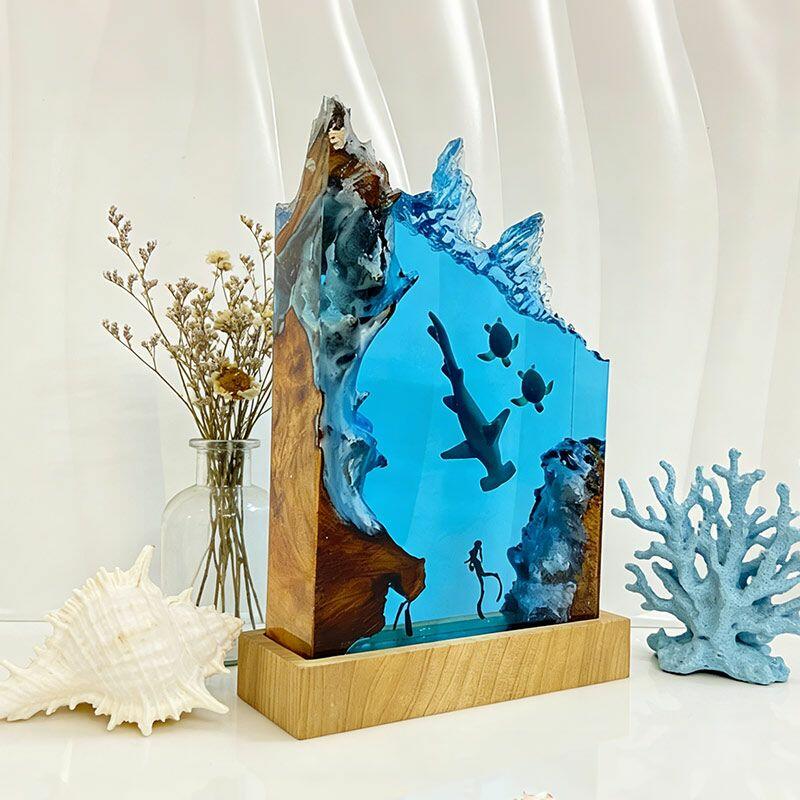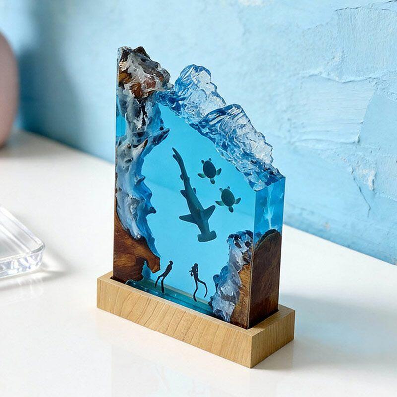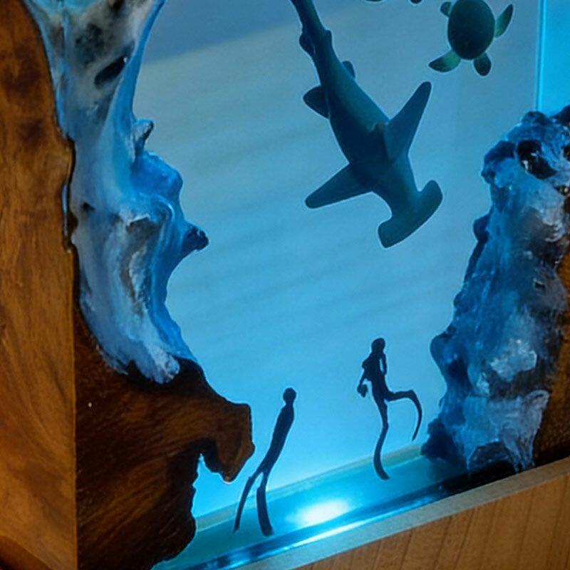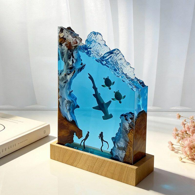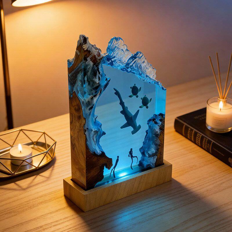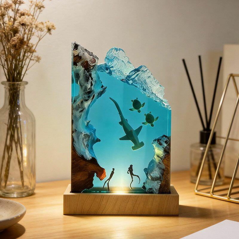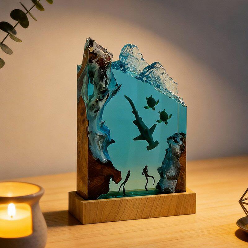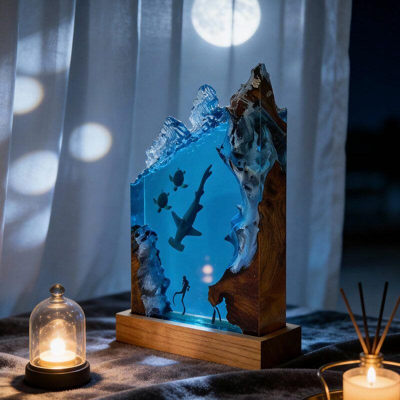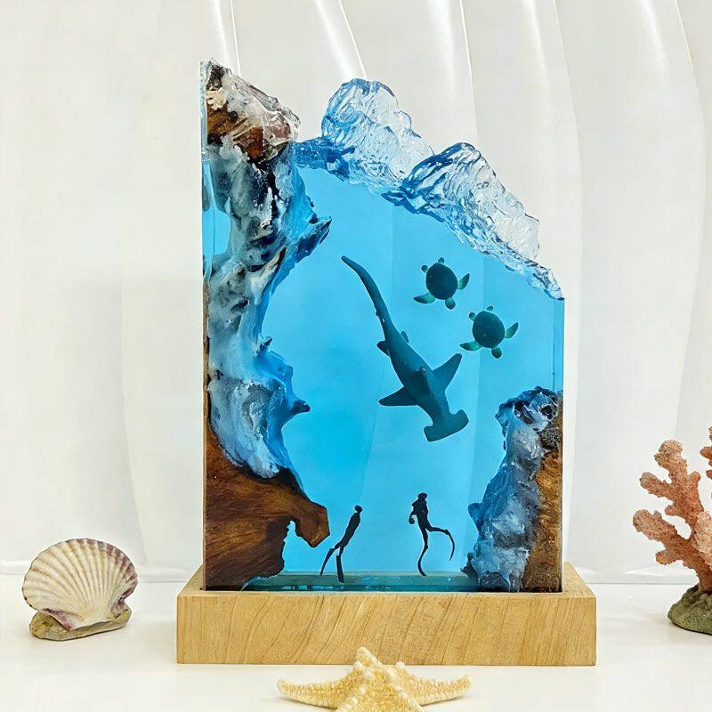 Every detail tells a marine story: the hammerhead glides through crystal-clear resin, its sleek form lifelike and fluid; sea turtles drift gently, their shells textured with artisanal precision; divers explore the “seabed” of smooth wood, their gear and posture crafted to evoke curiosity. The warm, soft glow illuminates the scene, turning any room into a tranquil underwater sanctuary.