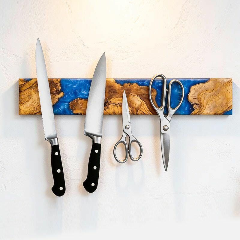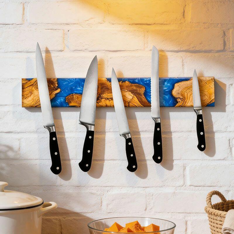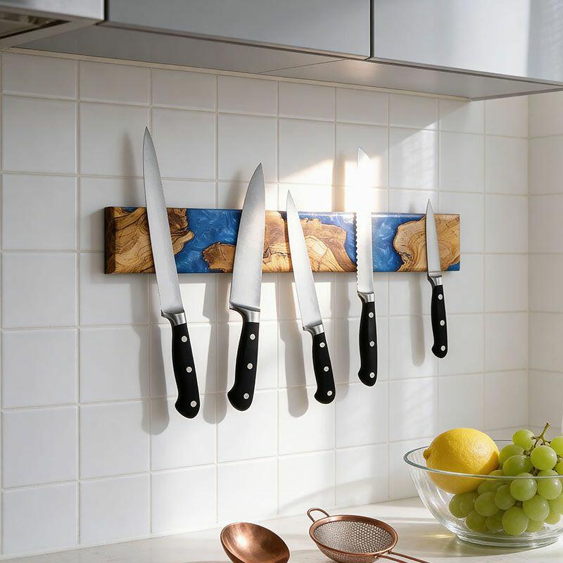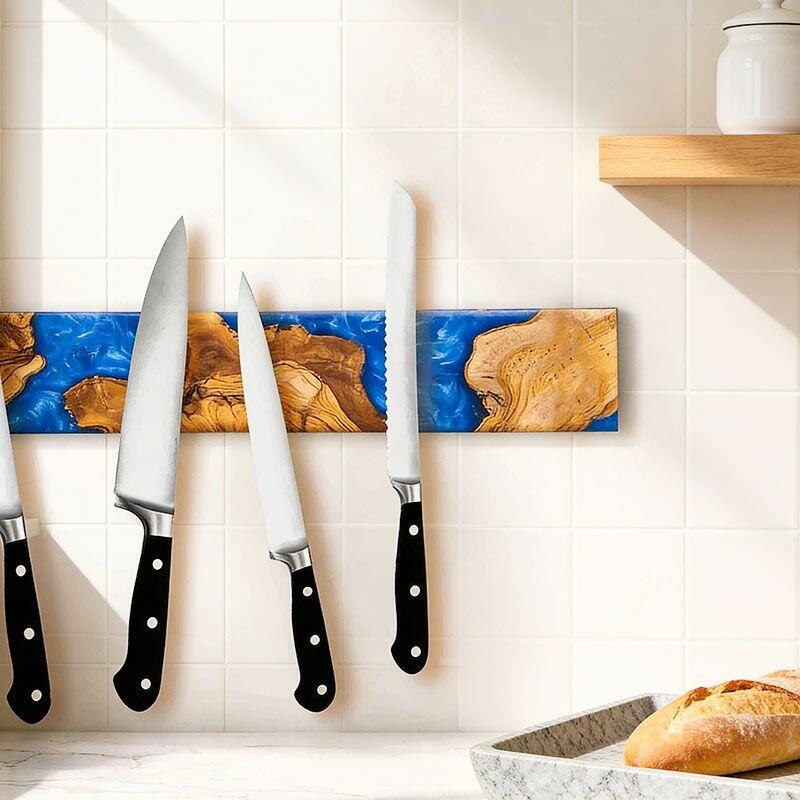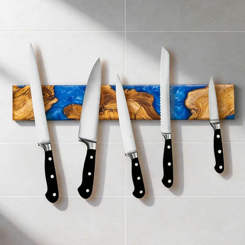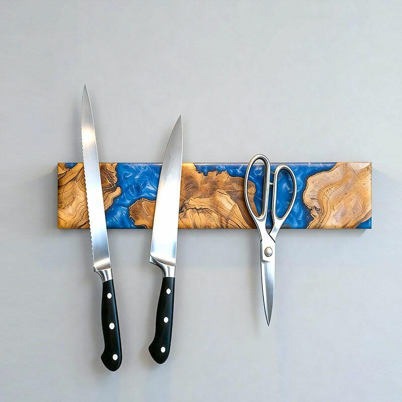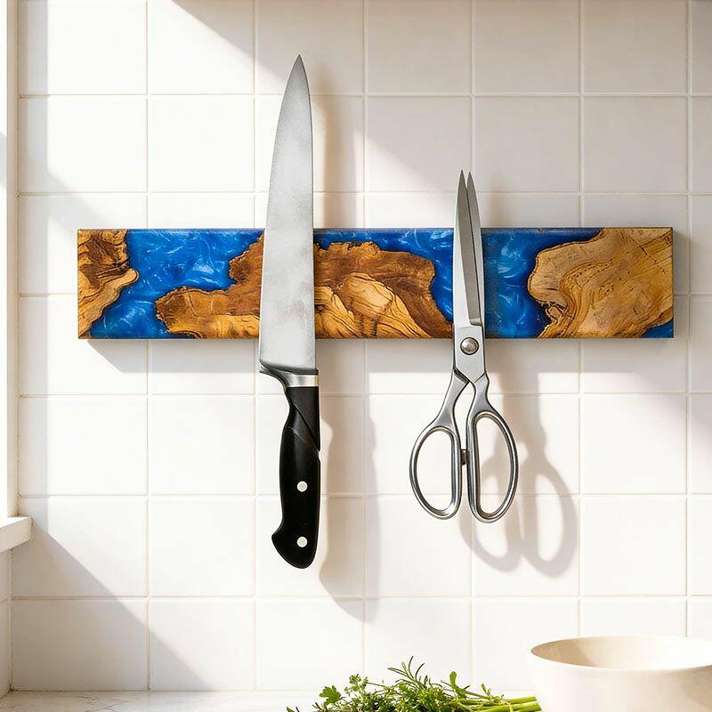 Elevate your kitchen with the Reslol Artisanal Swirled Blue Resin Wood Magnetic Knife Holder, where functionality meets handcrafted art. Made from eco-friendly resin and natural solid wood, this wall-mounted organizer features vibrant blue resin swirled through warm wood grain, creating a striking blend of color and texture that doubles as kitchen decor.