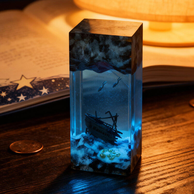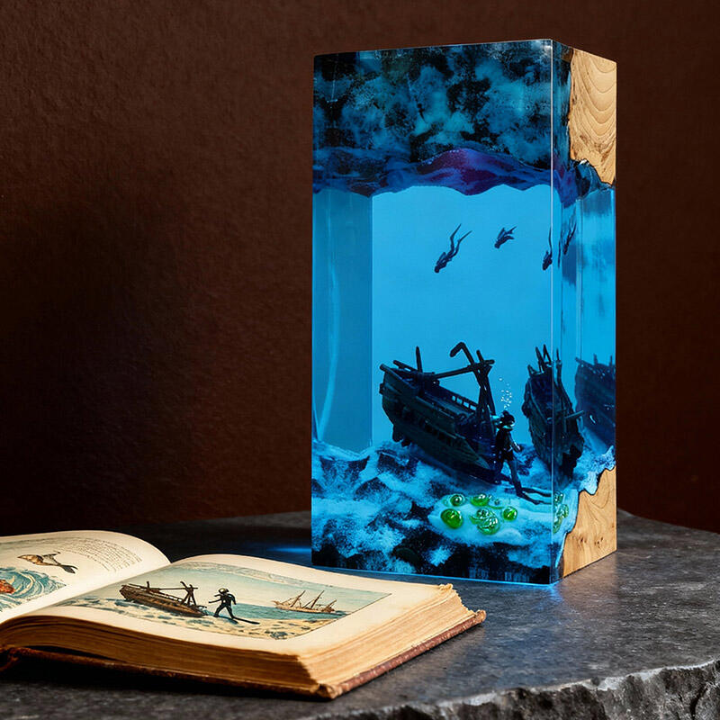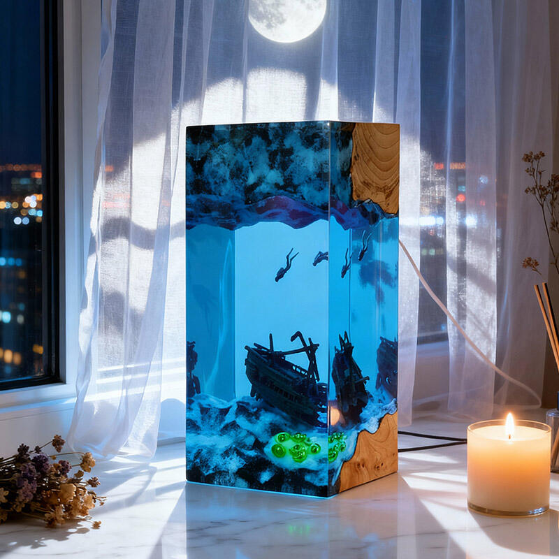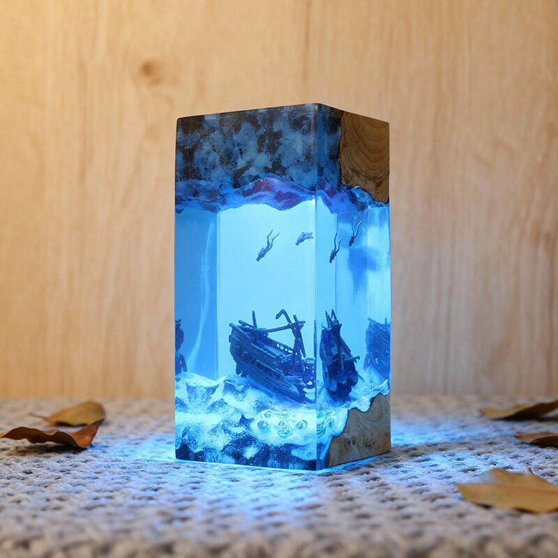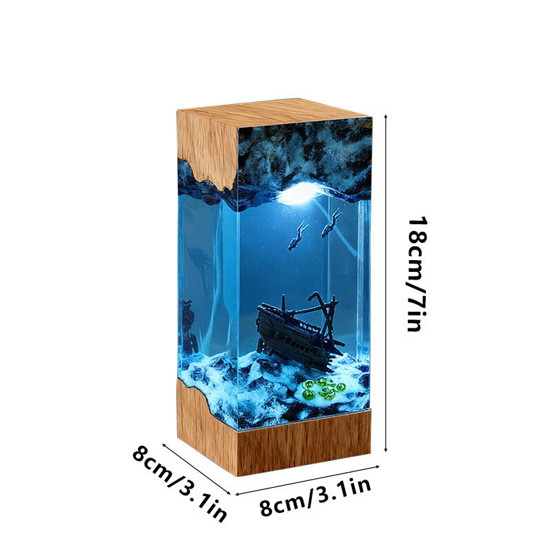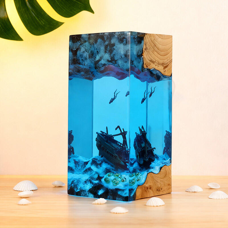 Dive into the allure of the deep sea with our rectangular resin lamp. This captivating piece features a detailed shipwreck and a determined diver, bringing the mystery of the underwater world right to your tabletop.