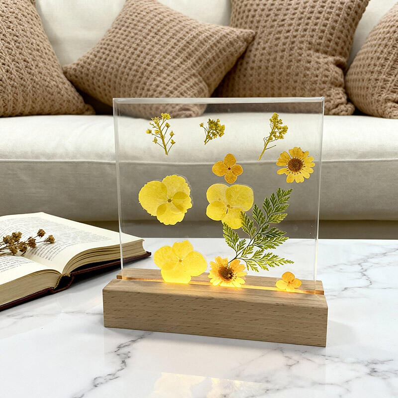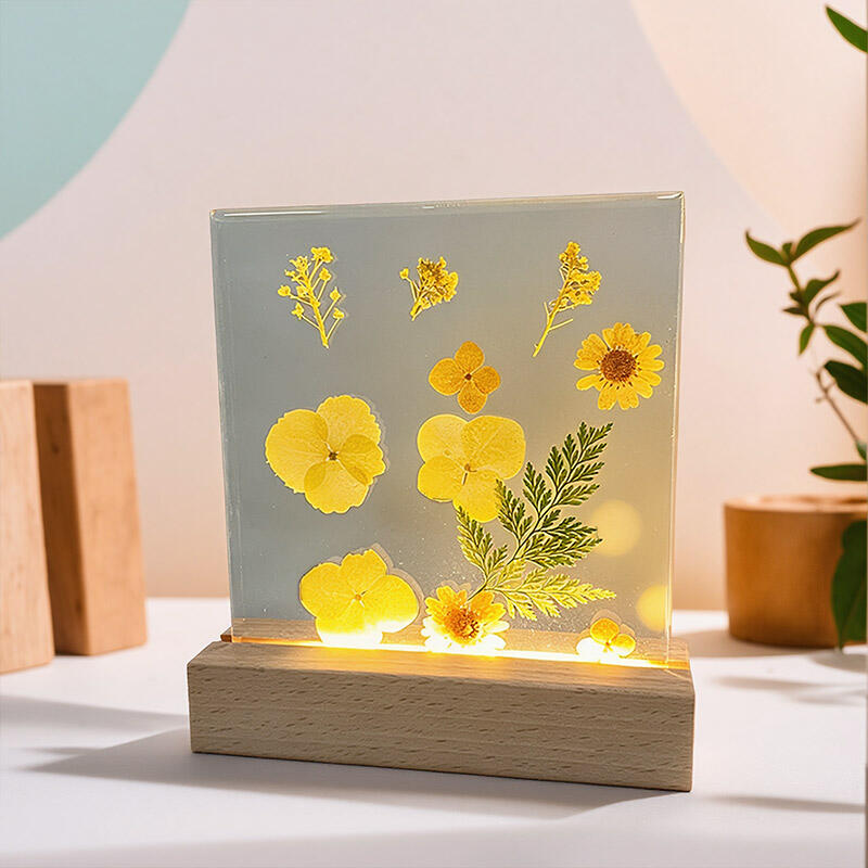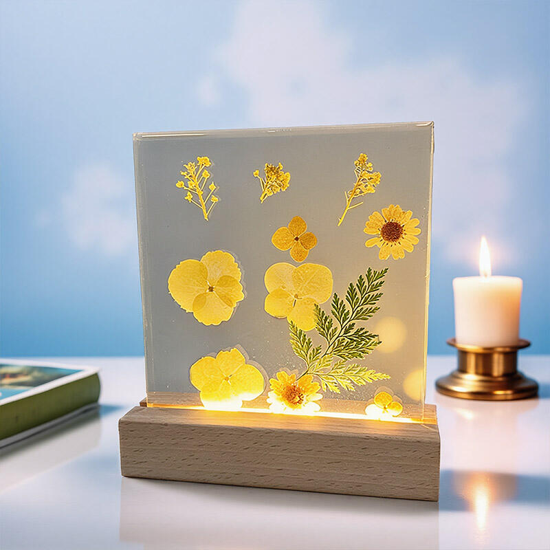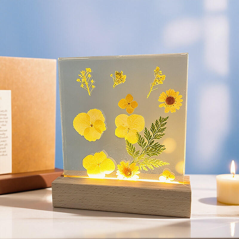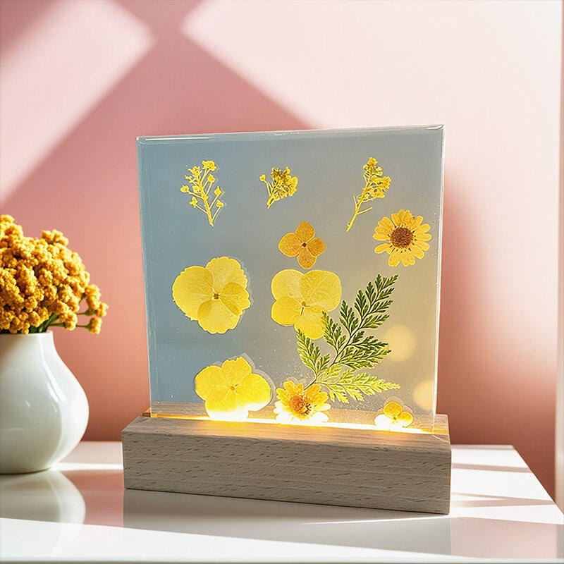 Reslol’s Artisanal Resin Square Night Light captures the warmth of sunlit yellow florals, encased in crystal-clear resin to preserve their fresh, vibrant beauty. The sleek square design, paired with a soft LED glow, illuminates the petals’ delicate details, casting a cozy, inviting ambiance in bedrooms, shelves, or living spaces.