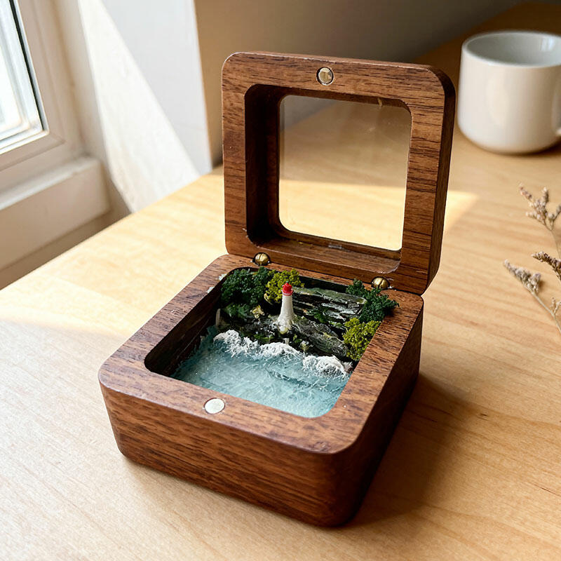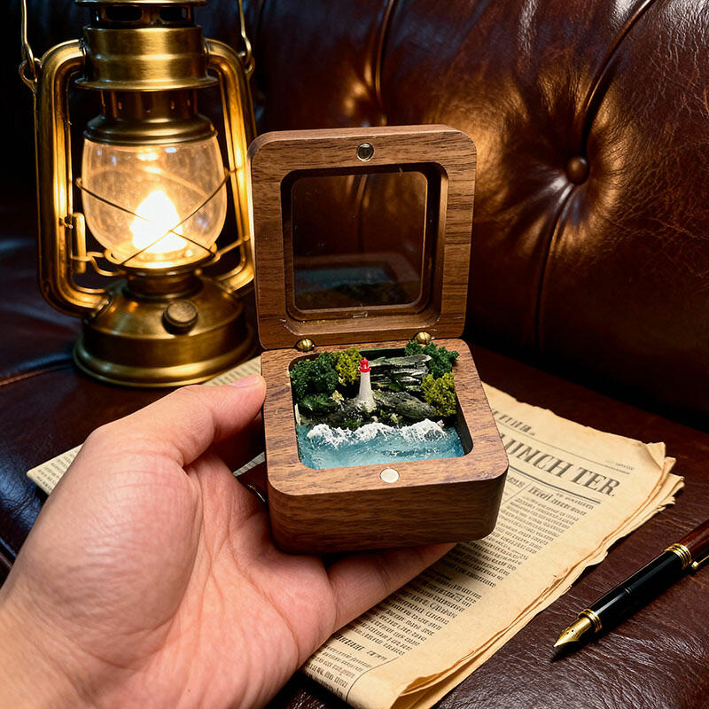 At its center: a meticulously crafted coastal scene. A weathered-texture resin lighthouse stands tall against a backdrop of glass-like resin waves, all anchored by a smooth black walnut base that adds natural warmth.