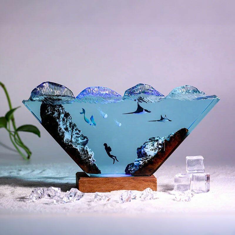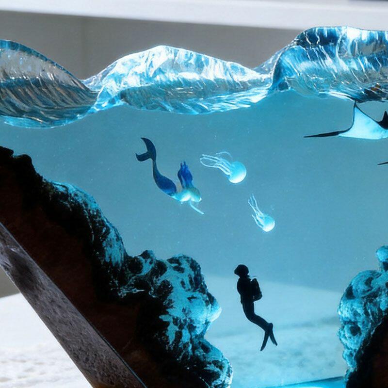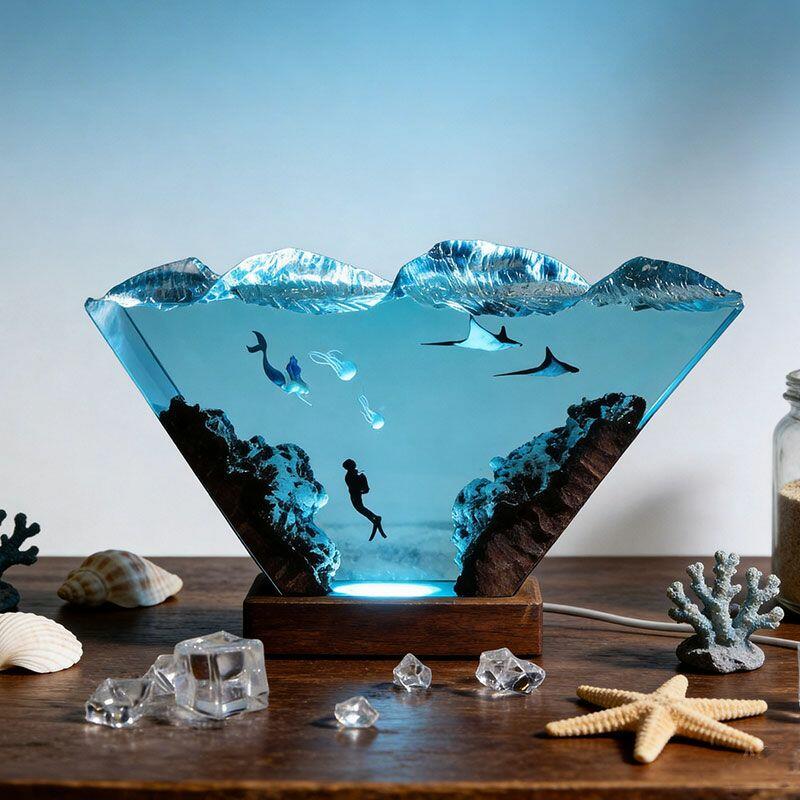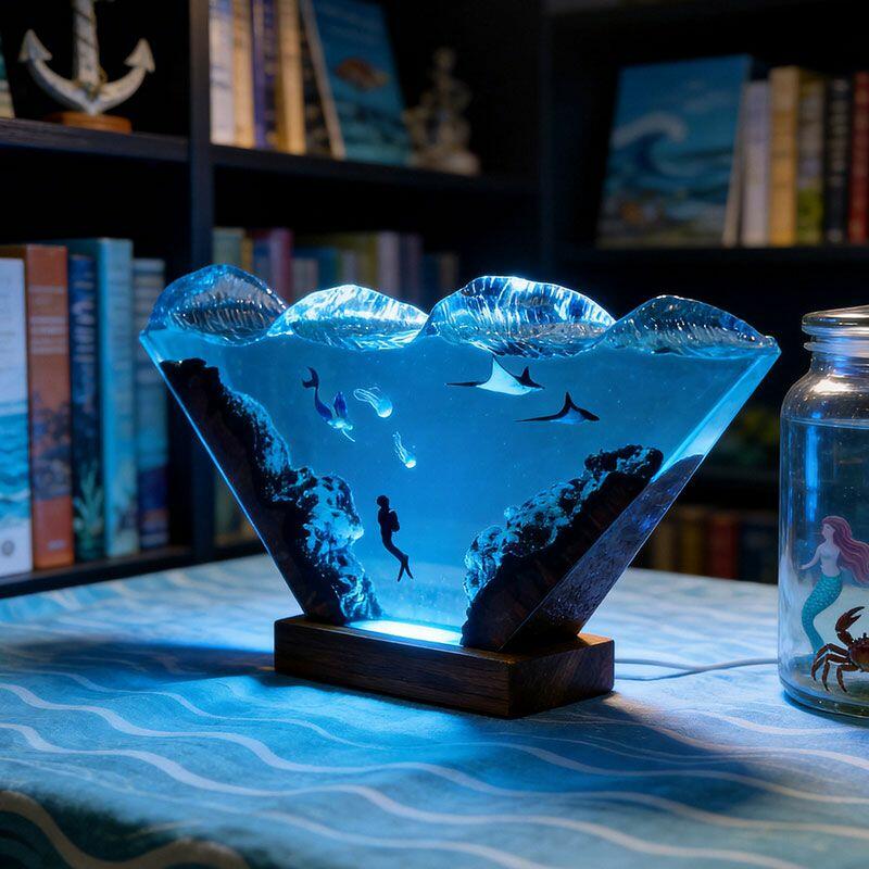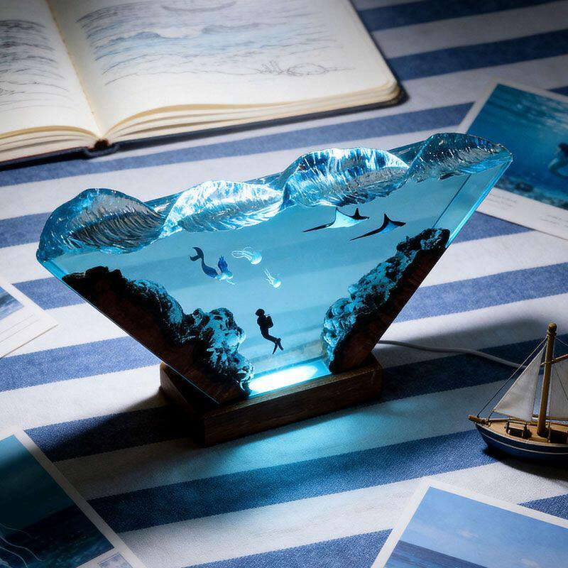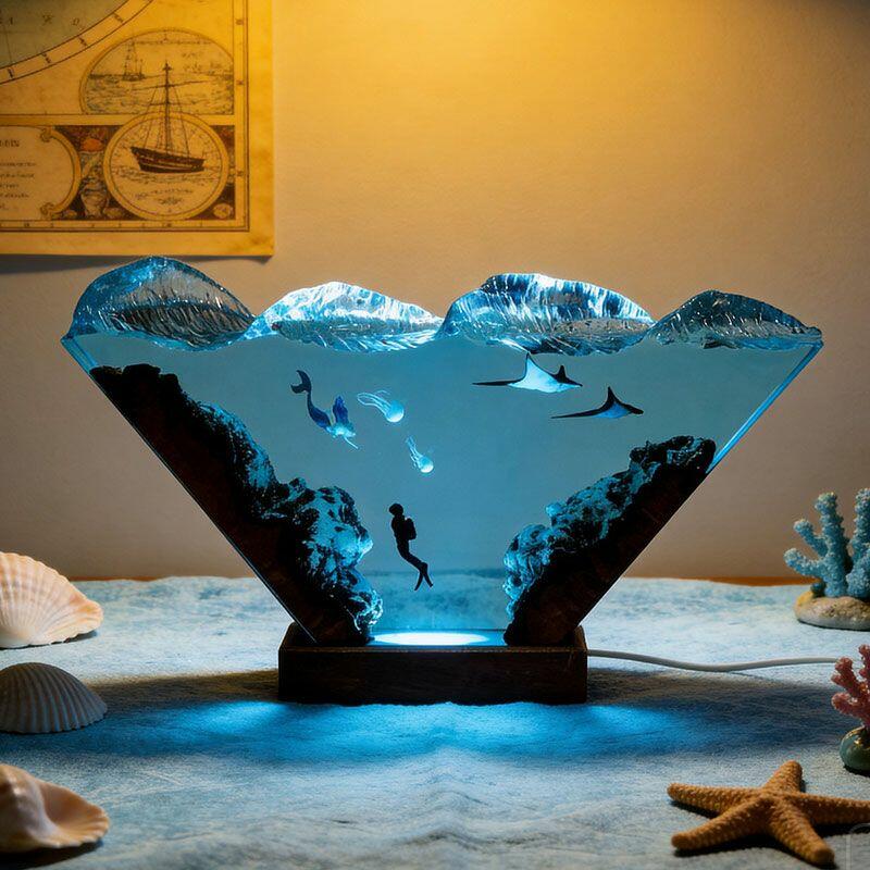 Nautical Mermaid & Diver Resin Lamp – Reslol Artisanal Wood Epoxy Decor Gift