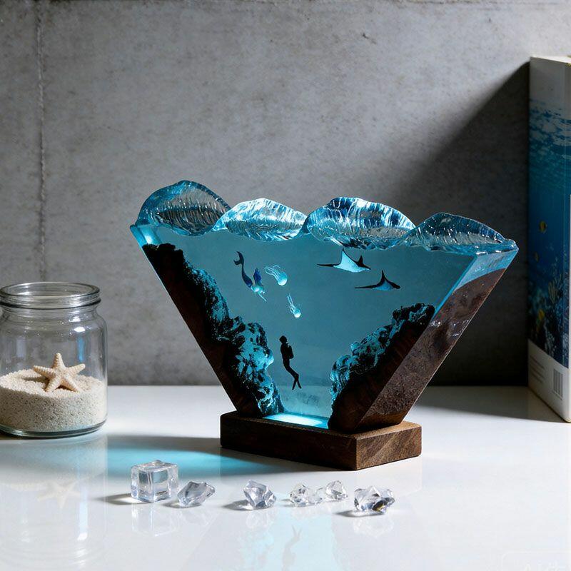 Dive into oceanic charm with Reslol’s Enchanting Mermaid & Diver Resin Lamp, where artisanal resin and reclaimed wood blend to craft a marine masterpiece. This irregularly shaped lamp captures the magic of the sea: a graceful mermaid glides alongside two divers, while two manta rays and delicate jellyfish dance in the translucent resin, all brought to life by warm, ambient light.