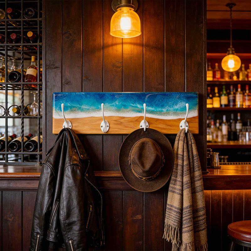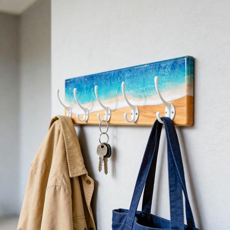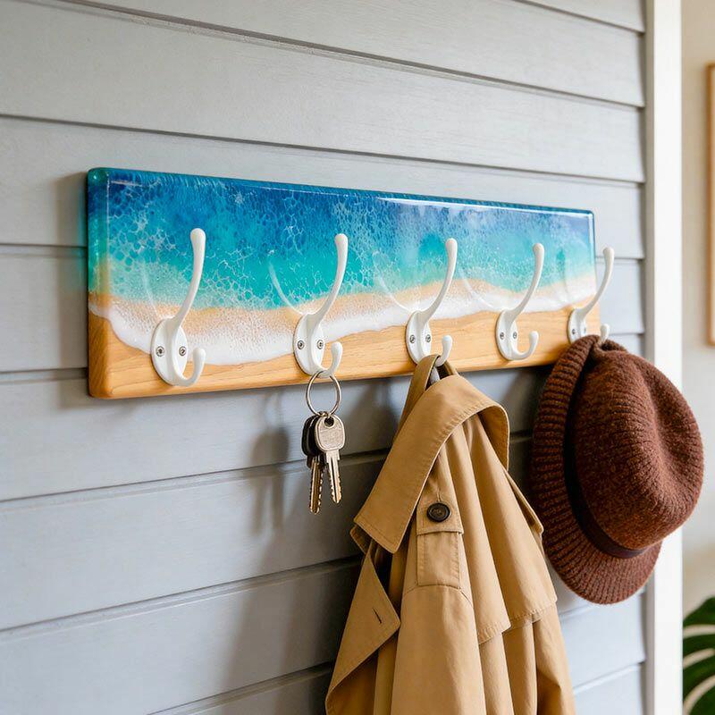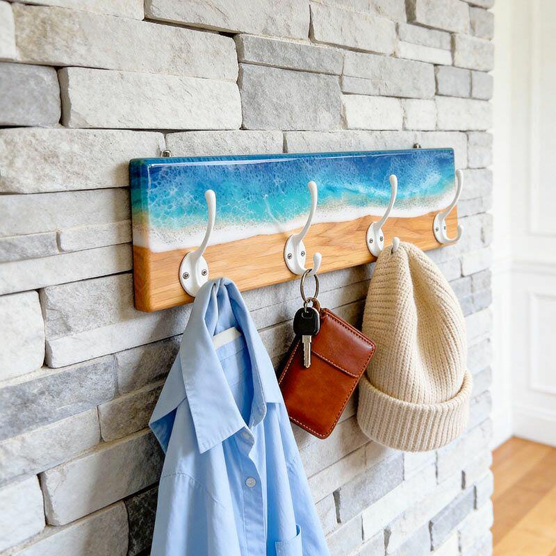 Dive into coastal charm with Reslol’s Ocean Series Wall-Mounted Coat & Key Rack—where swirling ocean-inspired resin merges with natural wood to mimic waves and sandy shores. This artisanal piece blends the raw beauty of wood with the glossy, fluid texture of resin, bringing a serene beach vibe to your home.