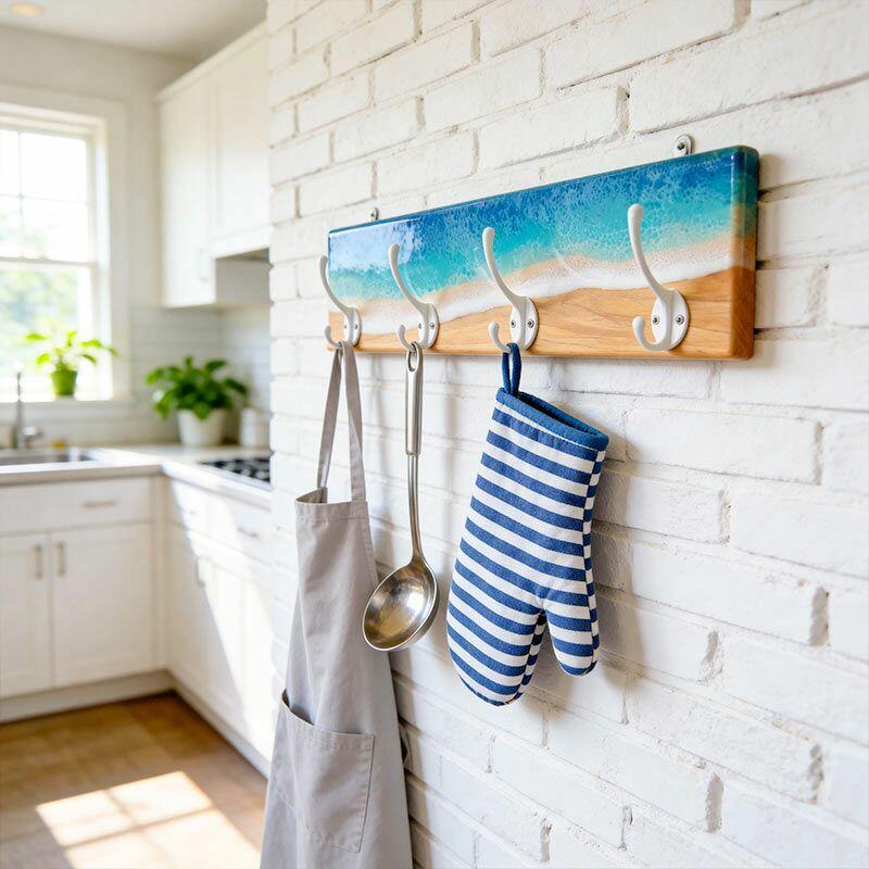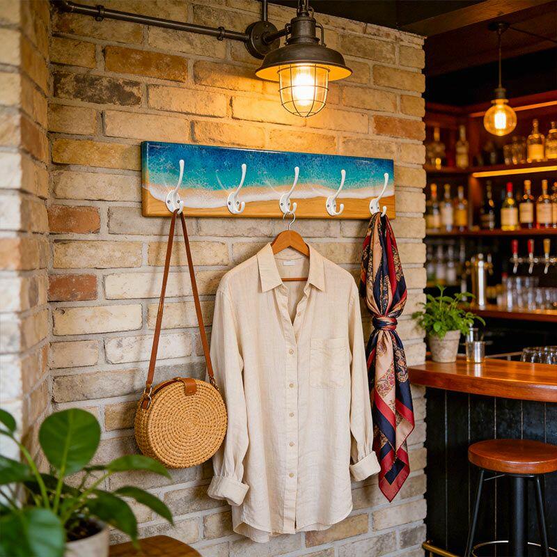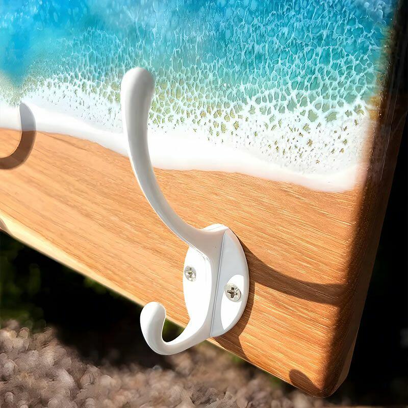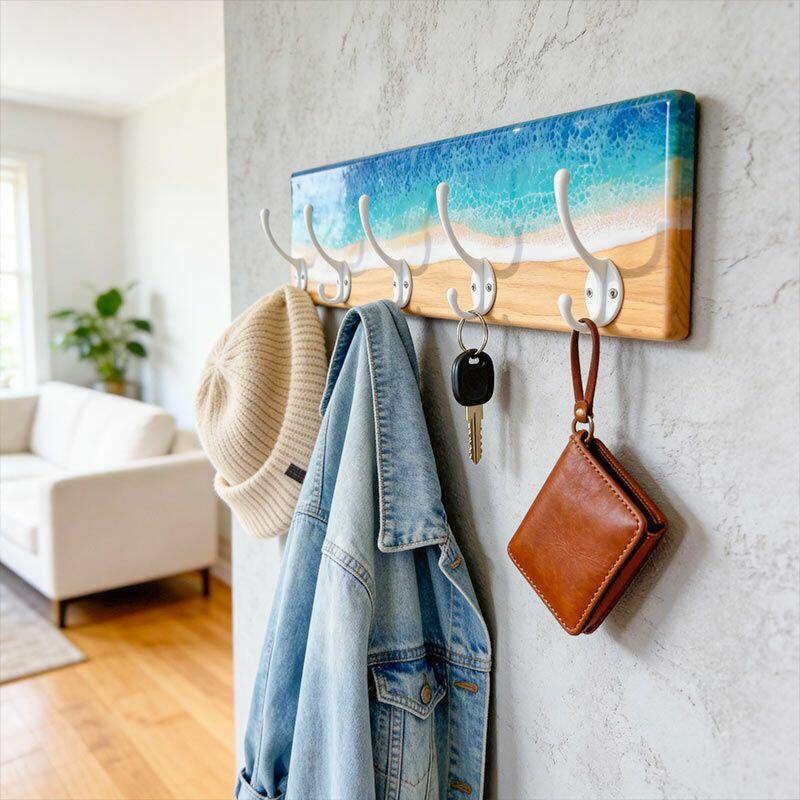 Available in multiple sizes, the hook quantity adjusts with size to fit small foyers or spacious corridors. Built for stability, it installs in minutes: two rear hooks secure firmly to walls with just two screws, making it a reliable storage solution for busy areas. Each piece is uniquely handcrafted, so slight variations in wood grain, resin wave patterns, or measurements may occur—part of its one-of-a-kind coastal allure. Original design, no infringement issues.
