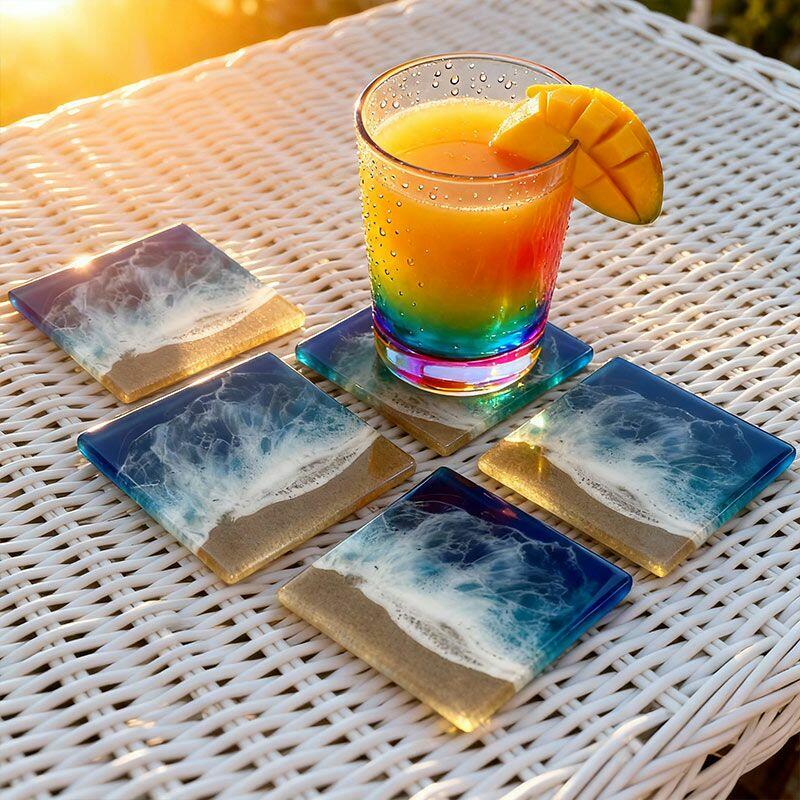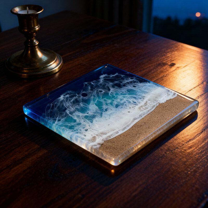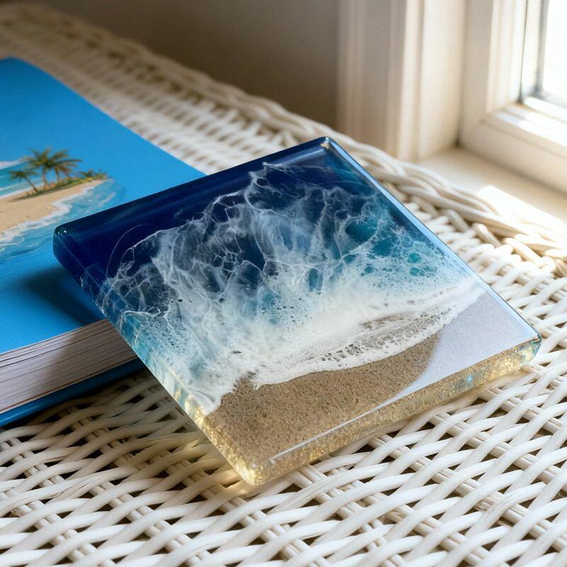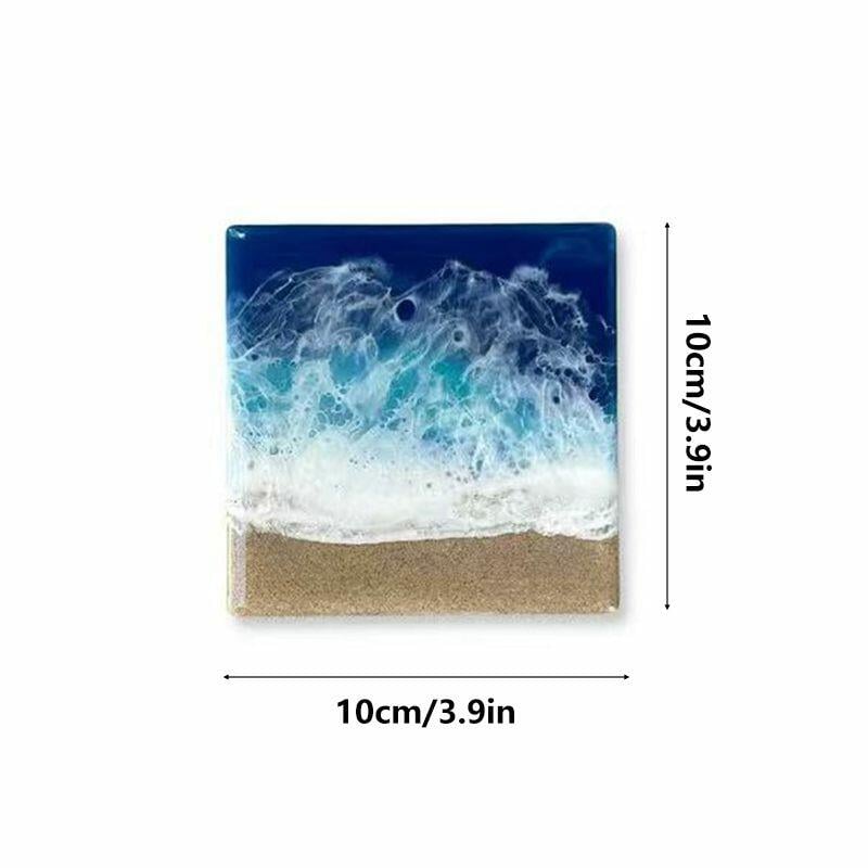 The intricate layers of translucent resin mimic the natural flow of waves, while embedded sand adds a touch of coastal charm. The square shape offers a modern aesthetic, perfect for complementing any home or office décor.