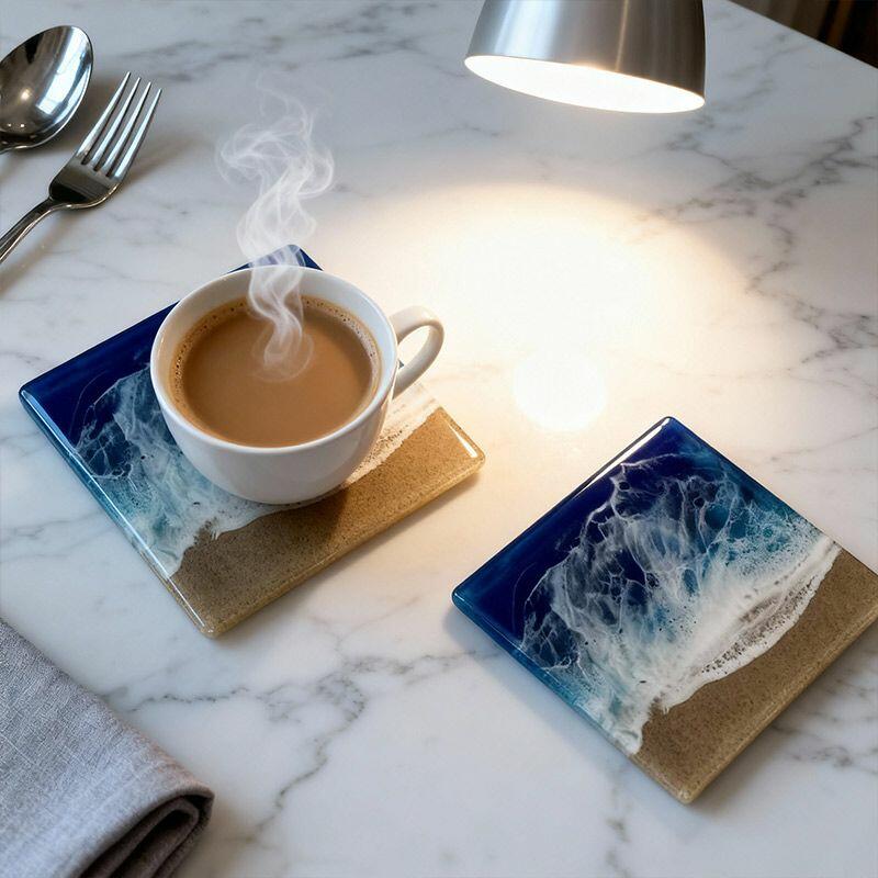 Ocean-Inspired Handcrafted Resin Coaster – Wave & Sand Square Art