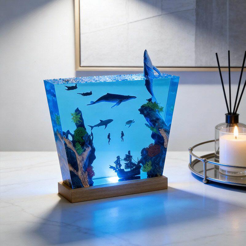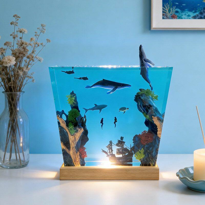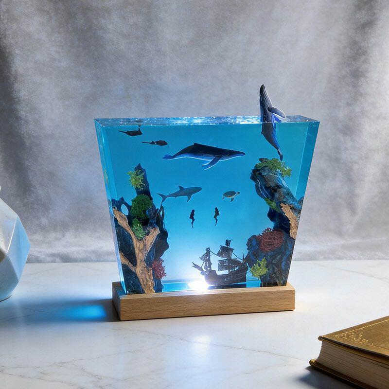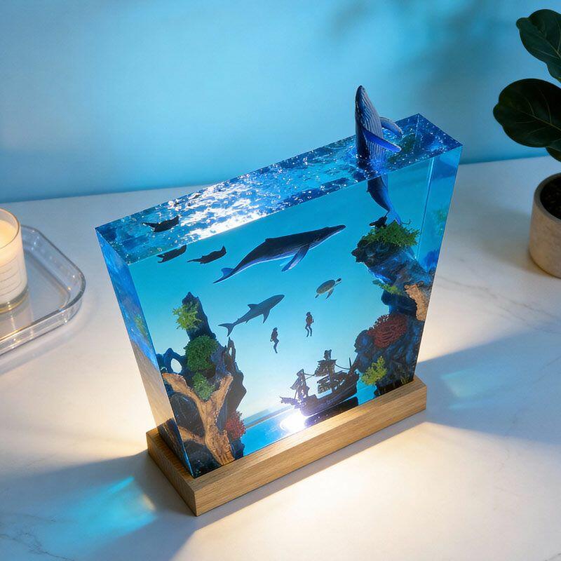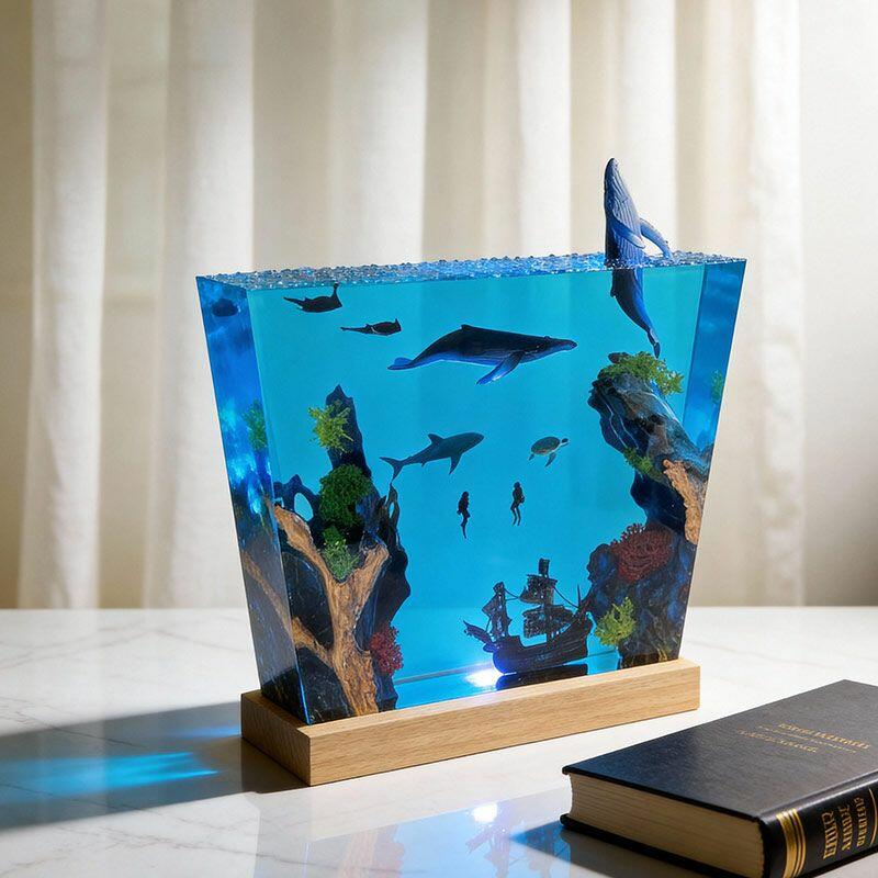 Witness the ocean’s dynamism: A humpback whale leaps from crystal-clear resin, its body arching in a dynamic leap, water droplets frozen mid-air; manta rays glide with graceful wingspans, their undersides textured to mimic natural patterns; a great white shark cruises nearby, its sleek silhouette and sharp fins exuding power; and a shipwreck rests on the “seabed” of smooth wood, its weathered planks and rusted details evoking maritime mystery. The lamp’s warm glow illuminates every nuance, turning your space into a vivid underwater theater.