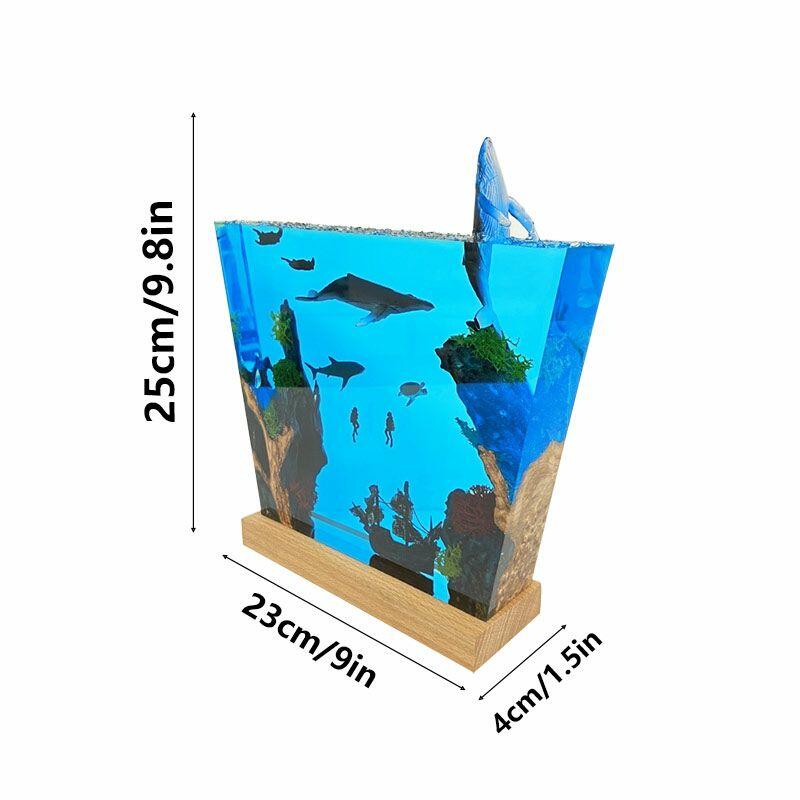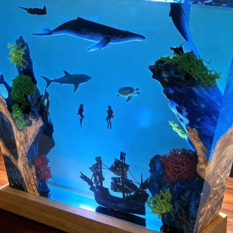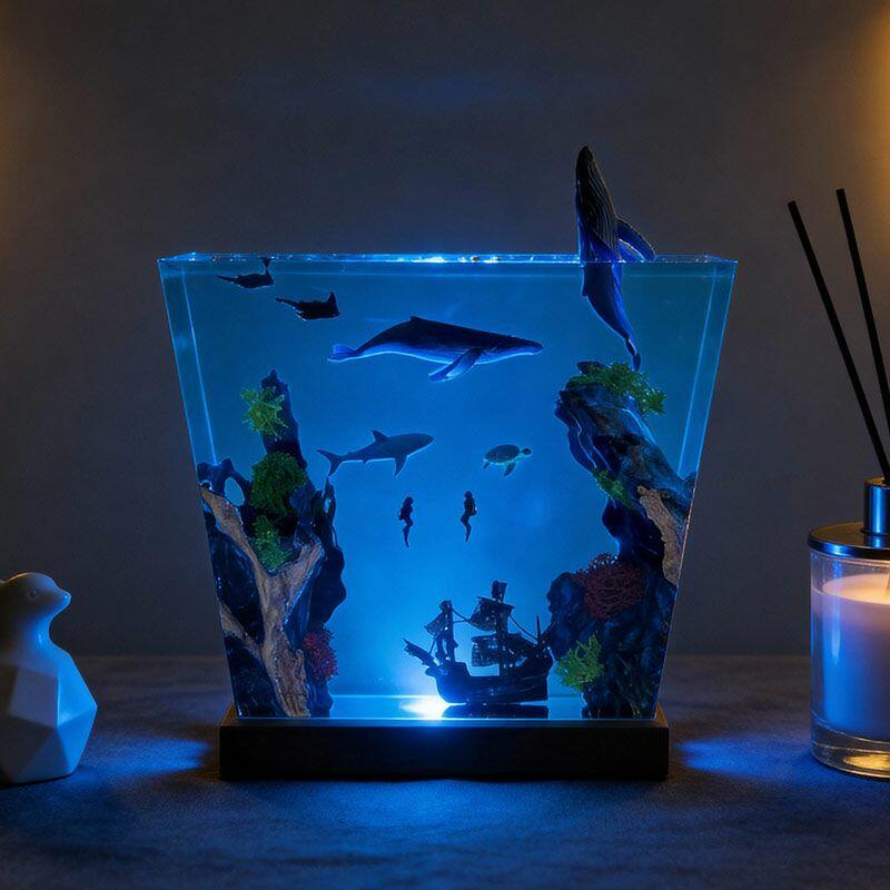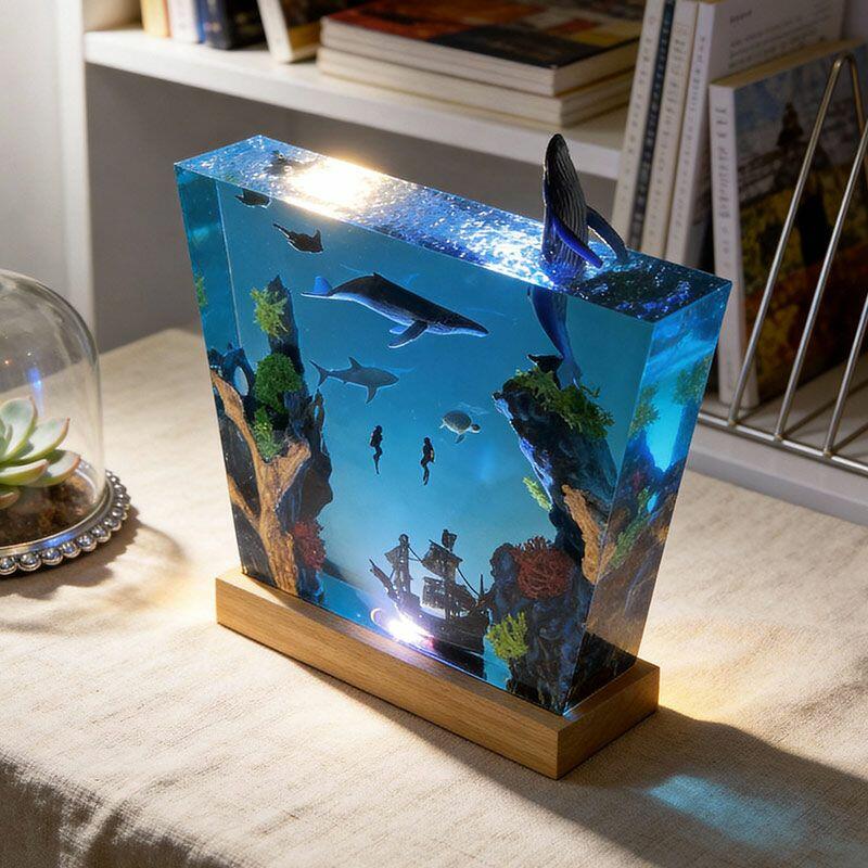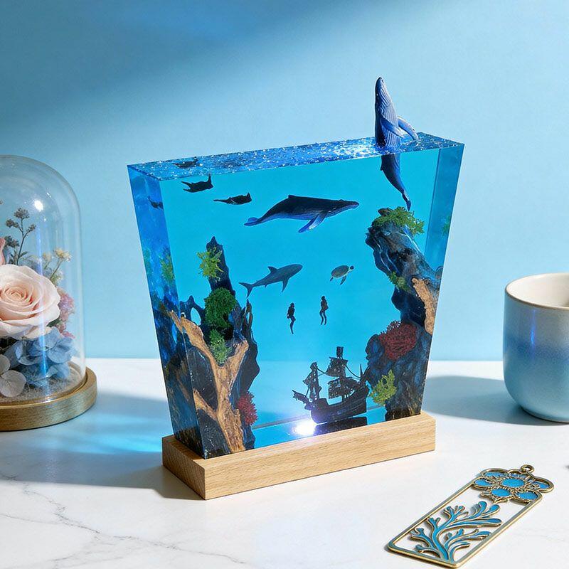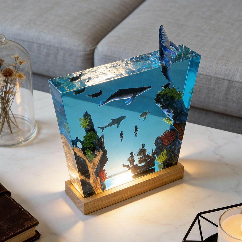 Witness the ocean’s dynamism: A humpback whale leaps from crystal-clear resin, its body arching in a dynamic leap, water droplets frozen mid-air; manta rays glide with graceful wingspans, their undersides textured to mimic natural patterns; a great white shark cruises nearby, its sleek silhouette and sharp fins exuding power; and a shipwreck rests on the “seabed” of smooth wood, its weathered planks and rusted details evoking maritime mystery. The lamp’s warm glow illuminates every nuance, turning your space into a vivid underwater theater.