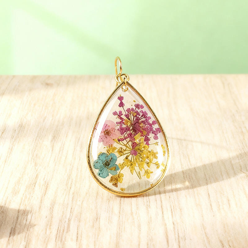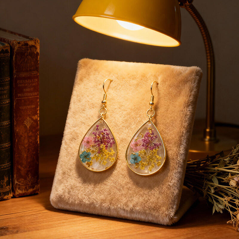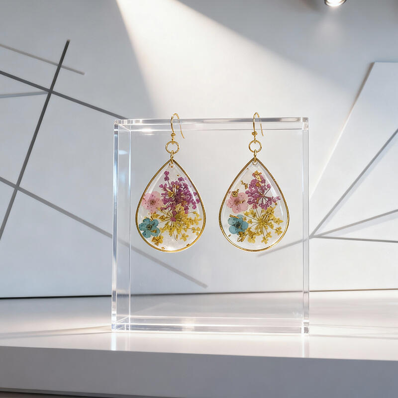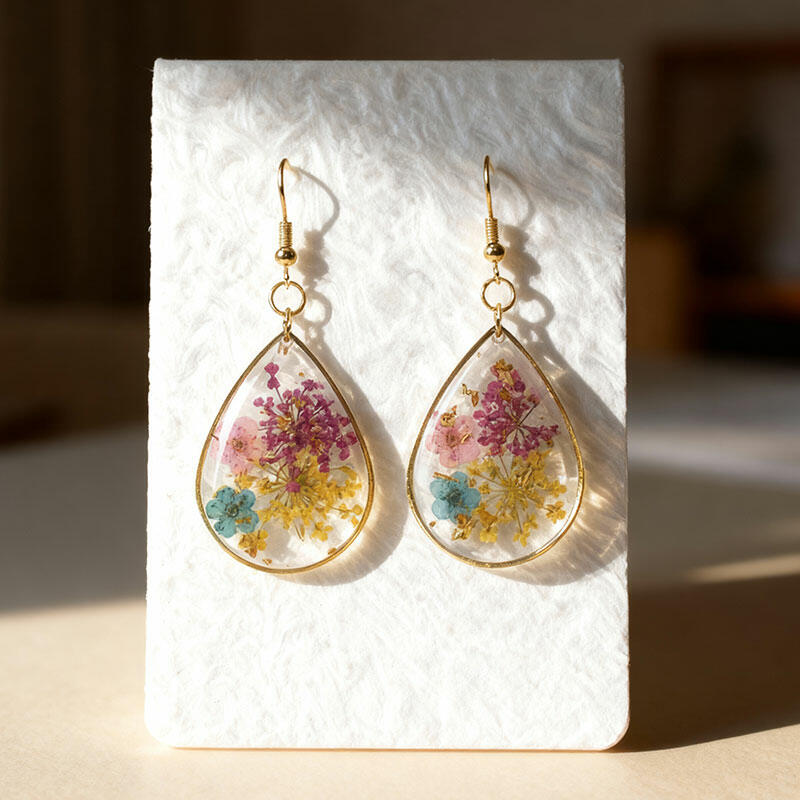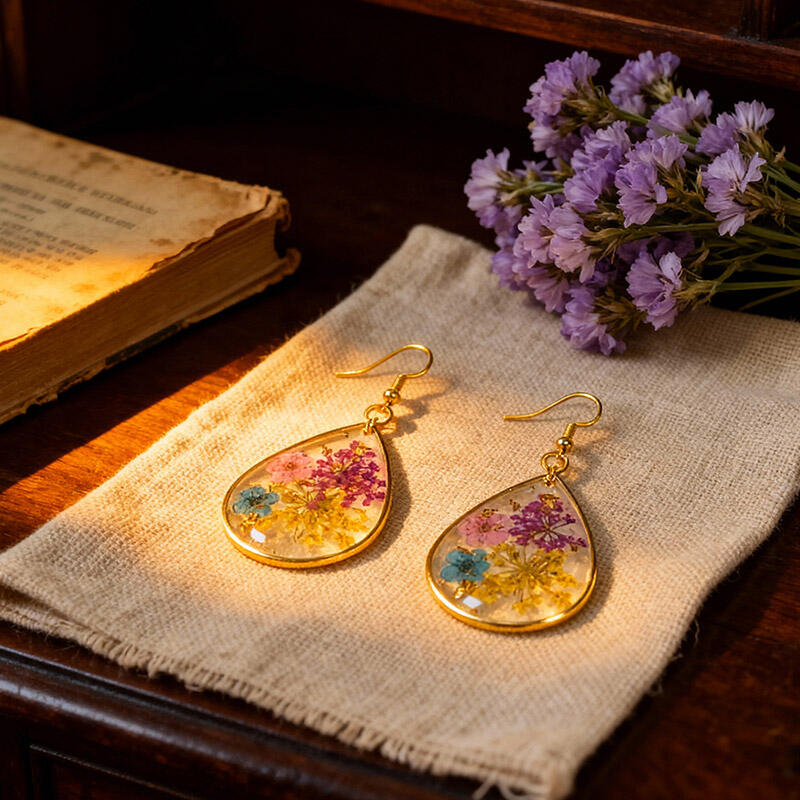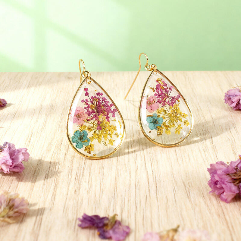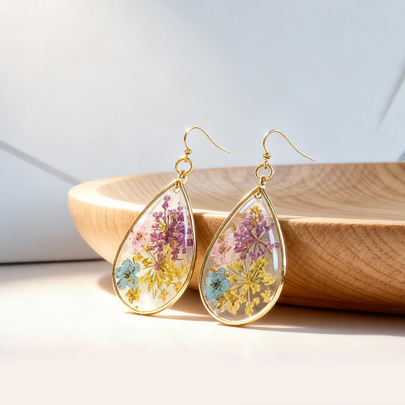 Each pair is carefully crafted with real dried flowers encased in high-quality resin for durability and a glossy finish. The shimmering gold foil adds a luxurious touch, making these earrings perfect for both casual and formal occasions.
