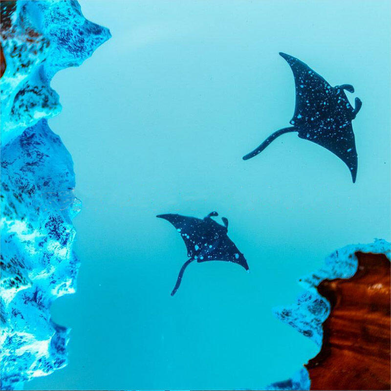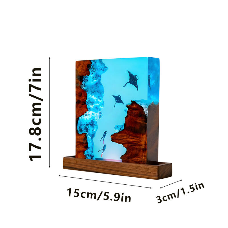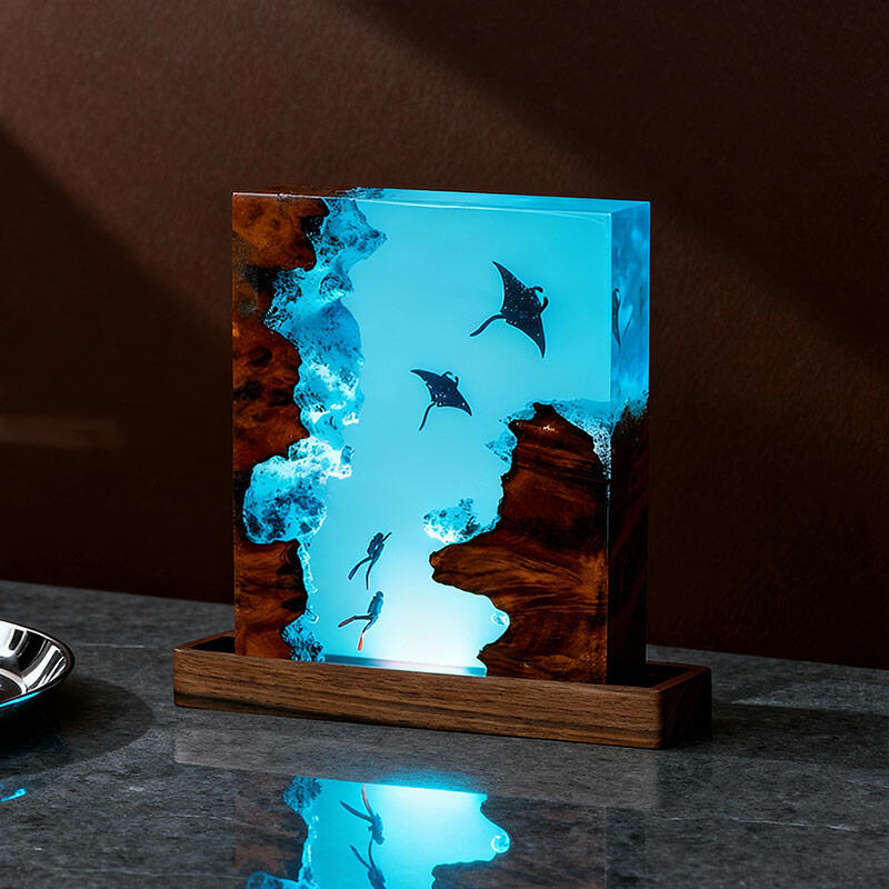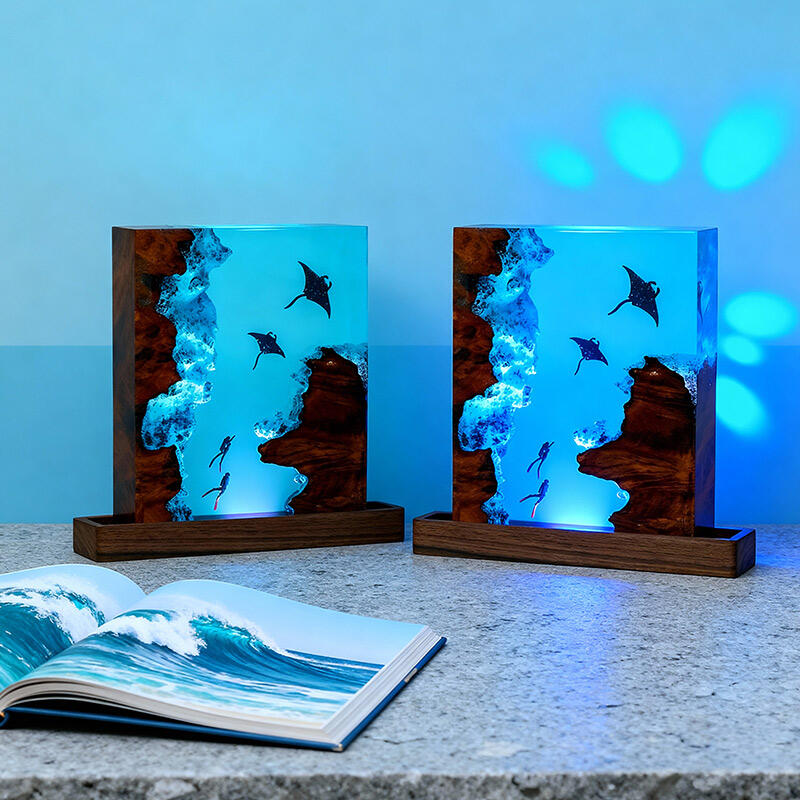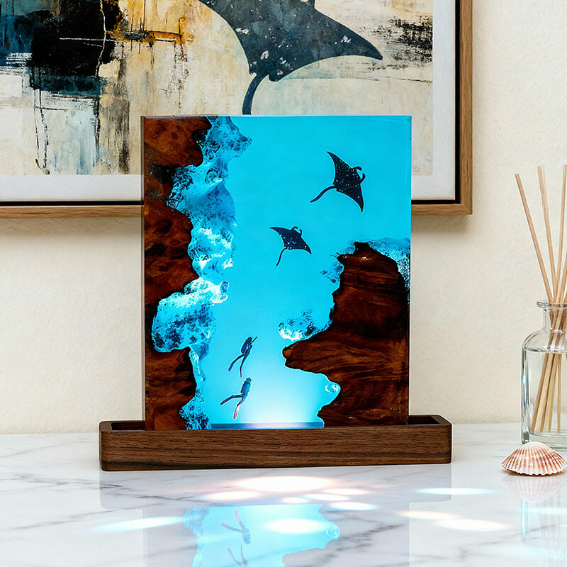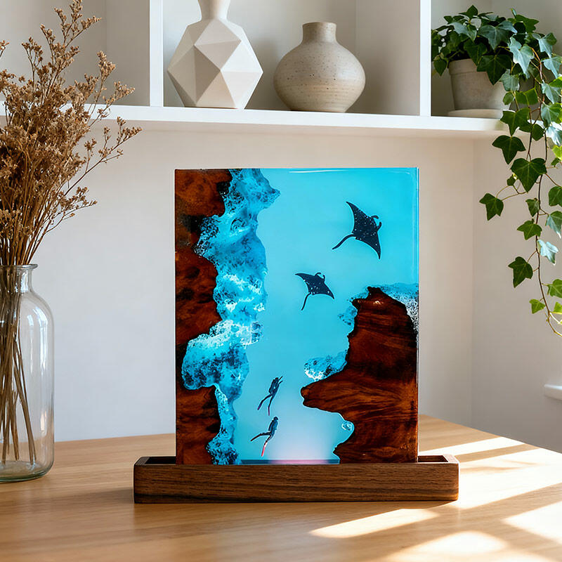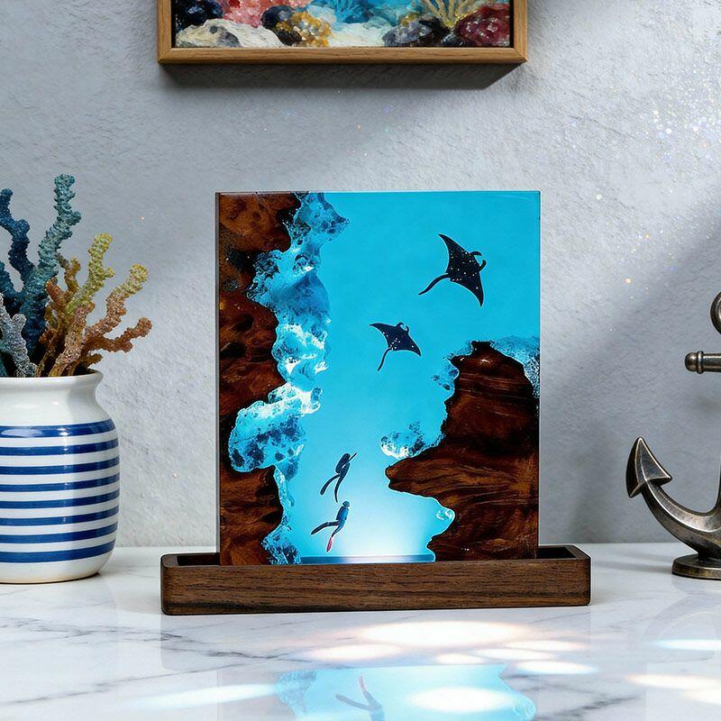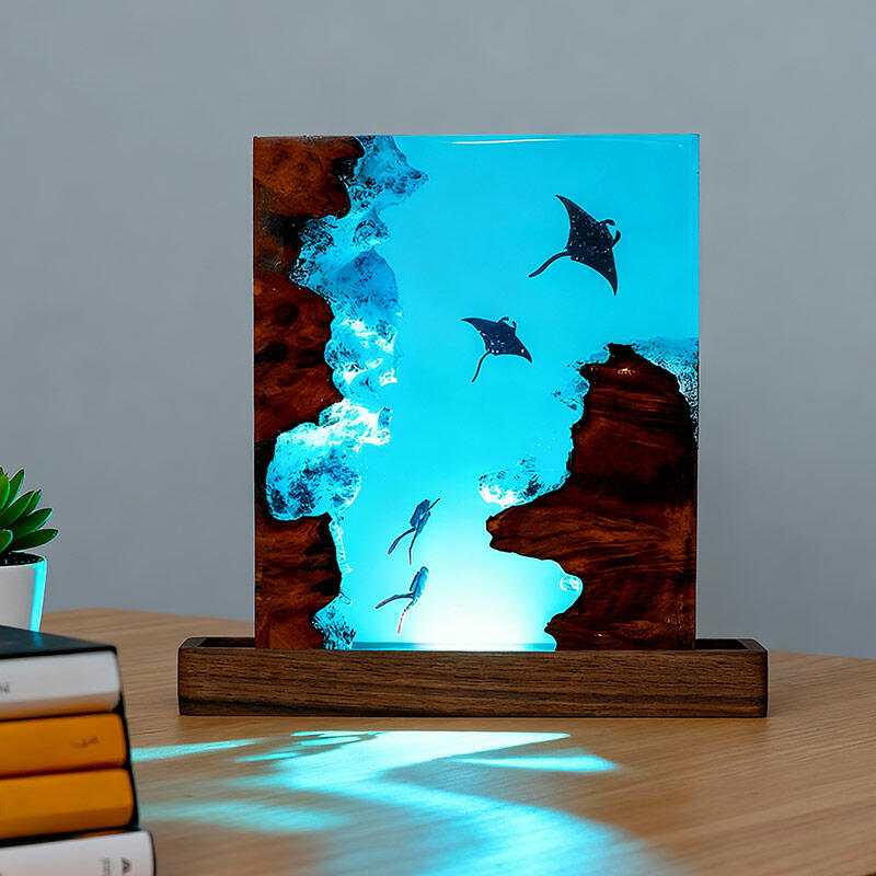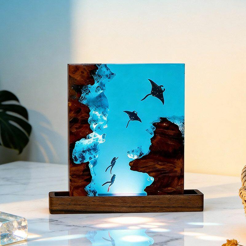Handmade Resin Table Lamp – Bring the ocean’s magic into your home with this stunning square resin lamp, featuring a lifelike manta ray and diver suspended in artistic detail. Perfect as a bedside night light, desk decor, or coastal-themed room accent, this lamp casts a soothing glow for a serene ambiance.